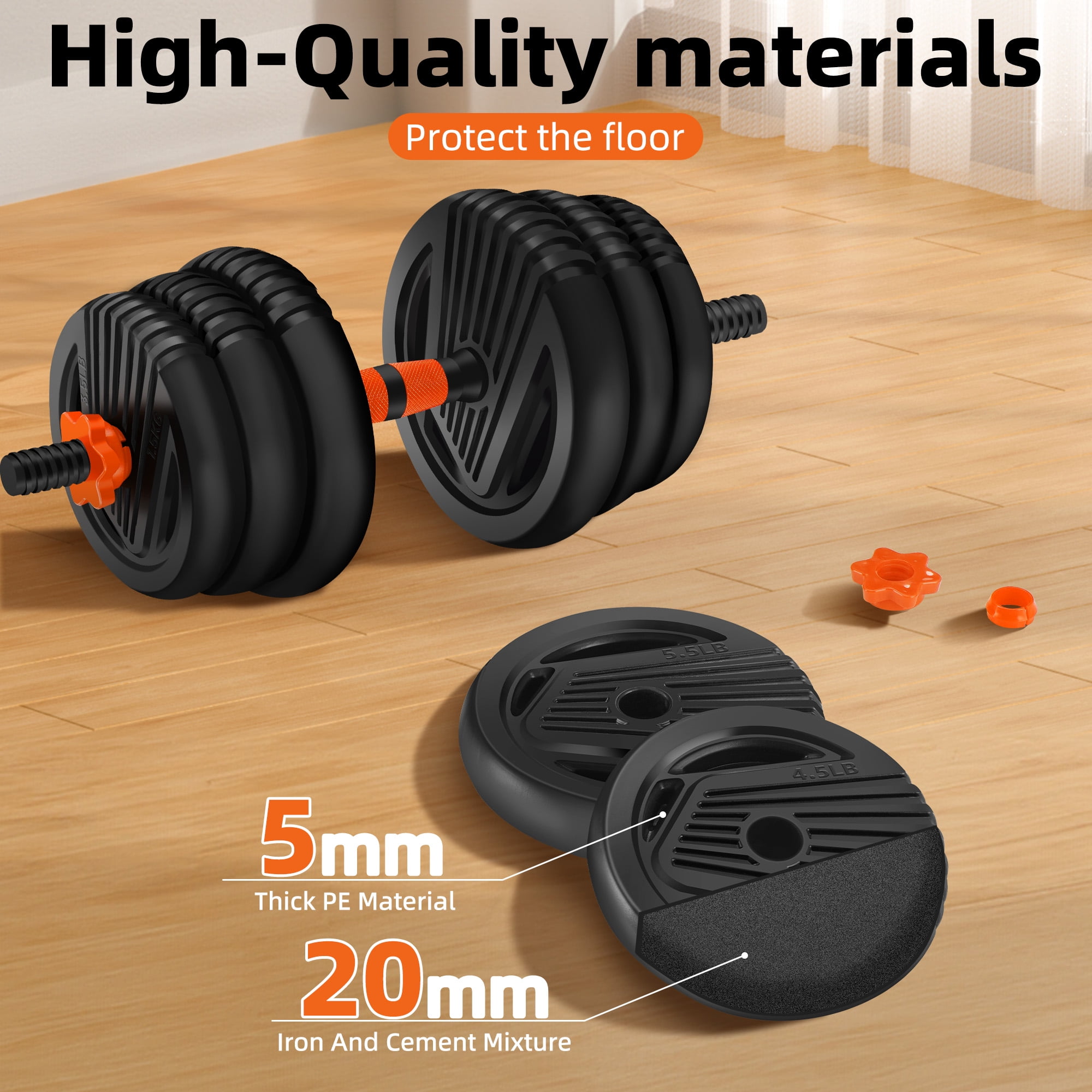 Versatile: Converts into dumbbells, a barbell, kettlebells, and push-up stands for a full-body workout Durable: Made with eco-friendly PE materials and a cement/iron sand core for long-lasting use Comfortable: Features non-slip grips and a foam-padded bar for a more comfortable workout Adjustable: Easily customize weights for various fitness levels and goals Space-Saving: Compact design perfect for small spaces, easily stored and set up