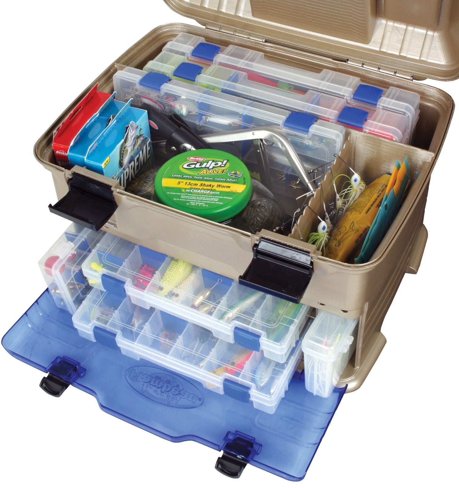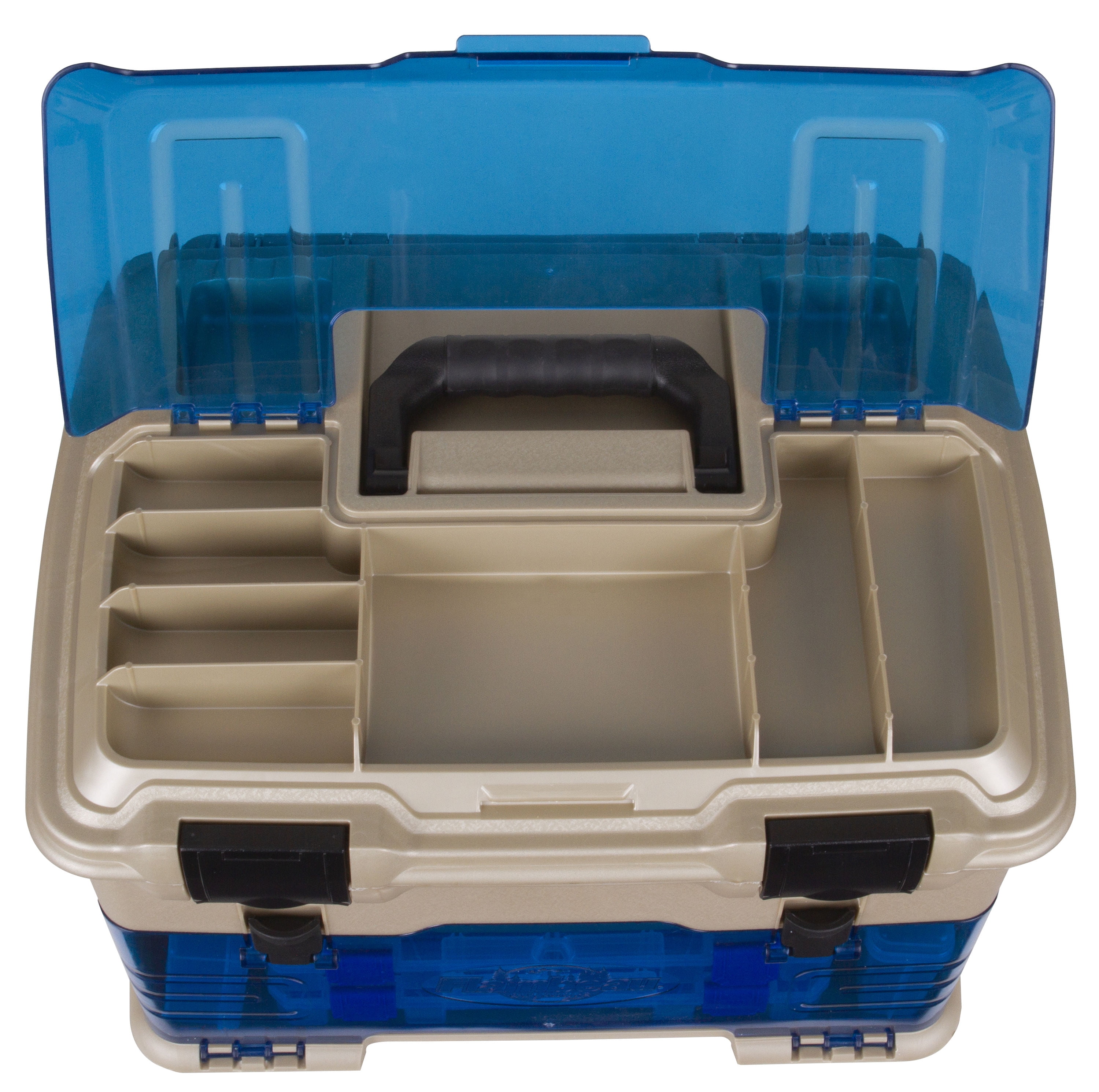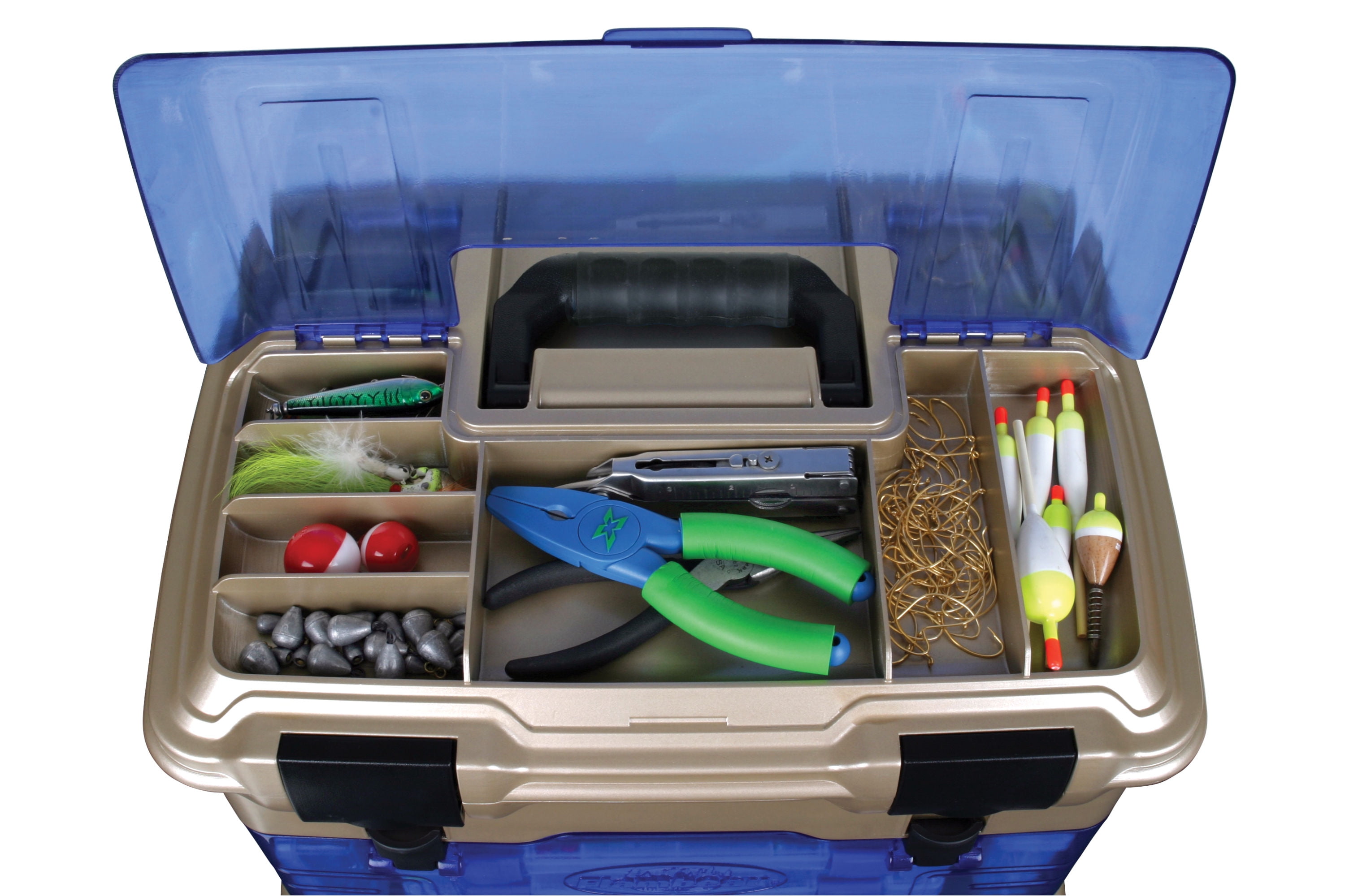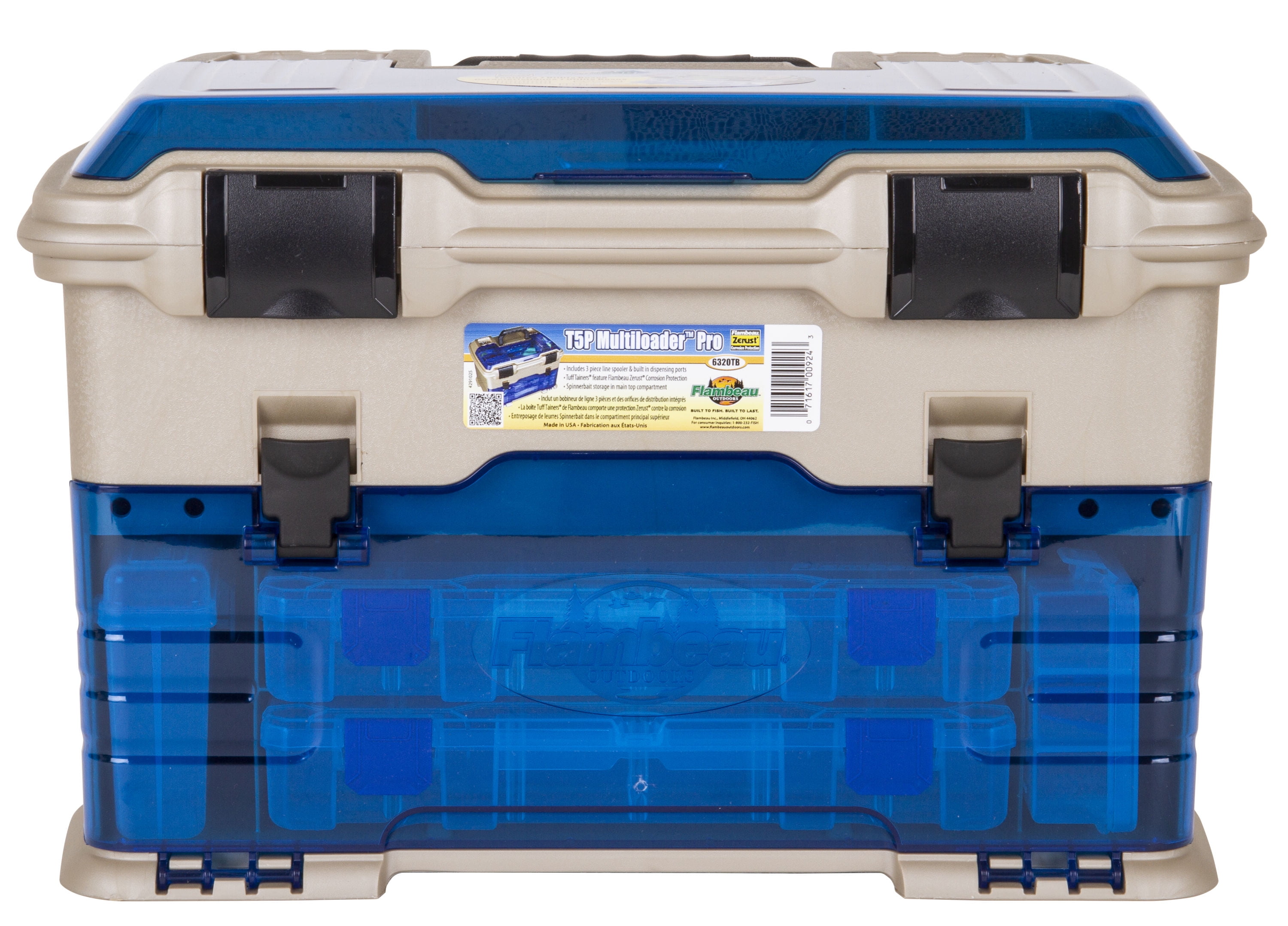 Flambeau T5 Multiloader Pro Tackle Storage: Flip-top lid yields quick access to 7 tackle storage compartments Soft-touch molded handle for comfortable carrying Includes 6 unique line dispensing ports Spinner bait storage in main top compartment Easy view, impact-resistant lid and front access doors 6 Tuff Tainers with patented Zerust VCI dividers to protect against rust and corrosion; 1 spinner bait box Open storage can hold the most popular liquid filled bait containers Flambeau tackle box keeps your fishing supplies in order Flambeau T5 multiloader tackle box is