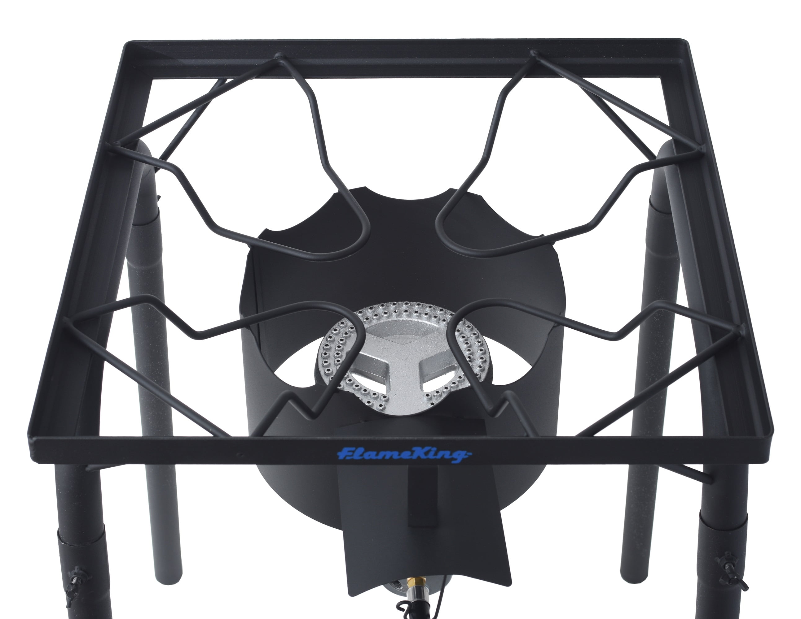 The Flame King Heavy Duty 100,000 BTU Single Burner Stove is a reliable solution for your outdoor cooking needs. Whether you’re camping, tailgating, or preparing for an emergency situation, this portable gas stove is built to perform. It’s ideal for turkey frying, home brewing, maple syrup preparation, or any other heavy-duty cooking task. Made from sturdy cast iron, the durable design ensures the single burner camp stove will last through many years of use. The gas regulating knob gives you precise control over the flame size, while the air supply regulator ring helps you achieve an even blue flame for efficient cooking. With its easy setup and included 4’ hose and regulator, this single burner propane stove connects seamlessly to any standard BBQ propane tank. Ideal for cooking in extreme conditions or as a backup during power outages, the Flame King 100K BTU portable gas stove is your outdoor companion. Please note the 20 lb propane tank is not included.