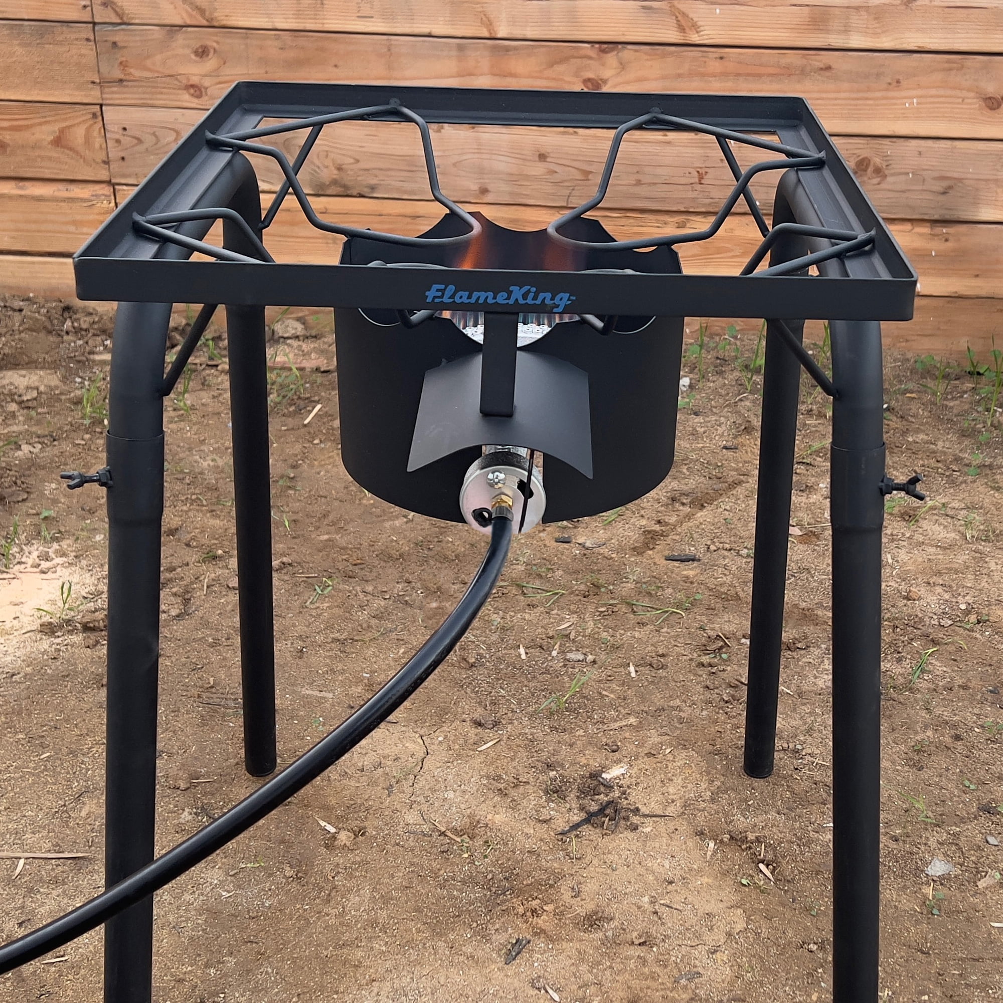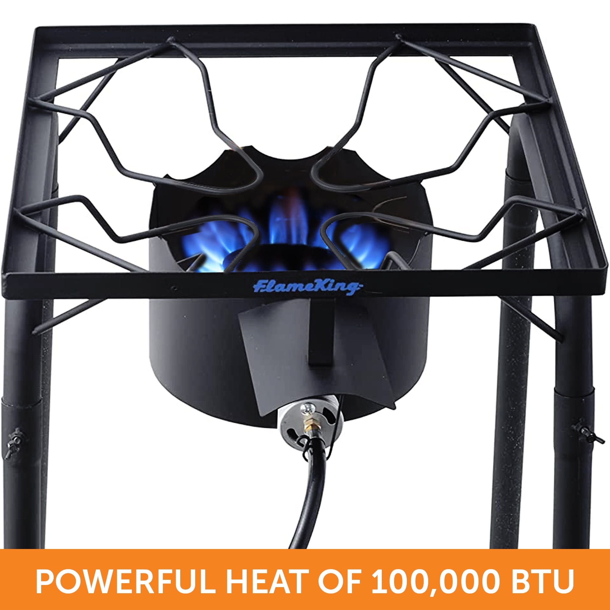 High Heat Output: This single burner propane stove delivers 100,000 BTU of heat, allowing you to cook any dish, from turkey frying to Cajun cooking. It’s also ideal for home brewing and preparing maple syrup. Outdoor Cooking Companion: Lightweight and portable, this propane camp stove is ideal for camping, tailgating, or emergency power outages, giving you a reliable heat source wherever you need it most. Blue Flame Precision: The air supply regulator ring helps achieve a steady blue flame, while the gas regulating knob allows you to adjust the flame size with ease for optimal cooking results. Sturdy Cast Iron Construction: Built to last, this rugged outdoor cooking stove is made from heavy-duty cast iron and can withstand tough outdoor environments, ensuring years of reliable use. Includes Regulator and Hose: This portable gas stove comes with a 0-20 PSI pressure regulator and a 4’ hose, making it compatible with BBQ propane tanks (QCC1 Type-1 Valve). Please note that the Flame King 20 lb tank is not included.