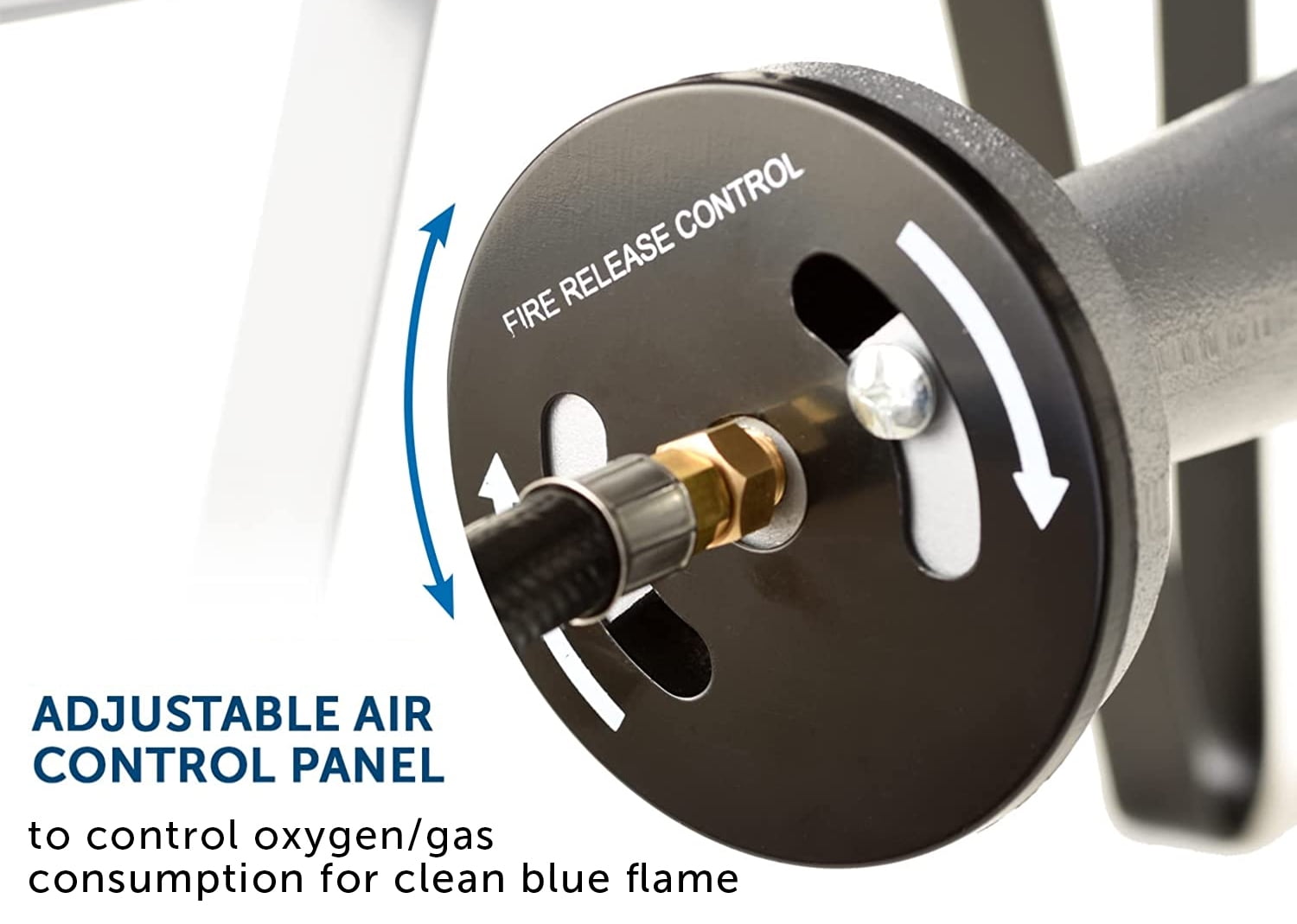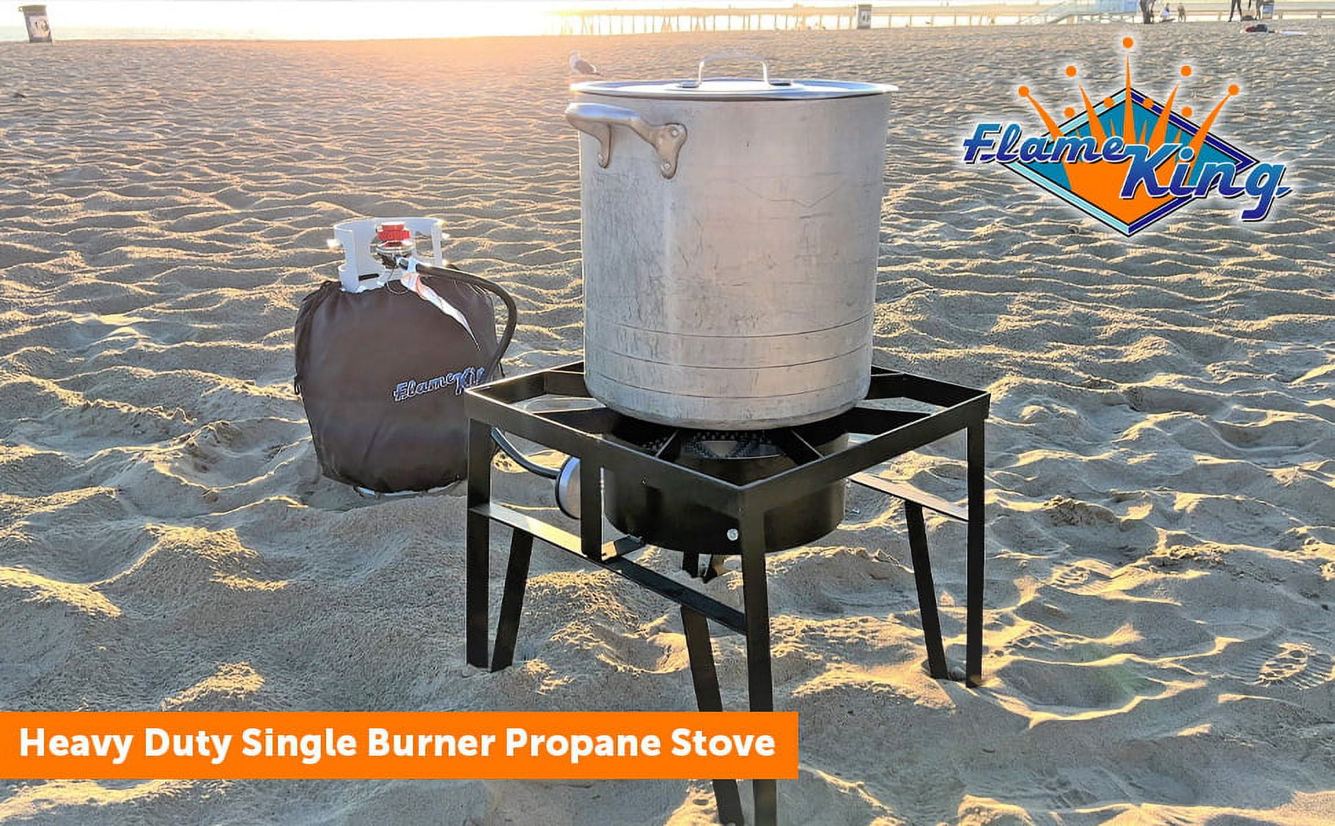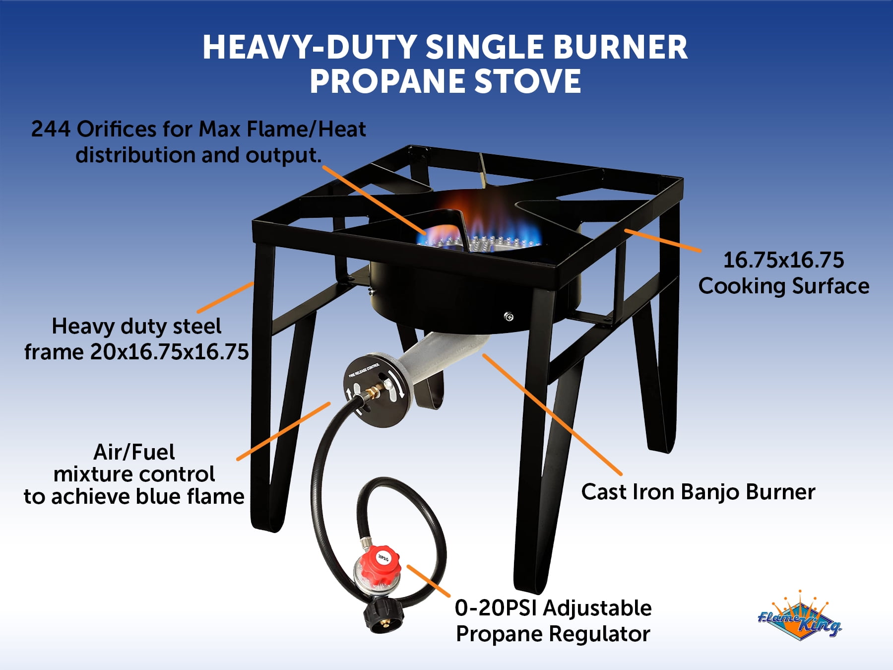 HEAVY-DUTY WITH POWERFUL HEAT OUTPUT: The Flame King 200,000 BTU single burner propane stove features a high BTU output for a hotter flame, enabling you to cook various dishes easily. It is ideal for turkey frying, home brewing, maple syrup preparations, and Cajun cooking. OUTDOOR COOKING SOLUTION: This portable gas stove is incredibly easy to set up and use, making it the ideal choice for outdoor cooking. Whether camping or needing an emergency backup during a power outage, the Flame King 200,000 BTU Burner Stove has you covered. PRECISE FLAME CONTROL: The gas regulating knob allows you to easily control the flame size, while the air supply regulator ring ensures an even blue flame for optimal cooking performance. DURABLE AND RUGGED DESIGN: Constructed from sturdy cast iron, the Flame King 200,000 BTU propane camp stove is built to last and comes with a 1-Year Manufacturer’s Defect Warranty for added peace of mind. COMPLETE SETUP: The single burner camp stove includes a 0-20 PSI regulator and a 4-foot hose, making it compatible with BBQ propane tanks (QCC1 Type-1 Valve).
