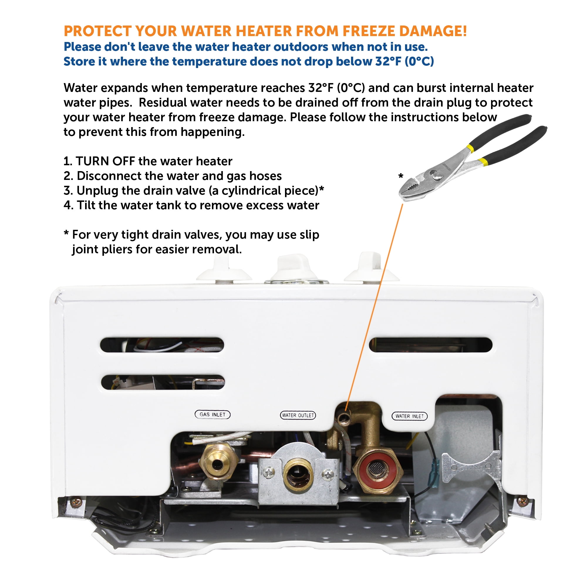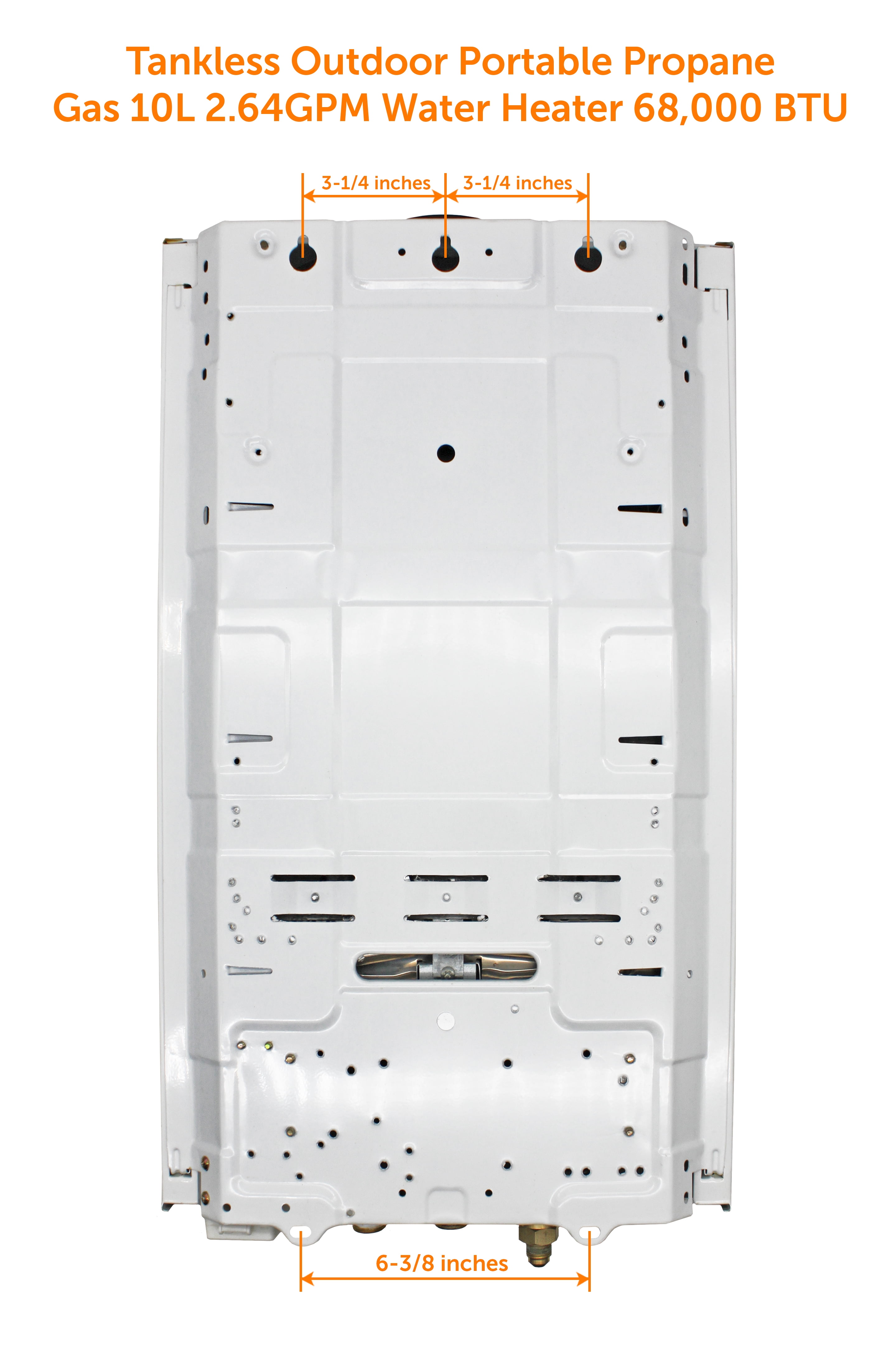 CSA Safety Approved: Your family’s safety is ensured with features like auto-cut-off water control, automatic ignition, anti-dry combustion protection, over-pressure, overheating, flameout protection, and anti-freezing protection. Convenient and Easy to Install: The compact and lightweight design allows for effortless carrying and features mounting holes for easy installation. This propane water heater 10L (Liter) is ideal for off-grid adventures, road trips, camping, and outdoor showers, making it ideal for bathing pets too! Powerful Performance: Operating at 68,000 BTU, this tankless propane water heater features fully adjustable control knobs for Winter/Summer settings, MIN/MAX gas settings, MAX/MIN water flow rate settings, and a digital water temperature meter for precise control. Durable Construction: Crafted from quality steel, this tankless water heater propane is built to last and comes with a 1-Year Manufacturer’s Defect Warranty for added peace of mind. Complete Package: The portable propane shower kit includes a CSA-certified regulator and a 5-foot hose for use with a BBQ propane tank (QCC1 Type-1 Valve), along with an on/off water control shower head and a 4.5-foot stainless steel-wrapped hose to stop kinks and punctures. Please note: This water heater shower is designed to be installed under an awning or other protective cover to help prevent rain from entering through the top vent.