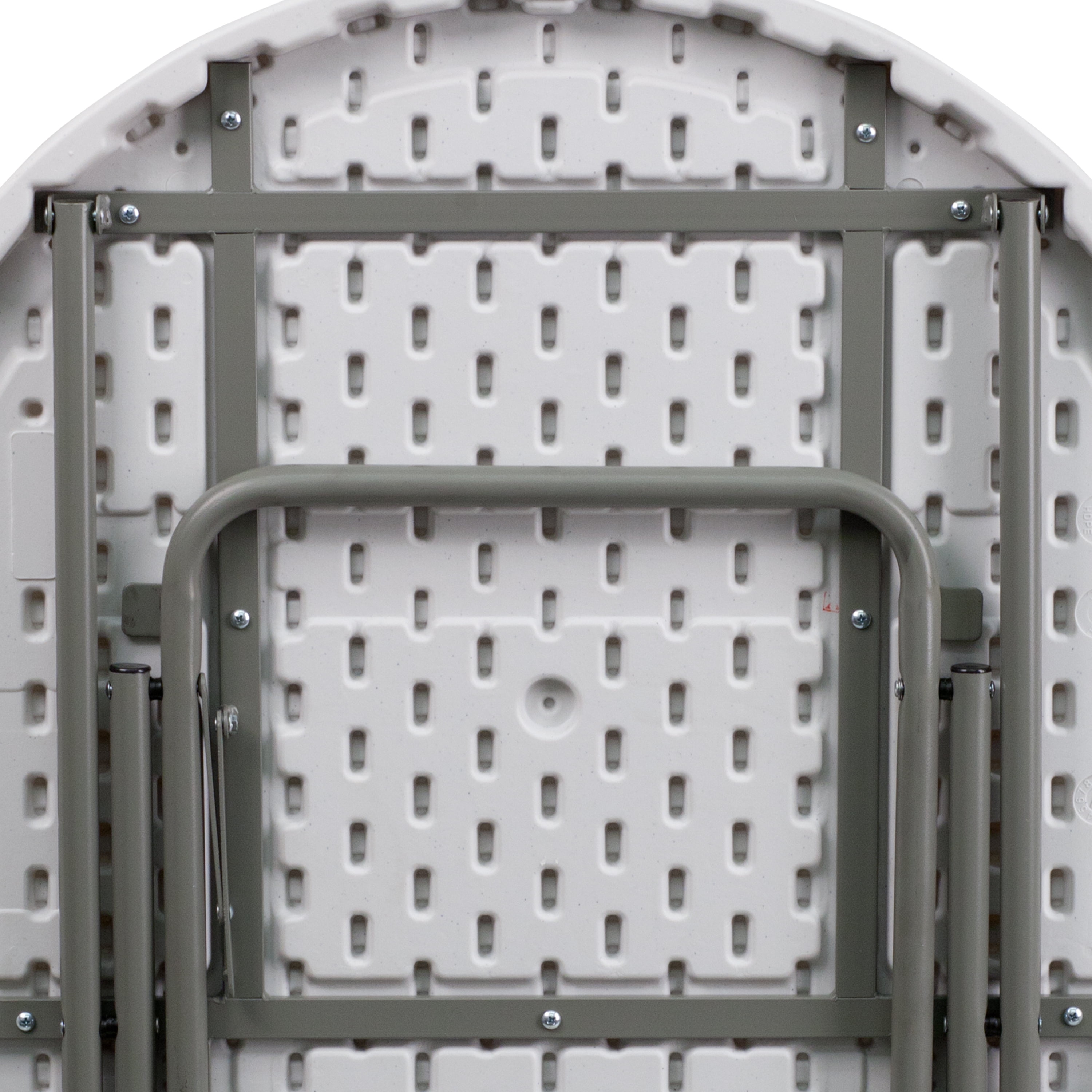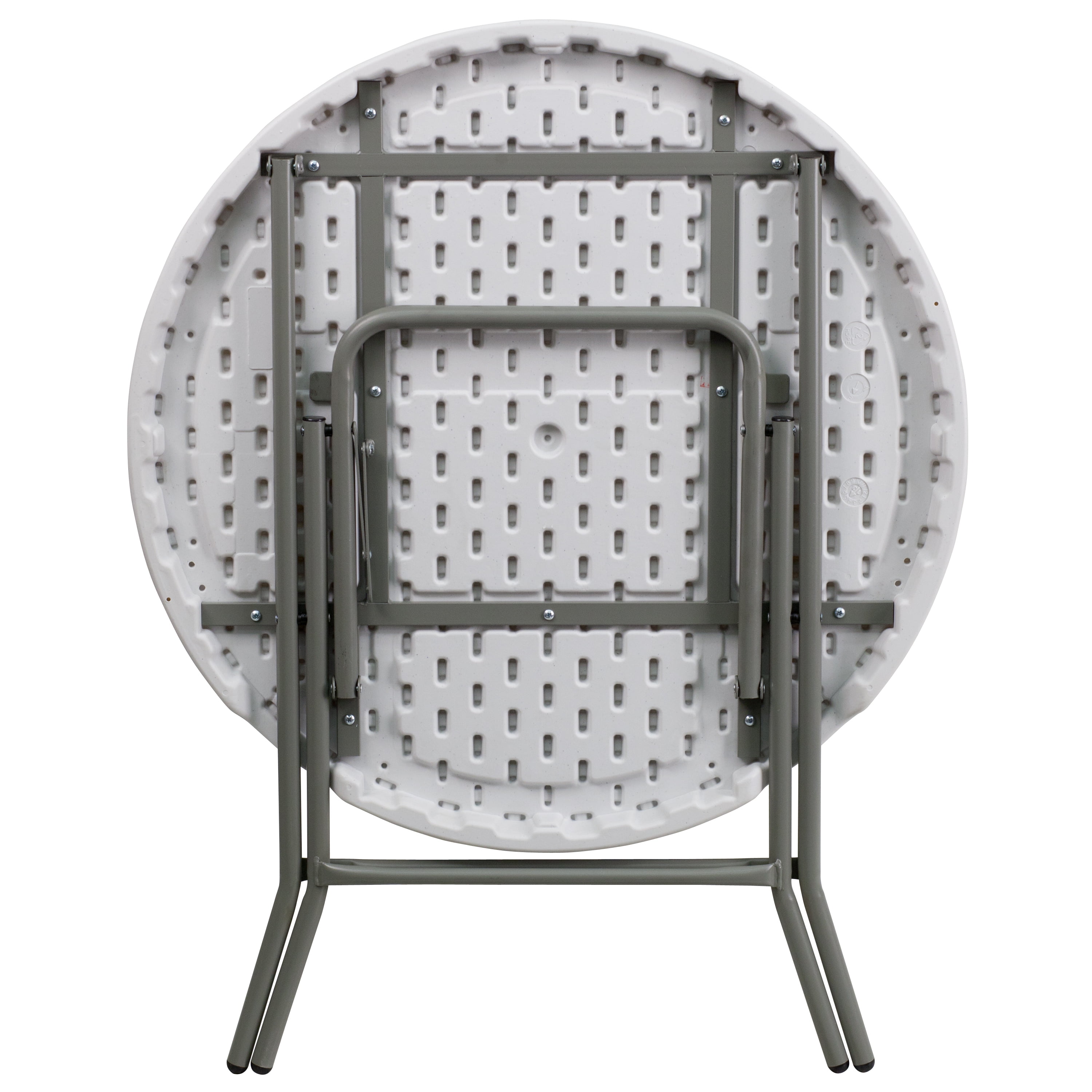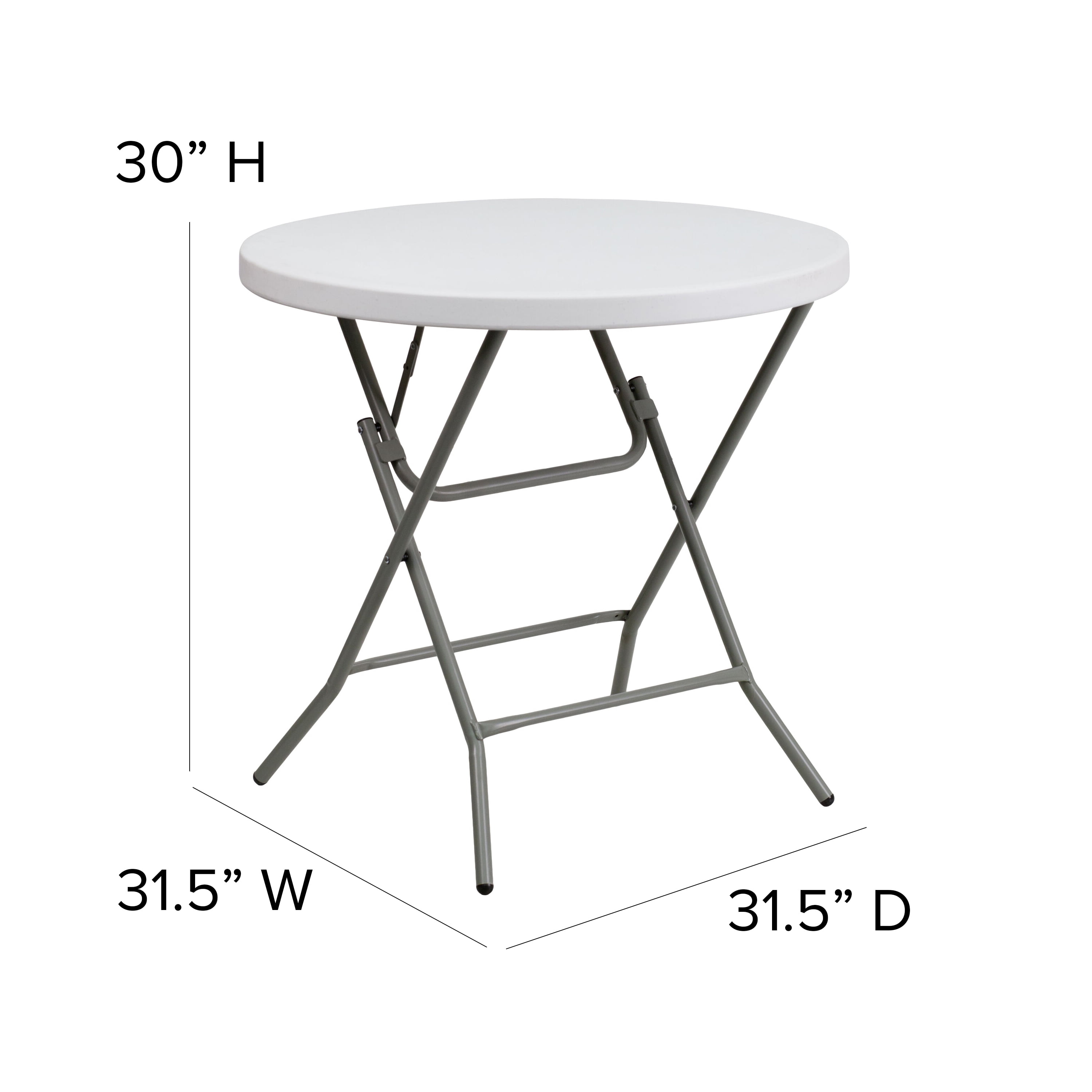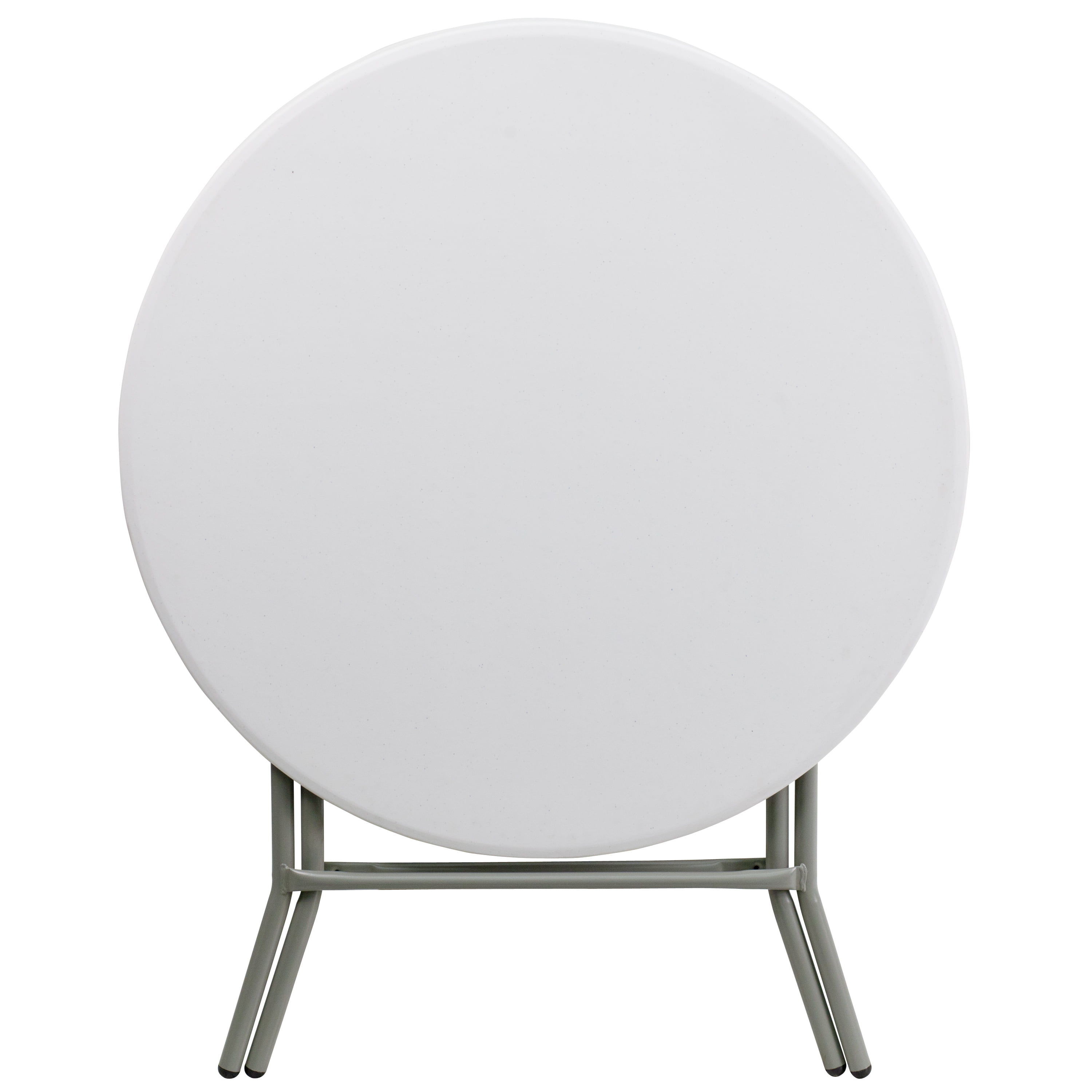 When you need a little extra surface area this folding table is the perfect choice. This plastic folding table is a convenient option when you need to set up tables for special events, cook-outs on your patio at home or when you’re serving snacks around the pool. This durable, easy to clean table is commercial rated for use in banquet halls, convention centers and at trade shows. The thick, granite white tabletop is 1.75″ thick, and will comfortably seat up to 3 adults. Its waterproof, impact and stain resistant top have a 220 pound static load capacity. Non-Locking gray powder coated cross legs fold to transport and store. Non-marring floor caps protect your floor by sliding smoothly when you need to move it. The 32″ Round Granite White Plastic Folding Table is a convenient option for your next home, school or business event. Designed for both indoor and outdoor use, store table indoors and protect the frame from extreme moisture.