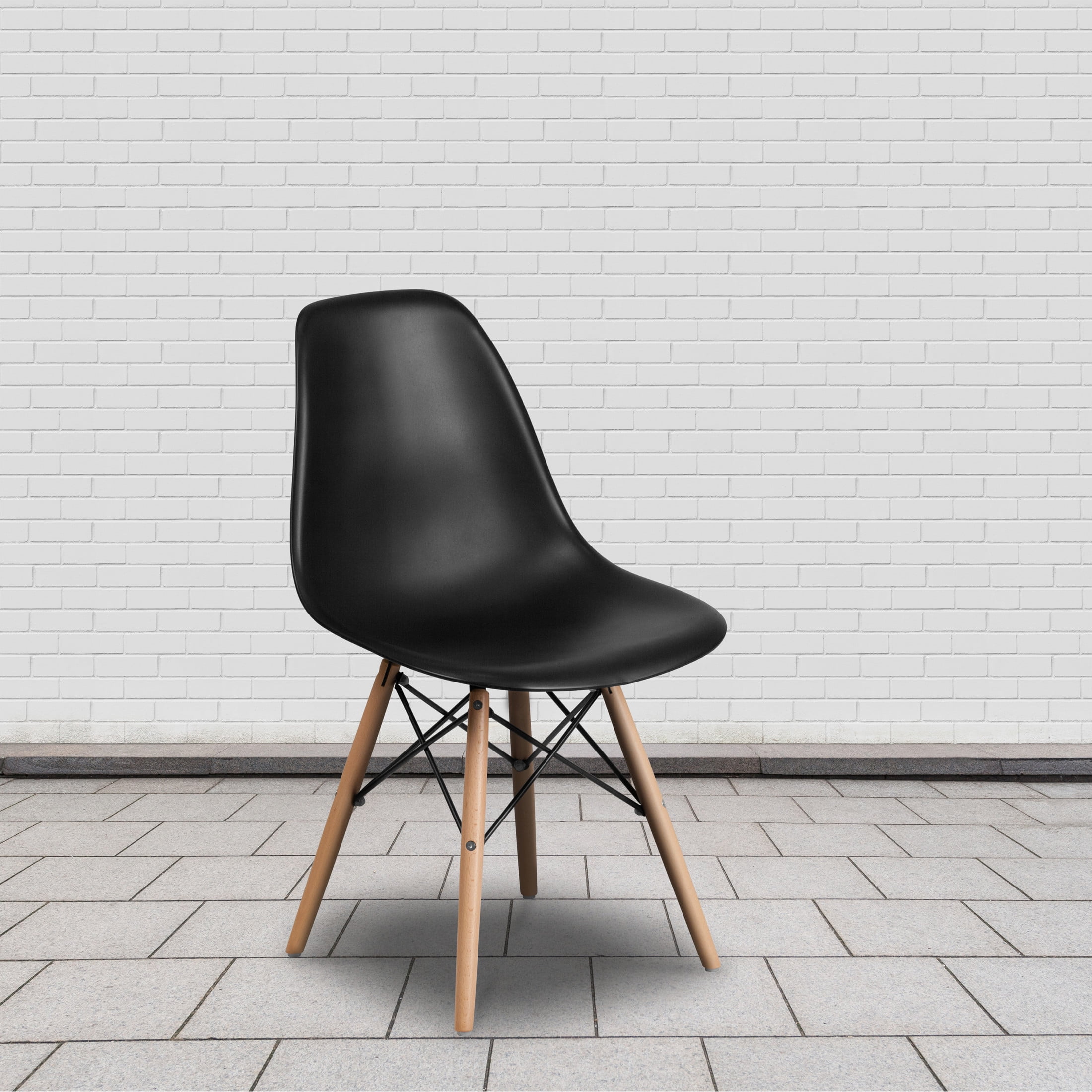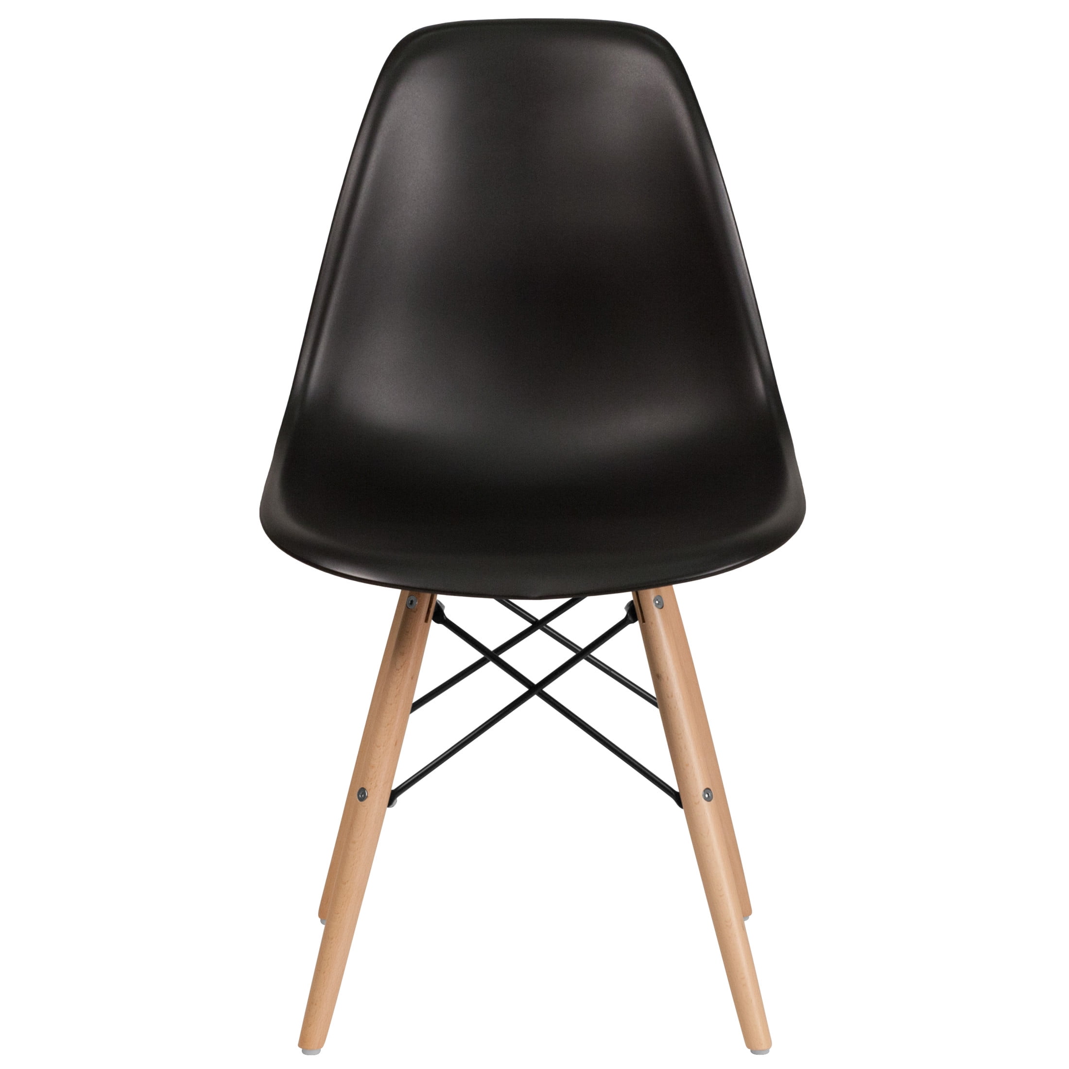 Flash Furniture 2 Pack Elon Series Black Plastic Chair with Wooden Legs for Versatile Kitchen, Dining Room, Living Room, Library or Desk Use Set of 2 Plastic Side Chair Ideal Use: dining chair, living room accent chair, home office side chair Black Plastic Finish Back Width: 11-16″ Polypropylene Molded Structure Waterfall Seat reduces pressure on your legs Wooden Legs with Metal Bracing Floor Protector Plastic Glides Suitable for Commercial Use PRODUCT MEASUREMENTS: Overall Size: 18.25″W x 22.5″D x 31.5″H; Seat Size: 18.25″W x 15″D x 17.5″H; Back Size: 16″W x 15″H