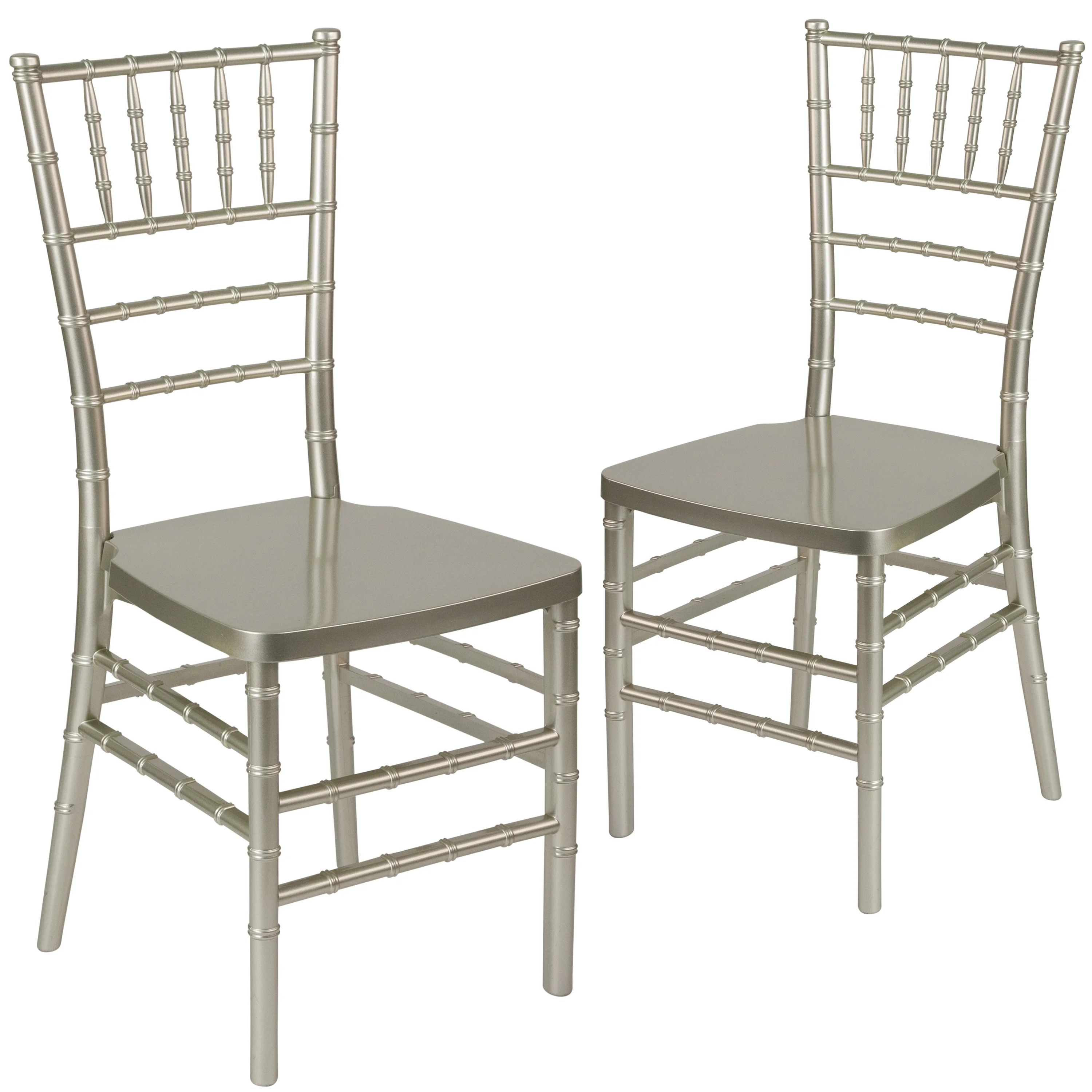 Set of 2 Champagne Resin Chiavari Chairs for Indoor or Outdoor Events 1000 lb. Weight Capacity Stack Quantity: 8 Ultra-strong polycarbonate, non-stick and anti-static finish Wobble free one-piece frame, no screws Ships Fully Assembled 2 Year Limited Warranty on Frame Lightweight ballroom chair for weddings, banquet halls, restaurants, and rental companies