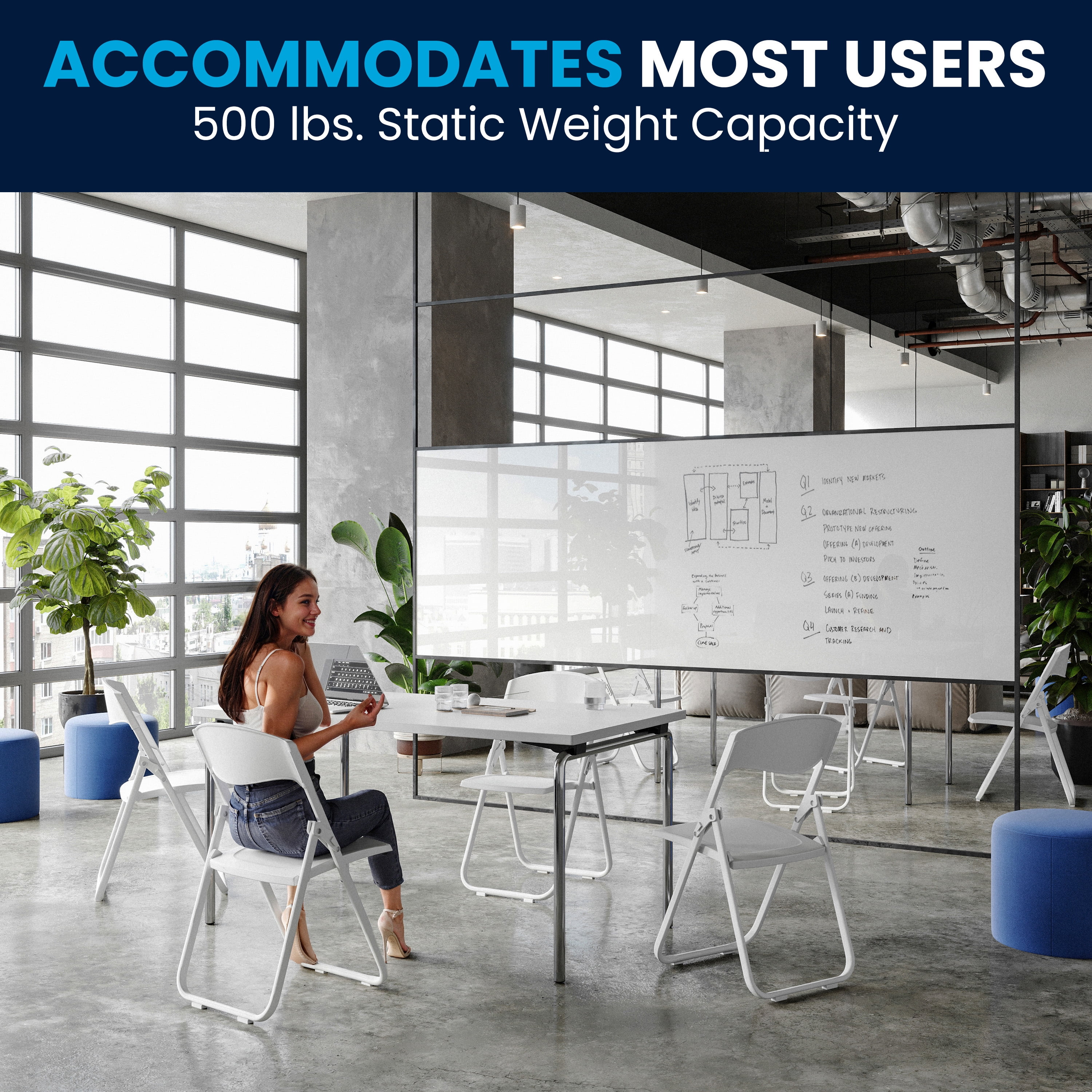 Flash Furniture 2 Pack HERCULES Series 500 lb. Capacity Heavy Duty White Plastic Folding Chair with Built-in Ganging Brackets Set of 2 Plastic Folding Chairs 500 lb. Weight Capacity Lightweight Design Ergonomically Contoured Design with White Plastic Back and Seat Textured Seat ensures safe seating 18 Gauge Steel White Powder Coated Frame Finish with Floor Protector Caps Ganging Bracket attach chairs together Designed for Commercial Use Folded Size: 18″W x 3.5″D x 41.25″H No Assembly Required PRODUCT MEASUREMENTS: Overall Size: 18″W x 21″D x 32.25″H; Seat Size: 14.5″W x 16.75″D x 17.75″H; Back Size: 17″W x 16.5″H; No Assembly Required