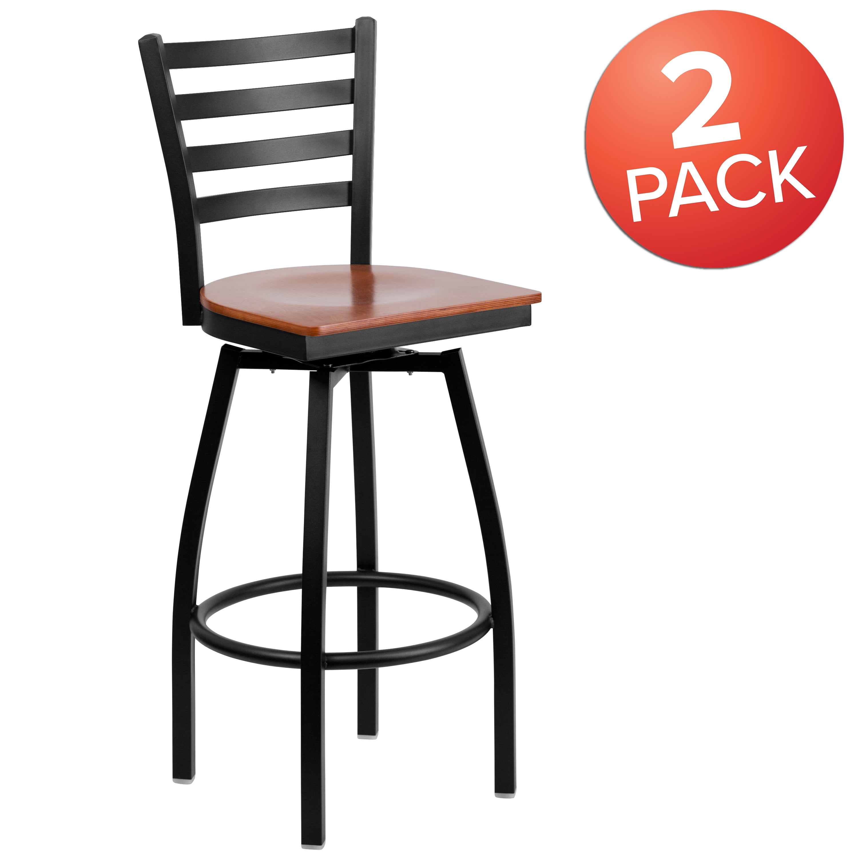 Flash Furniture 2 Pack HERCULES Series Black Ladder Back Swivel Metal Barstool – Cherry Wood Seat Set of 2 Metal Dining Bar Chairs for High Traffic Businesses 500 lb. Weight Capacity Ladder Back Design with Curved High Back for comfort .625″ Thick Plywood Seat is easy to clean 360° Swivel Seat for easy access from any angle Footrest promotes better sitting experience 16 Gauge Steel Frame Powder Coated Frame Finish Floor Protector Plastic Glides Designed for Commercial Use; Suitable for Home Use Multi-use: kitchen dining chair, restaurant chair, side chair, café chair, bistro chair PRODUCT MEASUREMENTS: Overall Size: 16.5″W x 20.5″D x 44.5″H; Seat Size: 16.5″W x 16.5″D x 30.25″H; Back Size: 14.5″W x 13.75″H