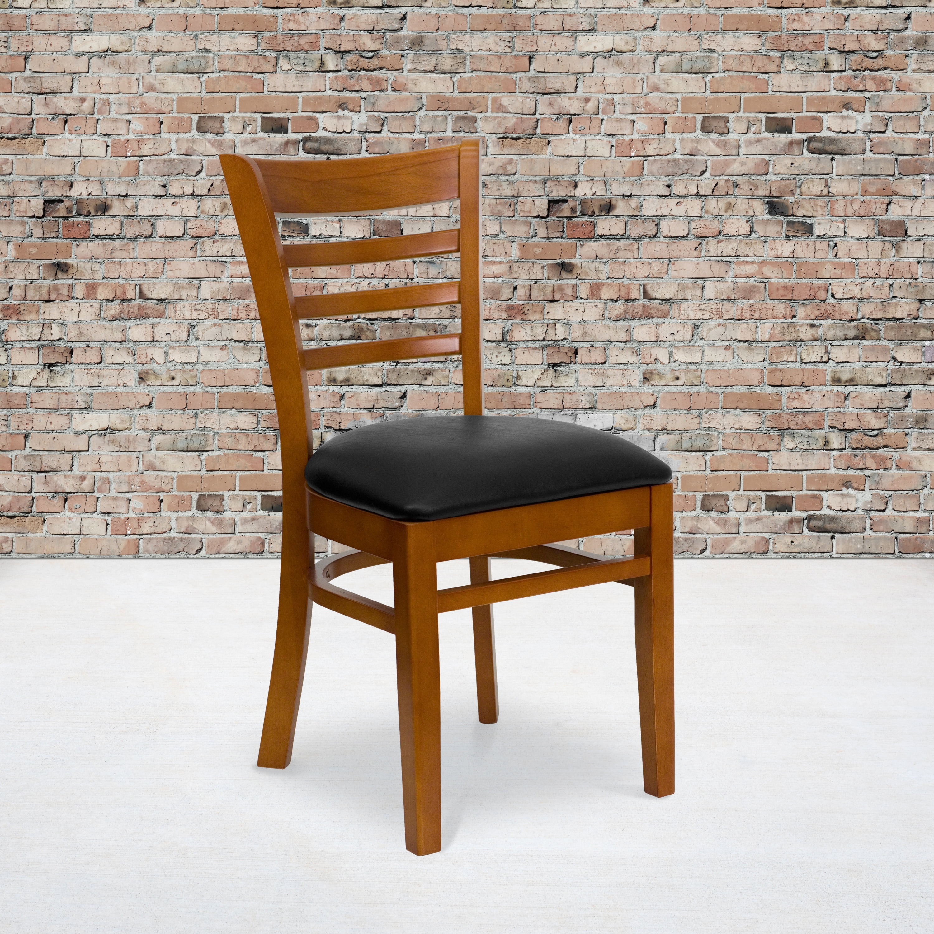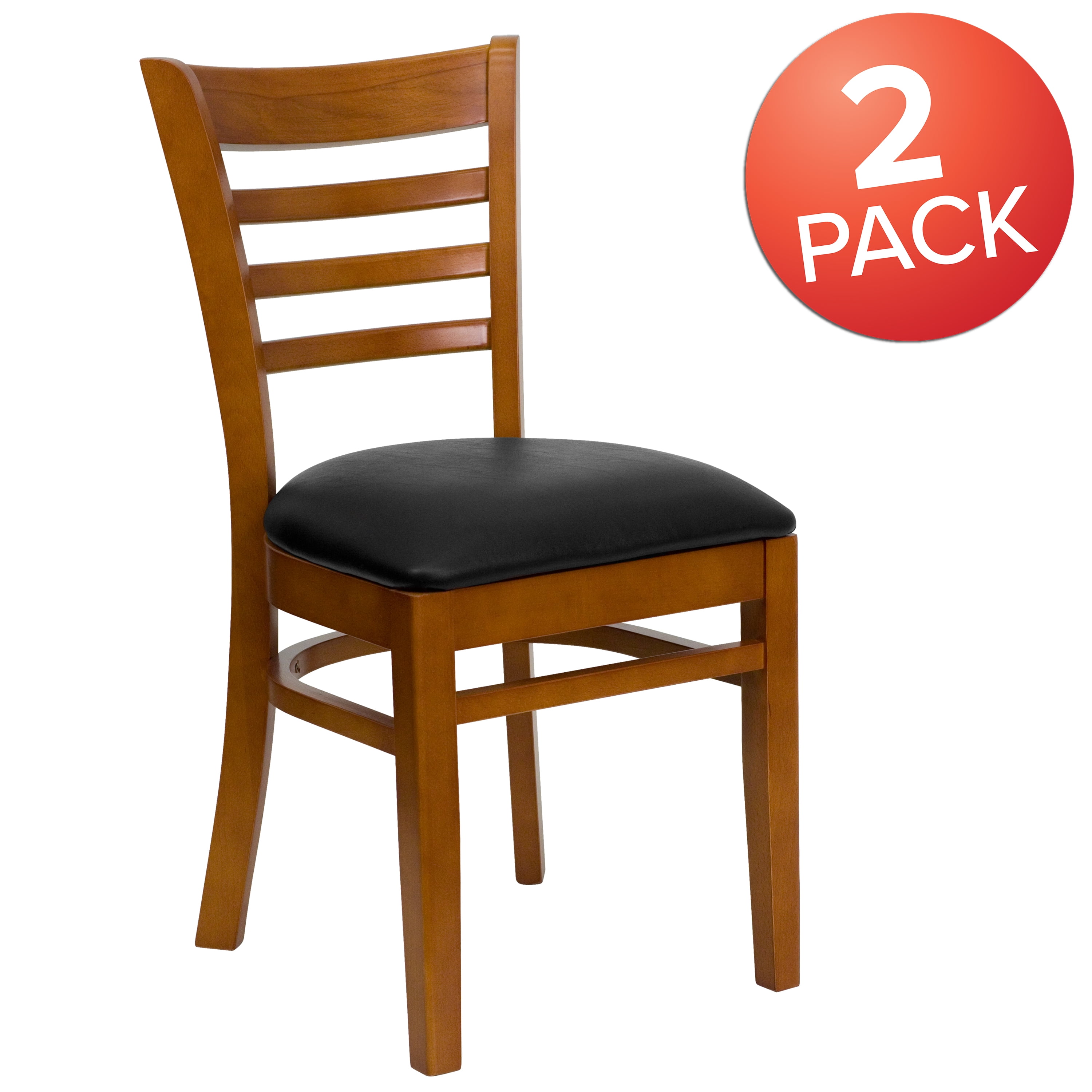 Flash Furniture 2 Pack HERCULES Series Ladder Back Cherry Wood Restaurant Chair – Black Vinyl Seat Set of 2 Wood Dining Chairs 800 lb. Weight Capacity Ladder Back Design Black Vinyl Upholstered Seat 2.5″ Thick Foam Padded Seat with CAL 117 Fire Retardant Foam Solid European Beech Hardwood Construction, Curved Support Bar Mortise and Tenon Style Construction with metal wood screw reinforcements Cherry Wood Frame Finish Floor Protector Plastic Glides Designed for Commercial Use; Suitable for Home Use PRODUCT MEASUREMENTS: Overall Size: 17.5″W x 20″D x 33.75″H; Seat Size: 16.75″W x 16.75″D x 19.5″H; Back Size: 14.5″W x 15″H