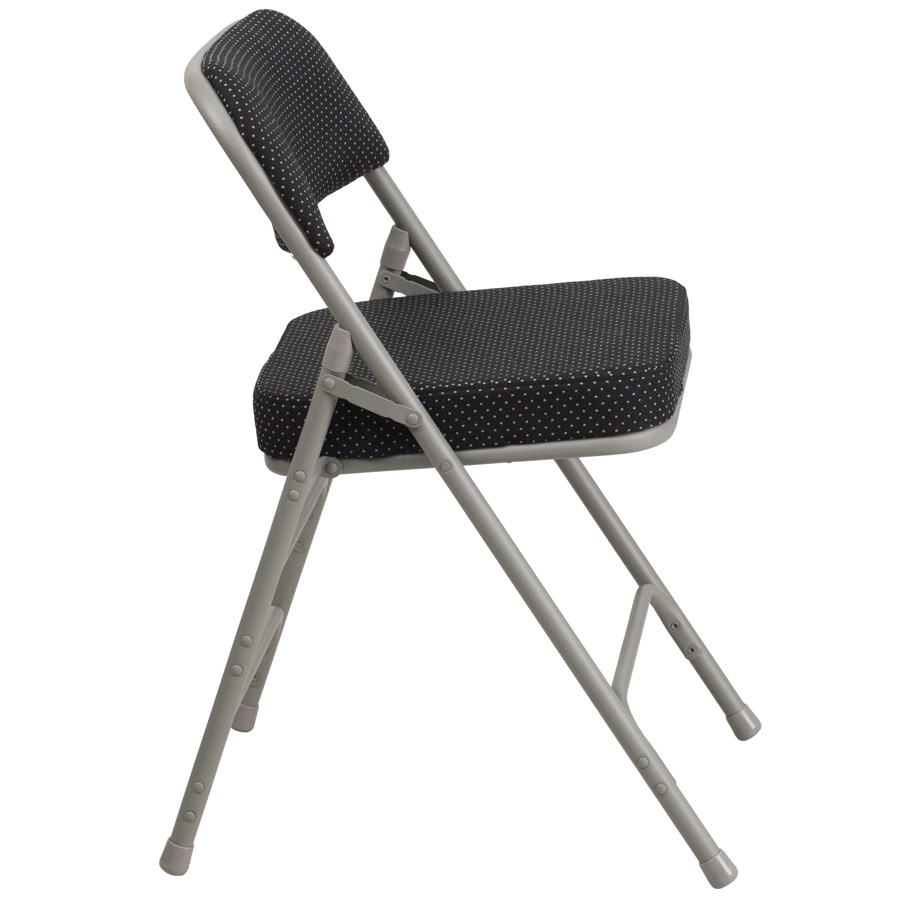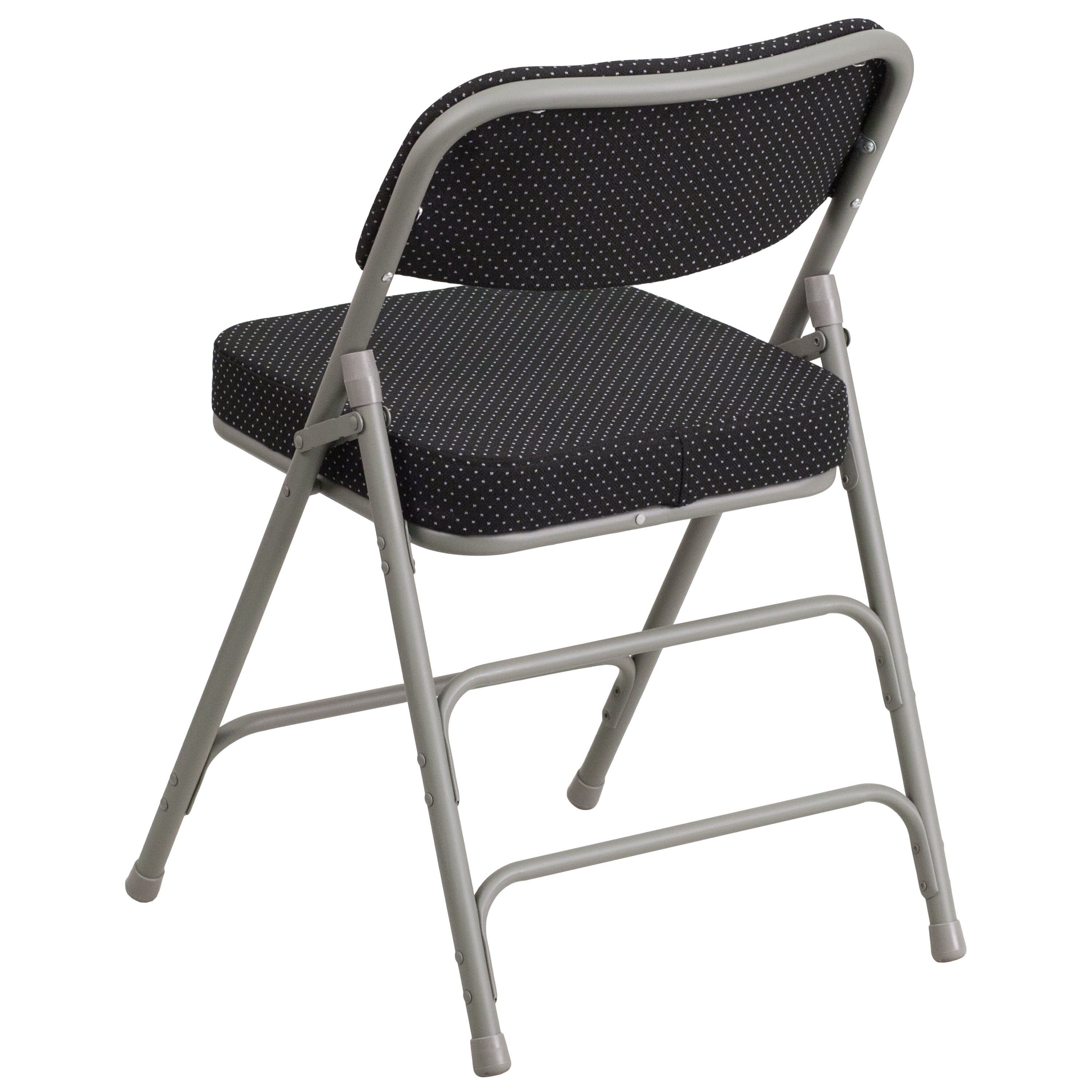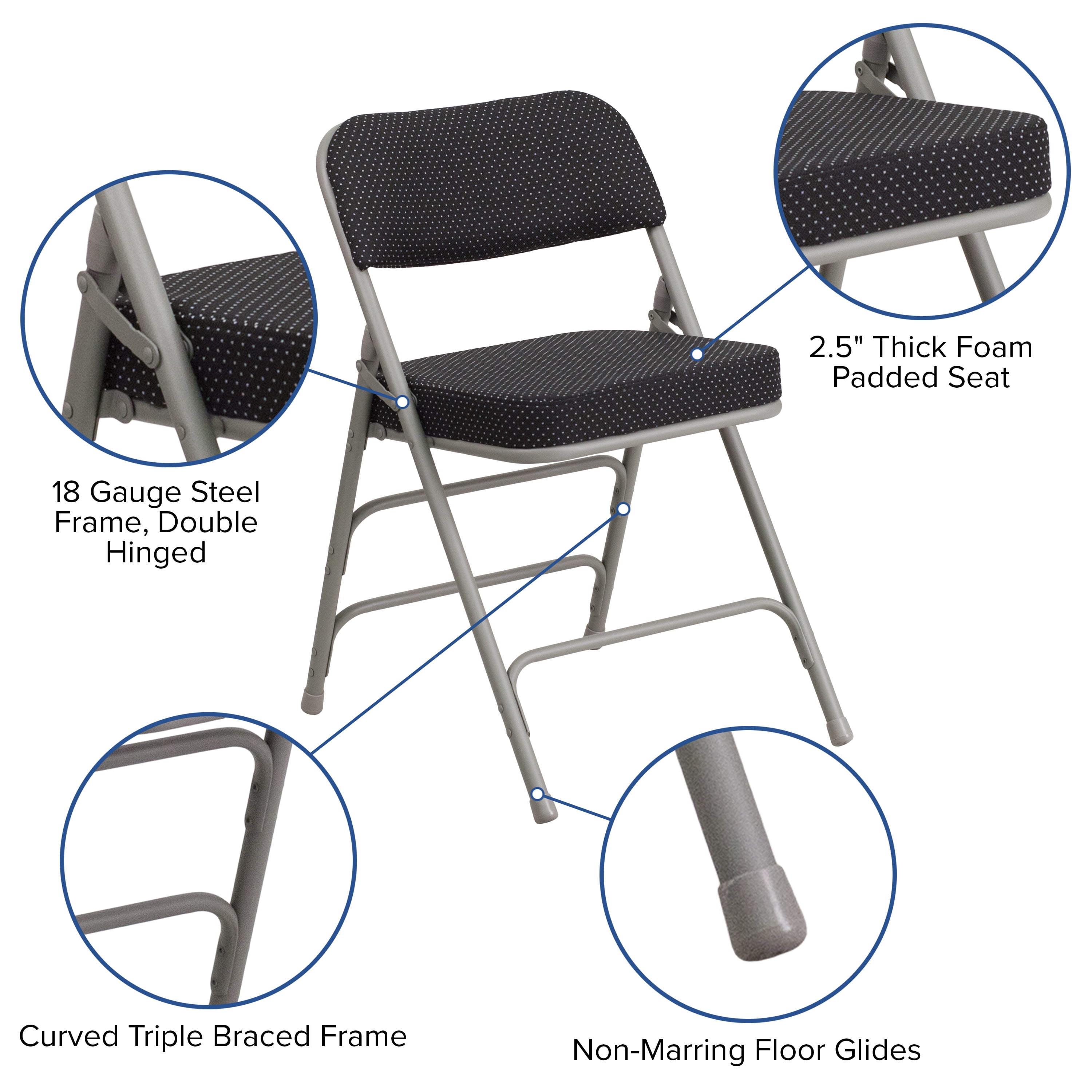 Set of 2: Padded Metal Folding Chair 300 lb. Weight Capacity Black Pin-Dot Fabric Upholstery 2.5″ Thick Padded Seat with CAL 117 Foam Curved Triple Braced and Double Hinged Frame 18 Gauge Steel Frame Gray Powder Coated Frame Finish with Non-Marring Floor Glides Designed for Commercial or Residential Use Folded Size: 18″W x 3.5″D x 37.25″H Top Review: Needed some comfortable folding chairs for parties and group meetings. These chairs are comfortable, sturdy and attractive. Exactly as advertised and shipped in a timely manner.