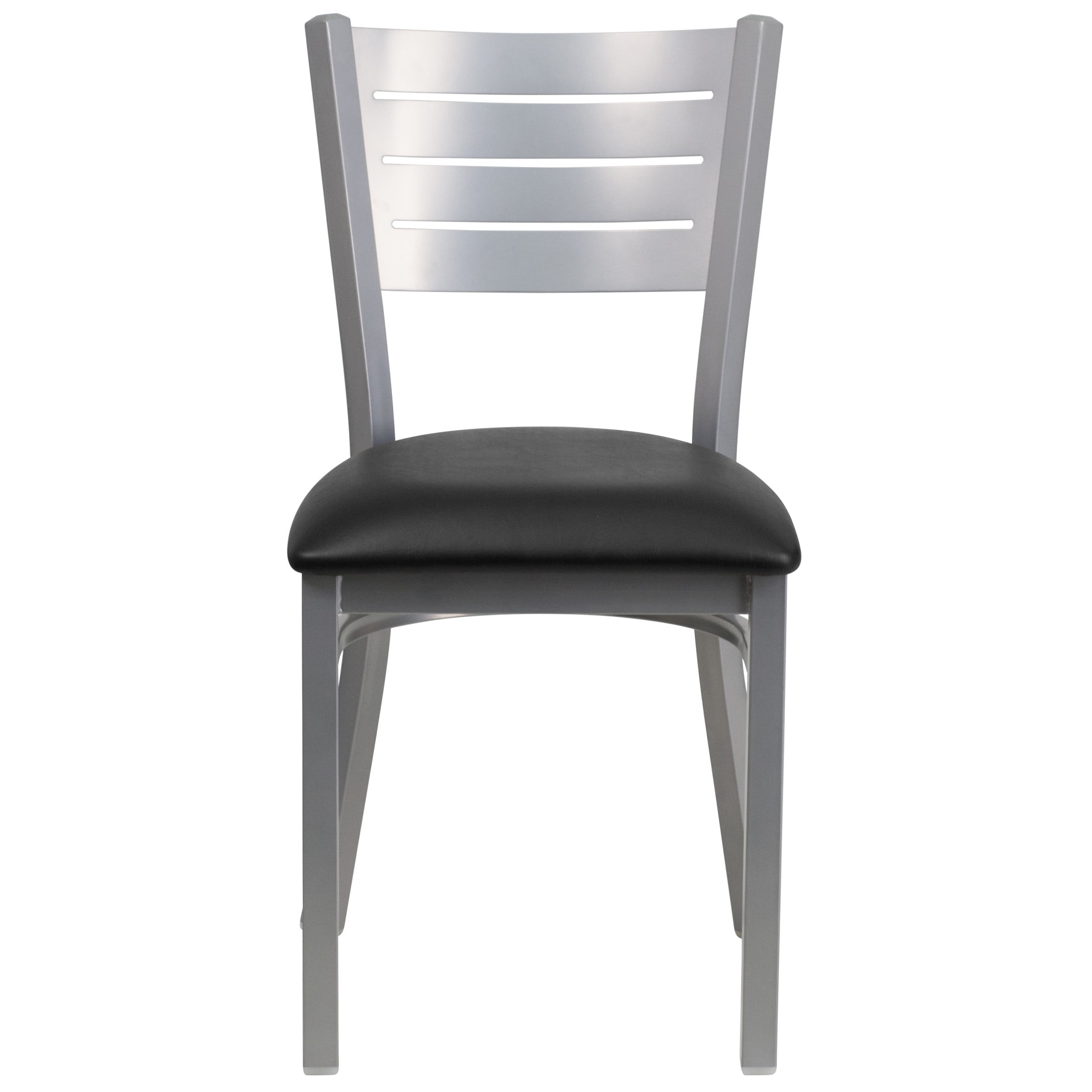The silver slat back metal restaurant chair will be an attractive addition to your cafe, coffee house or dining room. This metal chair has a slat back design, black vinyl upholstered seat and an 18 gauge steel frame with a silver powder coated finish. The welded joint assembly and curved support bar gives the chair great strength and stability. Plastic floor glides protect your floors by sliding smoothly when you need to move the chair. The slat back metal restaurant chair is a durable commercial grade restaurant chair that would also be great for use in your home.