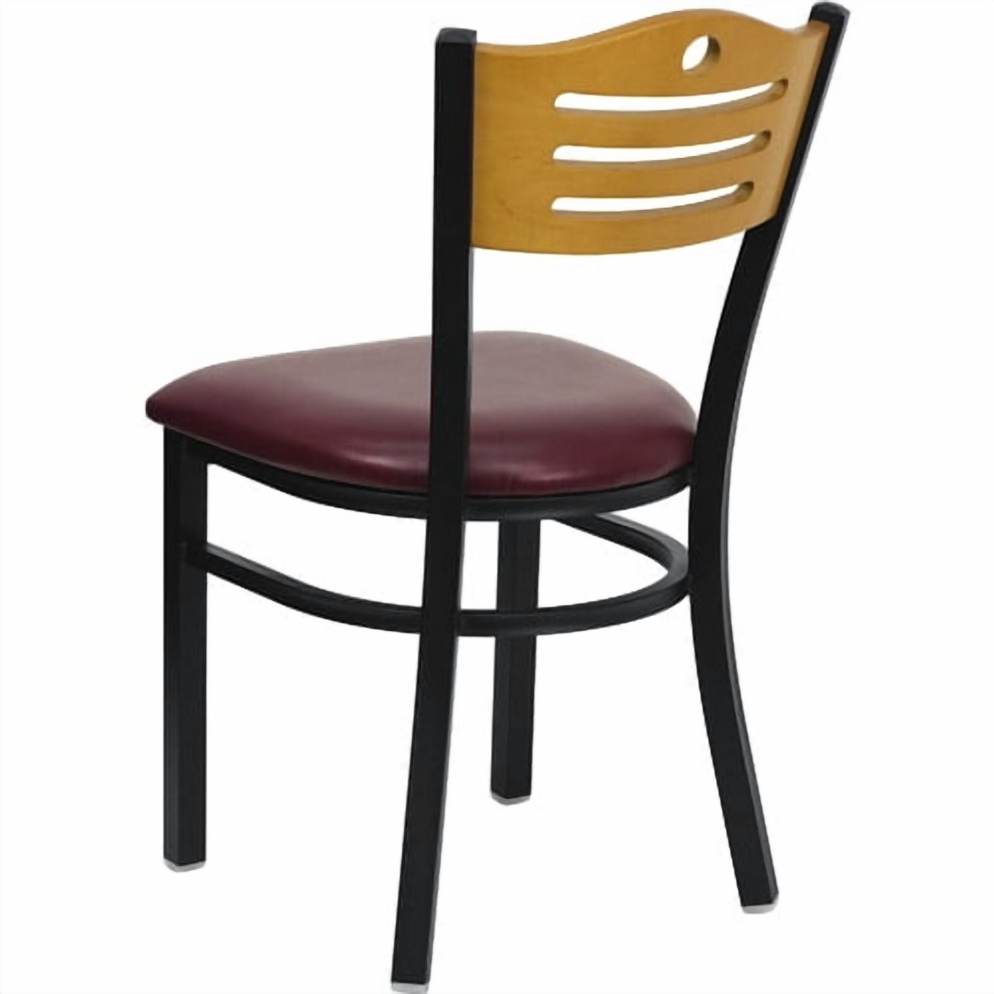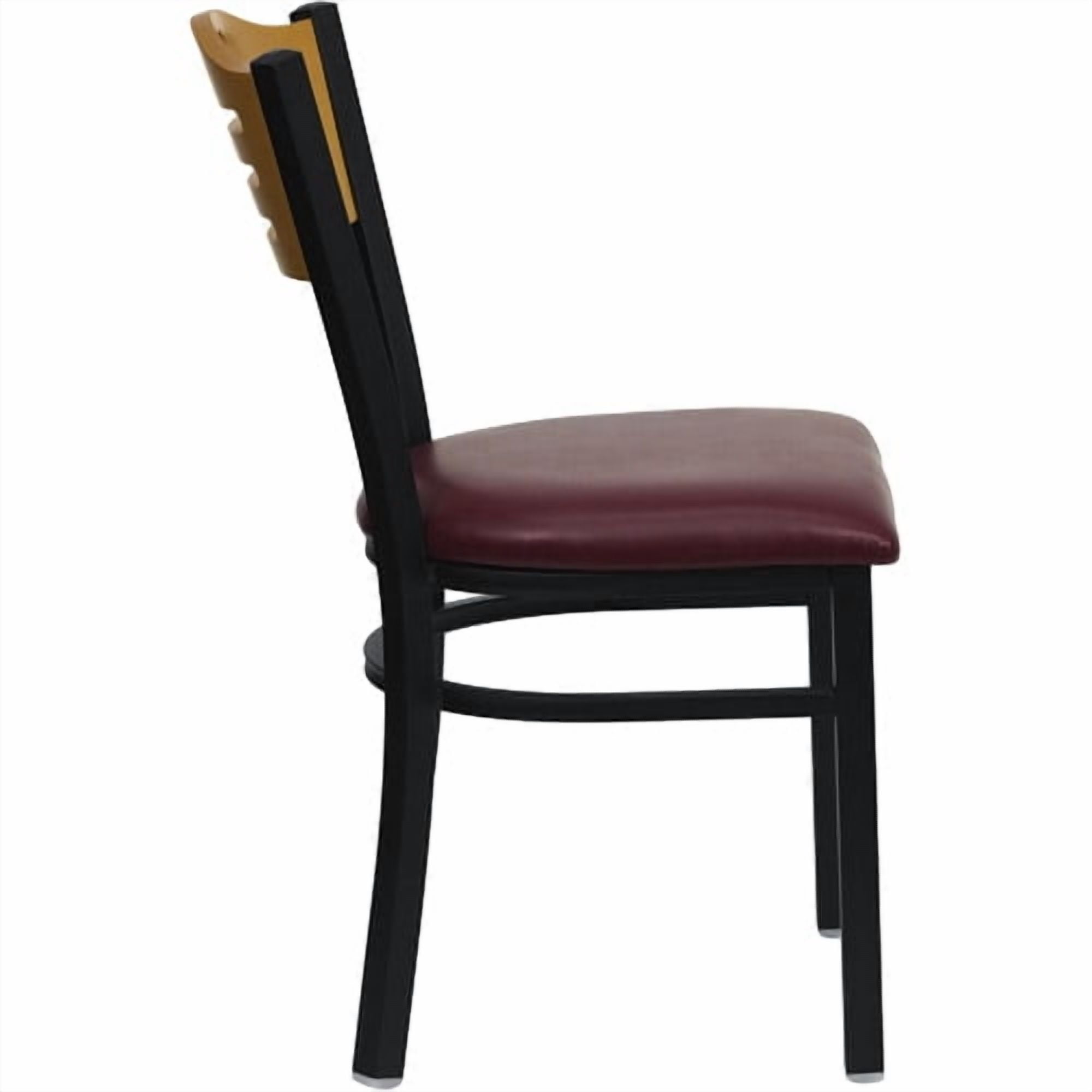 Flash Furniture 2 Pk. HERCULES Series Black Slat Back Metal Restaurant Chair – Natural Wood Back, Burgundy Vinyl Seat Set of 2 Metal Dining Chairs 500 lb. Weight Capacity Natural Wood Slat Back Design Burgundy Vinyl Upholstered Seat 2.5″ Thick Foam Padded Seat with CAL 117 Fire Retardant Foam Welded Joint Assembly, Curved Support Bar 18 Gauge Steel Frame Black Powder Coated Frame Finish Floor Protector Plastic Glides Designed for Commercial Use; Suitable for Home Use PRODUCT MEASUREMENTS: Overall Size: 16.75″W x 21.5″D x 32.75″H; Seat Size: 16.75″W x 16.5″D x 19″H; Back Size: 16.5″W x 14.5″H