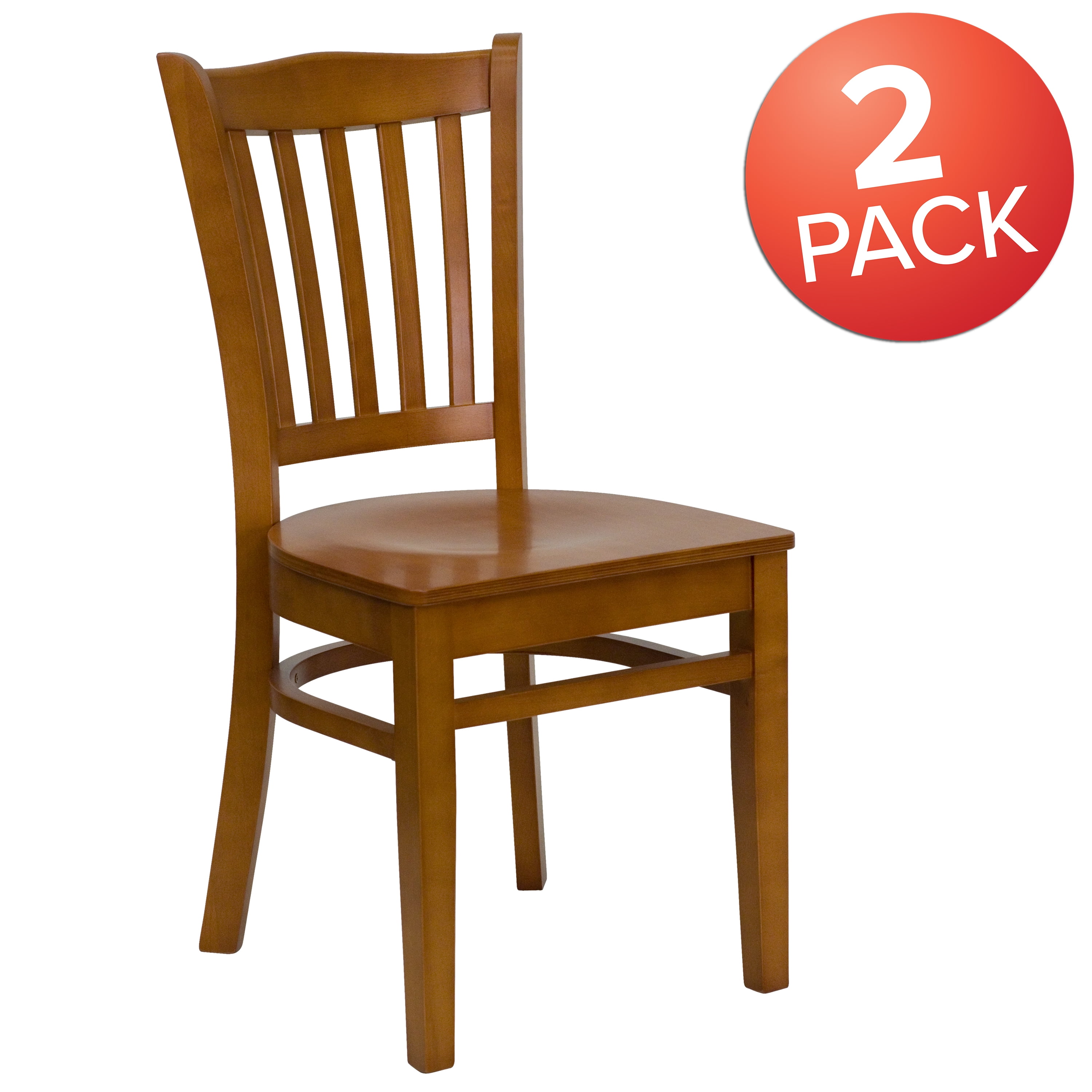 Set of 2 Wood Dining Chairs 800 lb. Weight Capacity Vertical Slat Back Design .625″ Thick Beechwood Seat Solid European Beech Hardwood Construction Mortise and Tenon Style Construction with metal wood screw reinforcements Curved Support Bar Cherry Wood Frame Finish Floor Protector Plastic Glides Designed for Commercial Use; Suitable for Home Use