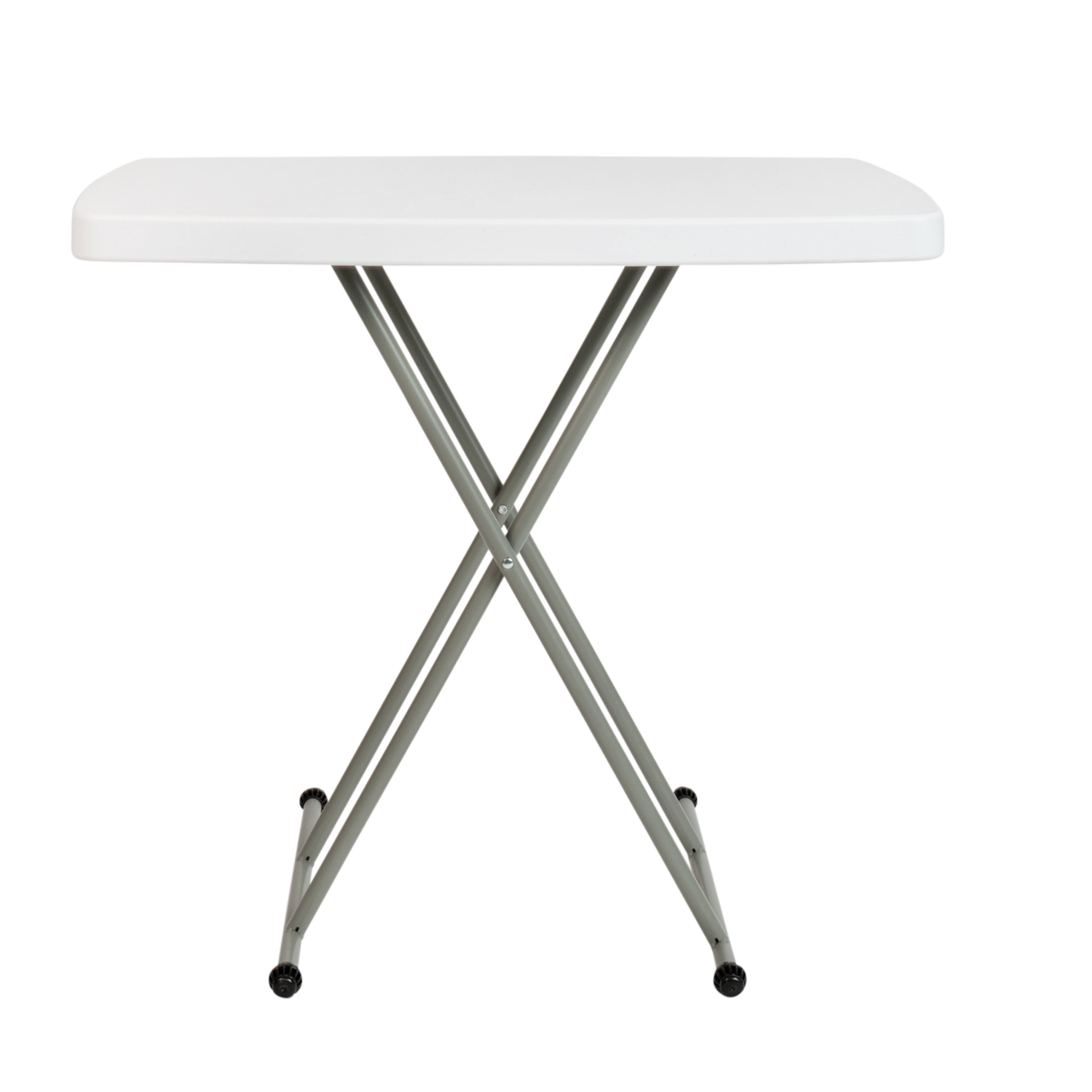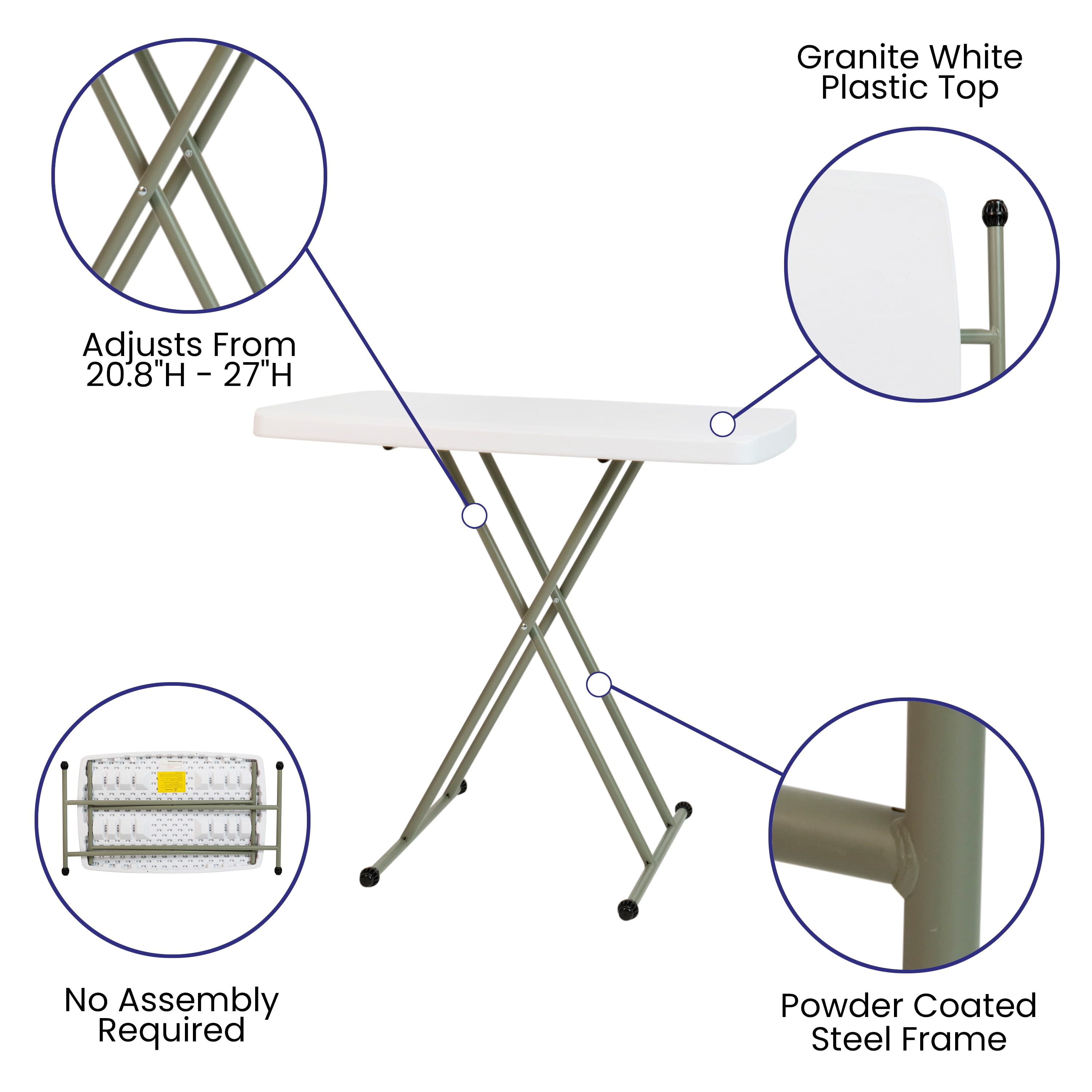 30 Inch Granite White Indoor or Outdoor Plastic Folding Table, Adjustable Height Commercial Grade Side Table, Laptop If you need extra surface space in your office cubicle, classroom, training room, dorm room, or in the home, this adjustable height personal folding table may be just what you’re looking for. The granite white top gives a clean and tidy appearance to any space and adjusts from 19″H to 28.25″H to accommodate a variety of tasks. Pick one of the three height adjustment grooves and raise the tab to lock the frame in place. Lightweight for easy transport and suitable for indoor/outdoor use, this commercial grade table would be an excellent addition to any space. Use this handy piece as a laptop table while sitting on the floor to craft your term paper, a TV tray to watch your favorite show during dinner, or as a companion desk in your workspace without worry. Welded joints, metal screw construction and a gray powder coated steel frame provide a stable base to support up to 50 lbs. static weight capacity. The high density polyethylene top is ultra-strong and durable and does not break down from sun exposure to give you a great work surface whether indoors or out. This multi-use side table needs no assembly and folds flat for convenient storage and transportation. A water based cleaner quickly cleans up spills and removes dust. Fixed plastic floor glides will prevent damage to your hard flooring surfaces. [DAD-YCZ-76X-GW-GG] Specifications: Adjustable Folding Table for Indoor/Outdoor Use Suitable for Commercial or Residential Use Granite White High Density Polyethylene Top is stain, water and impact resistant Adjusts From 19″H to 28.25″H for multiple uses Welded Joints with Metal Screw Construction support up to 50 lbs. weight capacity Powder Coated Steel Frame resists rust and corrosion Folds Flat for Easy Storage or Transport at 2.5″ No Assembly Required; Legs Adjust in Three Increments Multi-Use plastic folding table with height adjustable frame for the office, living room, bedroom or dorm