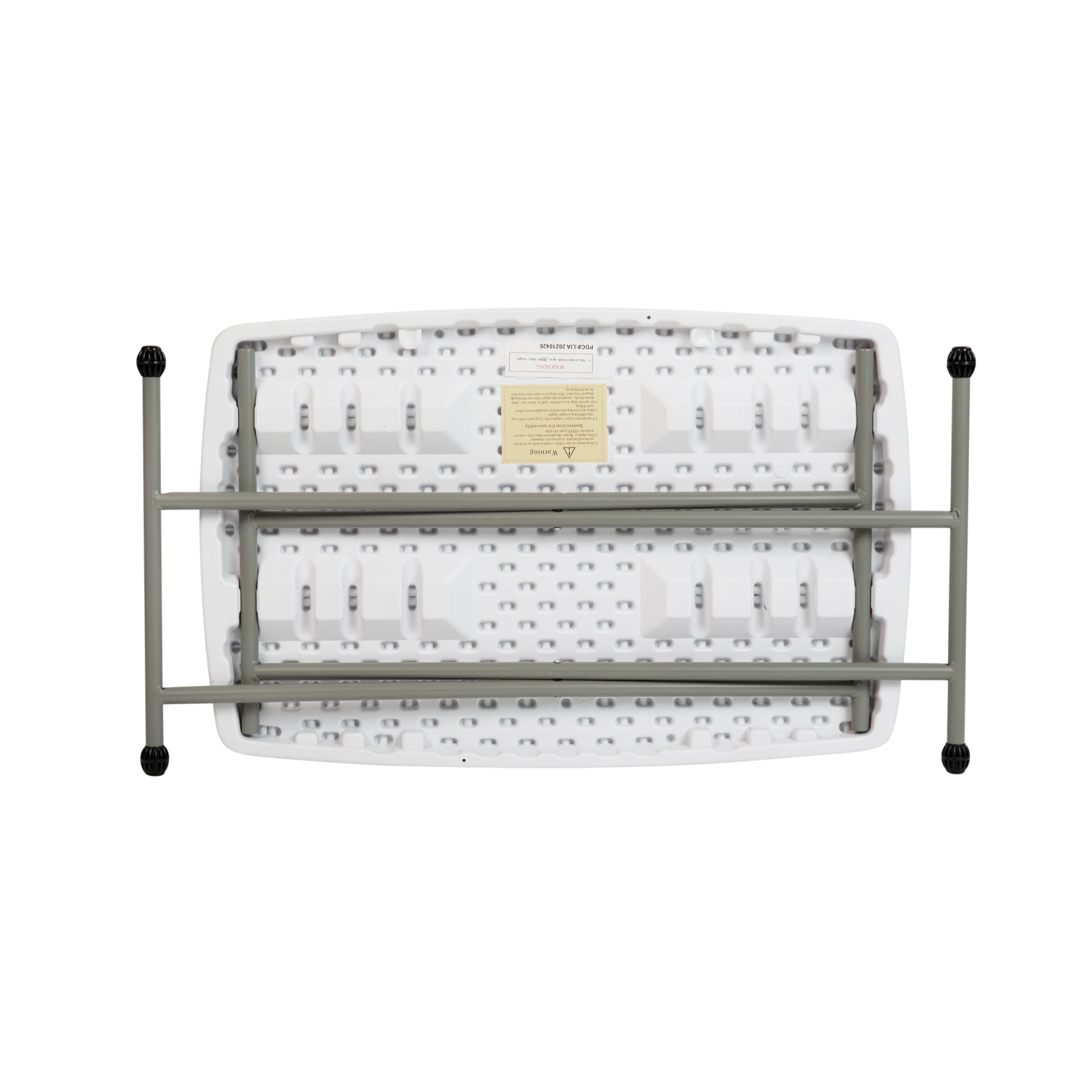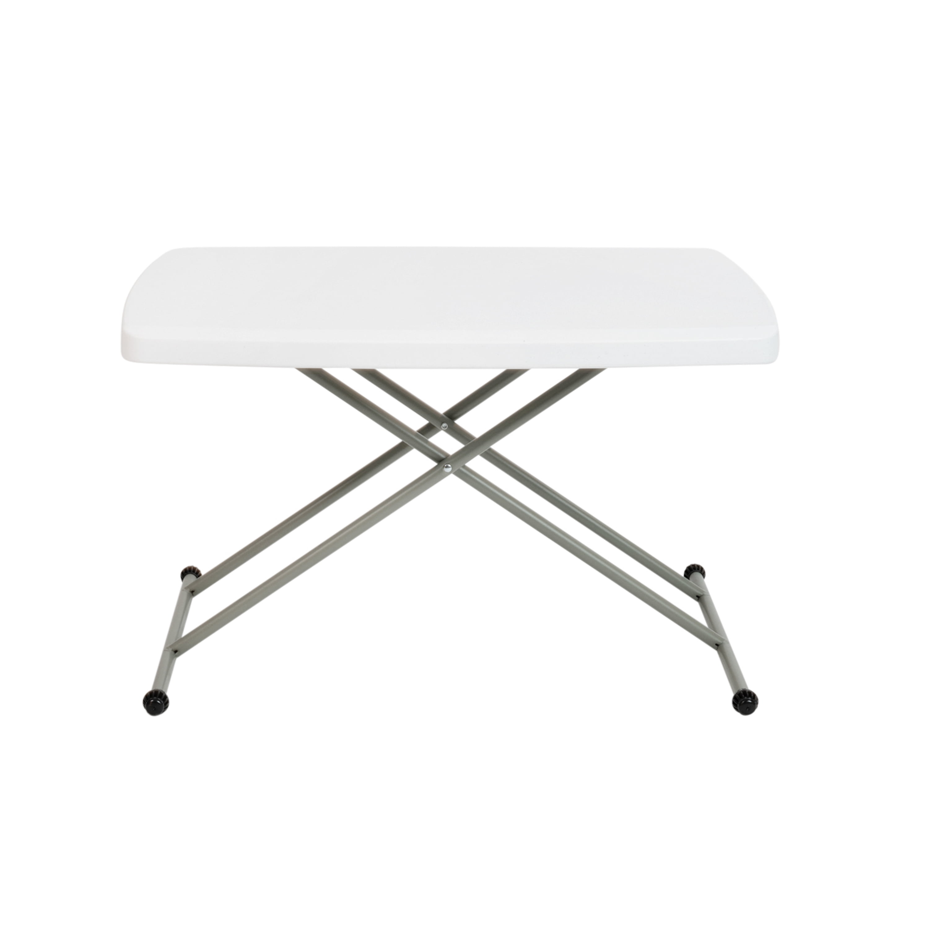 Adjustable Folding Table for Indoor/Outdoor Use Suitable for Commercial or Residential Use Granite White High Density Polyethylene Top is stain, water and impact resistant Adjusts From 19″H to 28.25″H for multiple uses Welded Joints with Metal Screw Construction support up to 50 lbs. weight capacity Powder Coated Steel Frame resists rust and corrosion Folds Flat for Easy Storage or Transport at 2.5″ No Assembly Required; Legs Adjust in Three Increments Multi-Use plastic folding table with height adjustable frame for the office, living room, camping, and tailgating