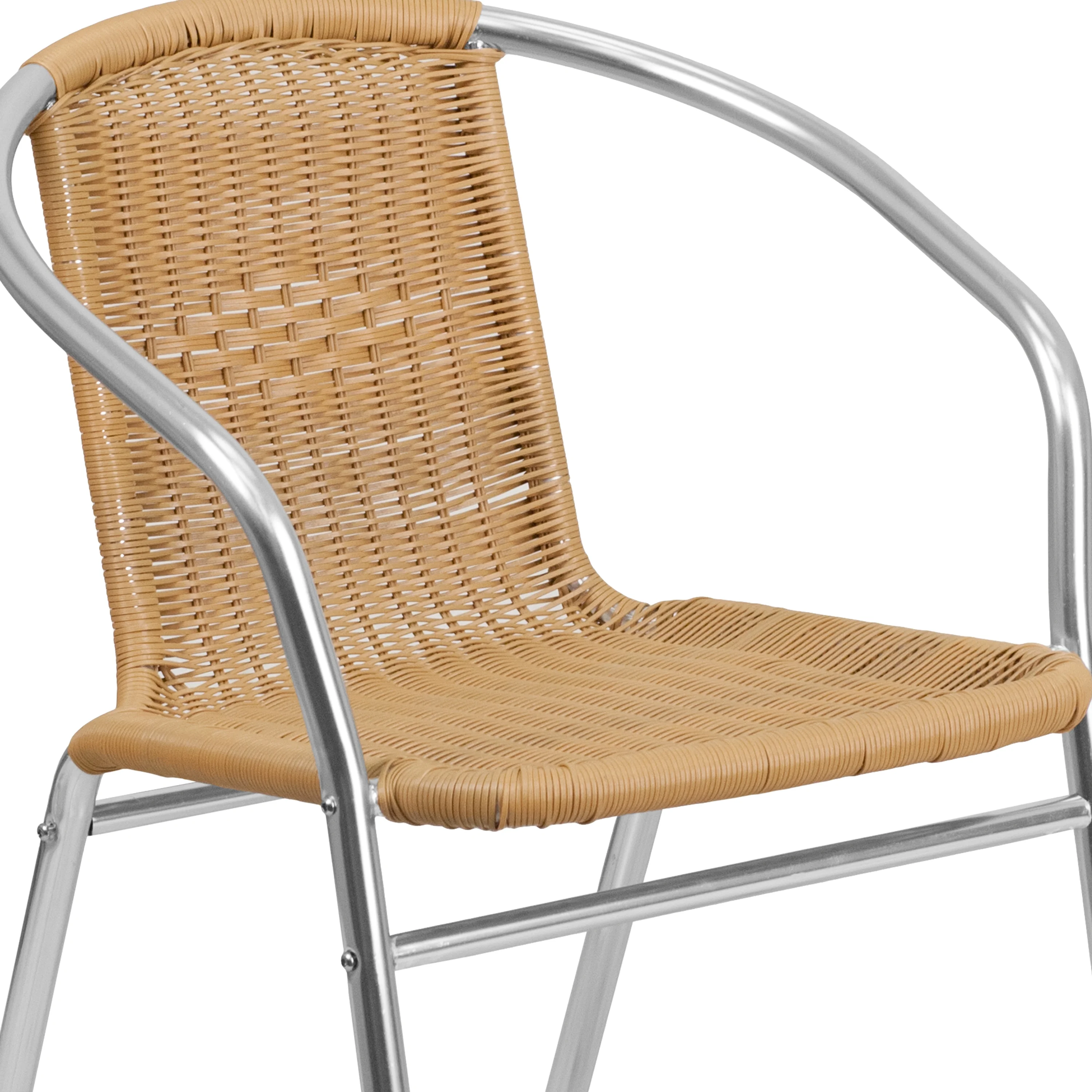 Dine outdoors in this comfortable indoor-outdoor stack chair for your patio or deck and commercial restaurant or hospitality business. This lightweight, aluminum chair features a comfortable, all weather beige rattan seat and back, elegantly curved integrated arms and sturdy legs. Support braces under the seat add increased strength and stability. In fact, this sturdy chair will hold up to 352 pounds. Plastic floor glides protect your floors by sliding smoothly when you need to move the chair. They can be stacked up to 20 chairs high to transport and store. Designed for both commercial and residential use, this stylish rattan stack chair is a great choice for your restaurant’s outdoor dining area or your kitchen at home. Pair this chair with a glass or metal table to complete your setting.