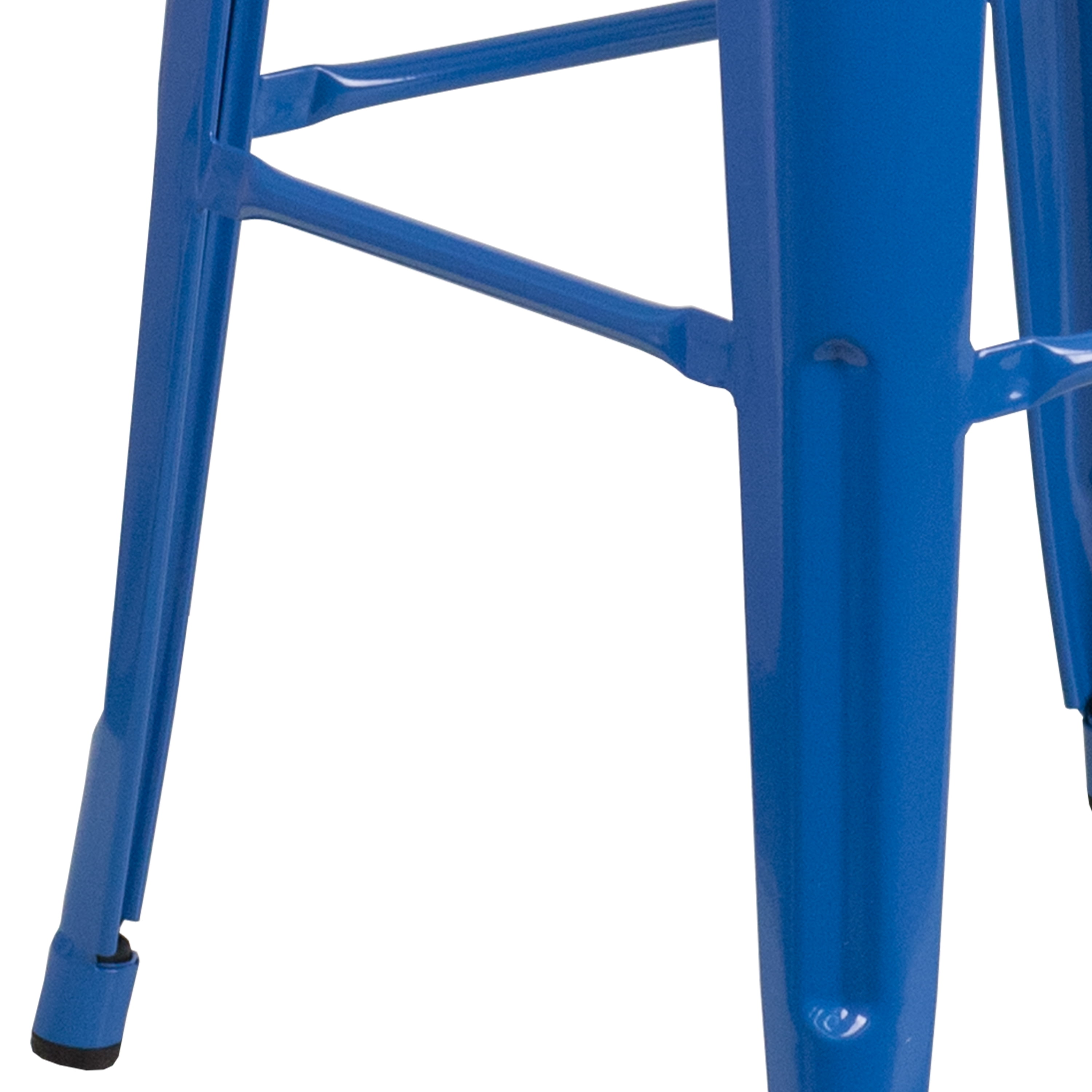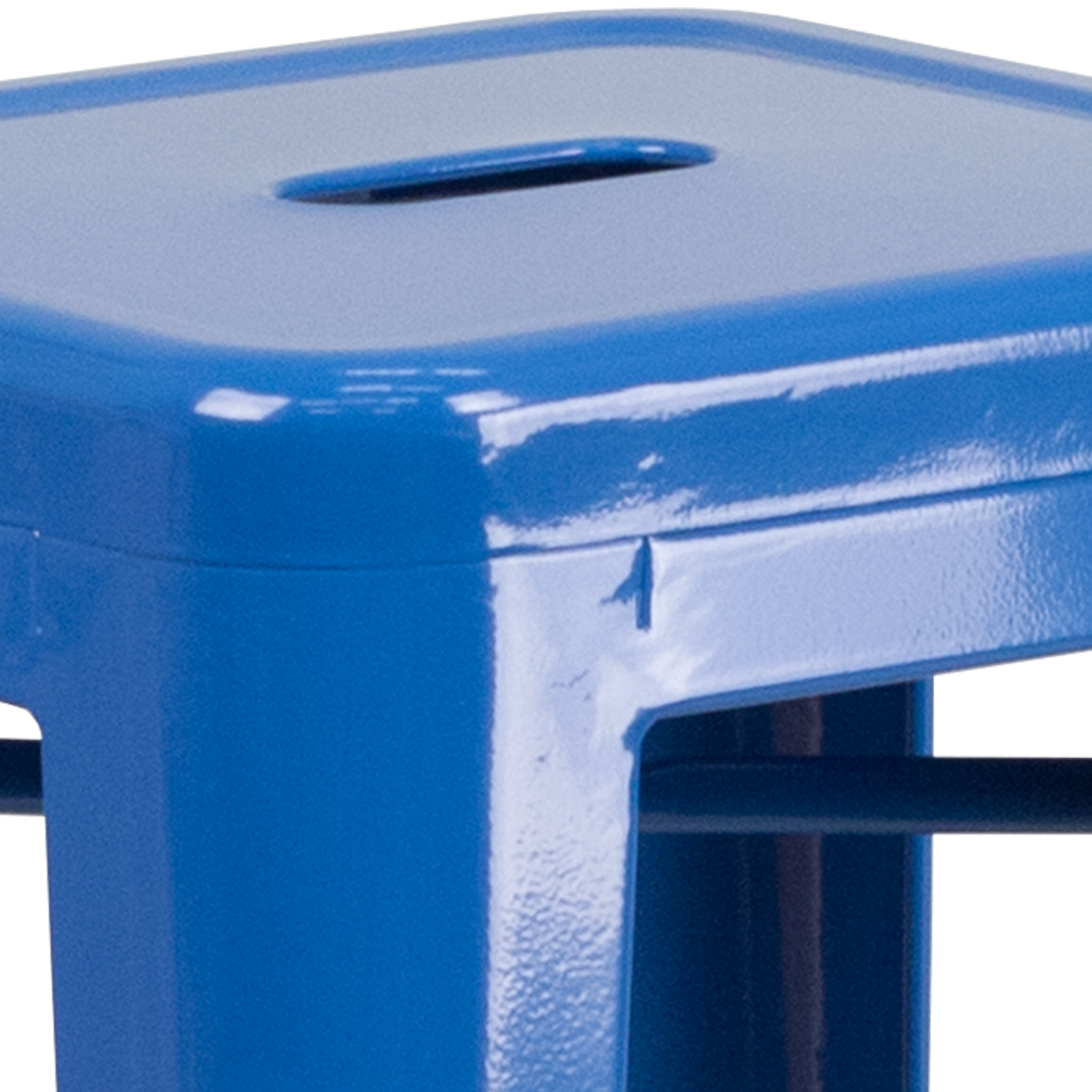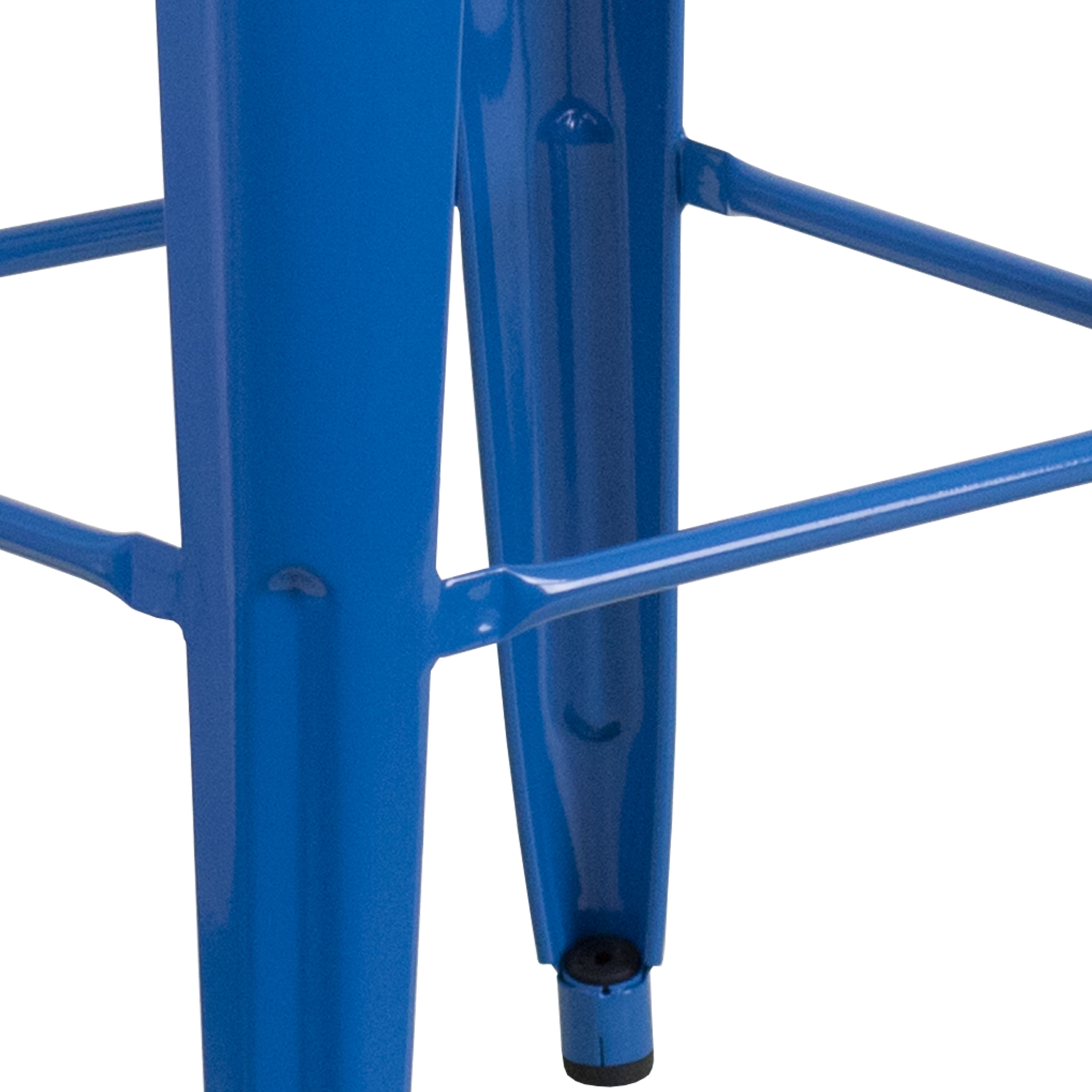 Set of 4 Industrial Backless Bar Height Stools for Indoor or Outdoor Use 500 lb. Weight Capacity Stack Quantity: 4-8 12″ Seat Width with Drain Hole to assist with drying Plastic Caps on cross brace protect finish when stacked Galvanized Steel Blue Powder Coated Frame Finish Footrest promotes better sitting experience Floor Glides to protect floors when used indoors Quality constructed metal stool, lightweight for ease of movement Metal Stack Stool for kitchen, dining room, bar, patio, pool, restaurant or game room