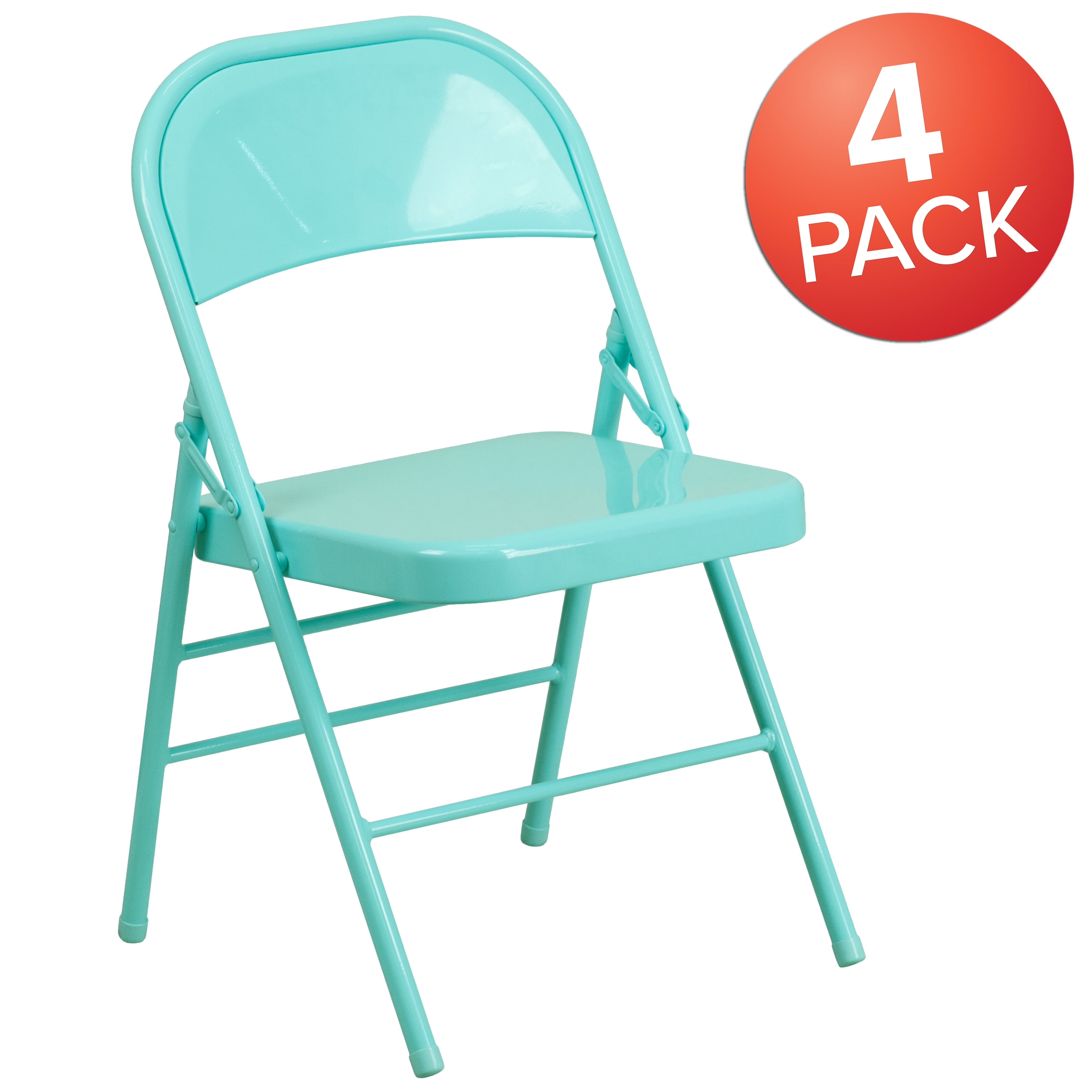 Flash Furniture 4 Pack HERCULES COLORBURST Series Tantalizing Teal Triple Braced & Double Hinged Metal Folding Chair Set of 4 Contemporary Metal Folding Chairs for commercial and residential use Tantalizing Teal Frame Finish looks great year after year Triple Braced and Double Hinged Frame for a worry free sitting experience Riveted Steel Components for strength and durability 18 Gauge Steel Frame supports up to 300 lbs weight capacity Lightweight Design for storage, transport or flooring maintenance Folded Size: 18″W x 3″D x 38.5″H Non-Marring Floor Glides prevent streaks or other damage to hard flooring surfaces Suitable for indoor-outdoor use; Store indoors to protect frame from excessive moisture No Assembly Required PRODUCT MEASUREMENTS: Overall Size: 18″W x 19″D x 30.5″H;Folded Size: 18″W x 3″D x 38.5″H;Seat Size: 15.75″W x 15.75″D x 17″H;Back Size: 18″W x 15″H; No Assembly Required