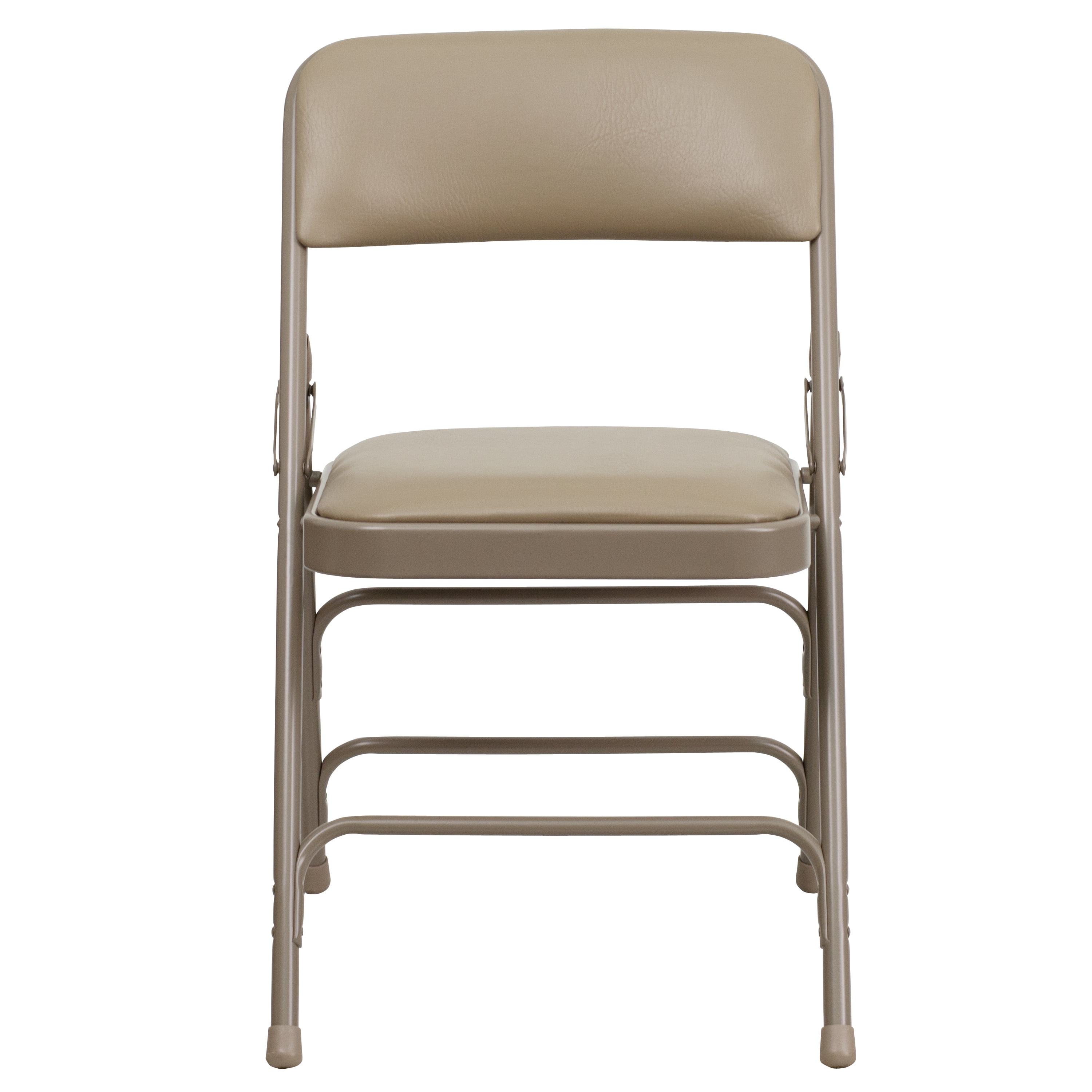 Set of 4: Padded Metal Folding Chair 300 lb. Weight Capacity Beige Vinyl Upholstery 1 in Thick Padded Seat with CAL 117 Foam Curved Triple Braced and Double Hinged Frame 18 Gauge Steel Frame Beige Powder Coated Frame Finish with Non-Marring Floor Glides Designed for Commercial or Residential Use Folded Size: 18.5 in W x 3 in D x 39 in H Top Review: I can’t say enough nice things about these chairs. They are sturdier than I even thought they would be. I’m disabled now and I often need to sit down after I have crossed the room or going from one room to another