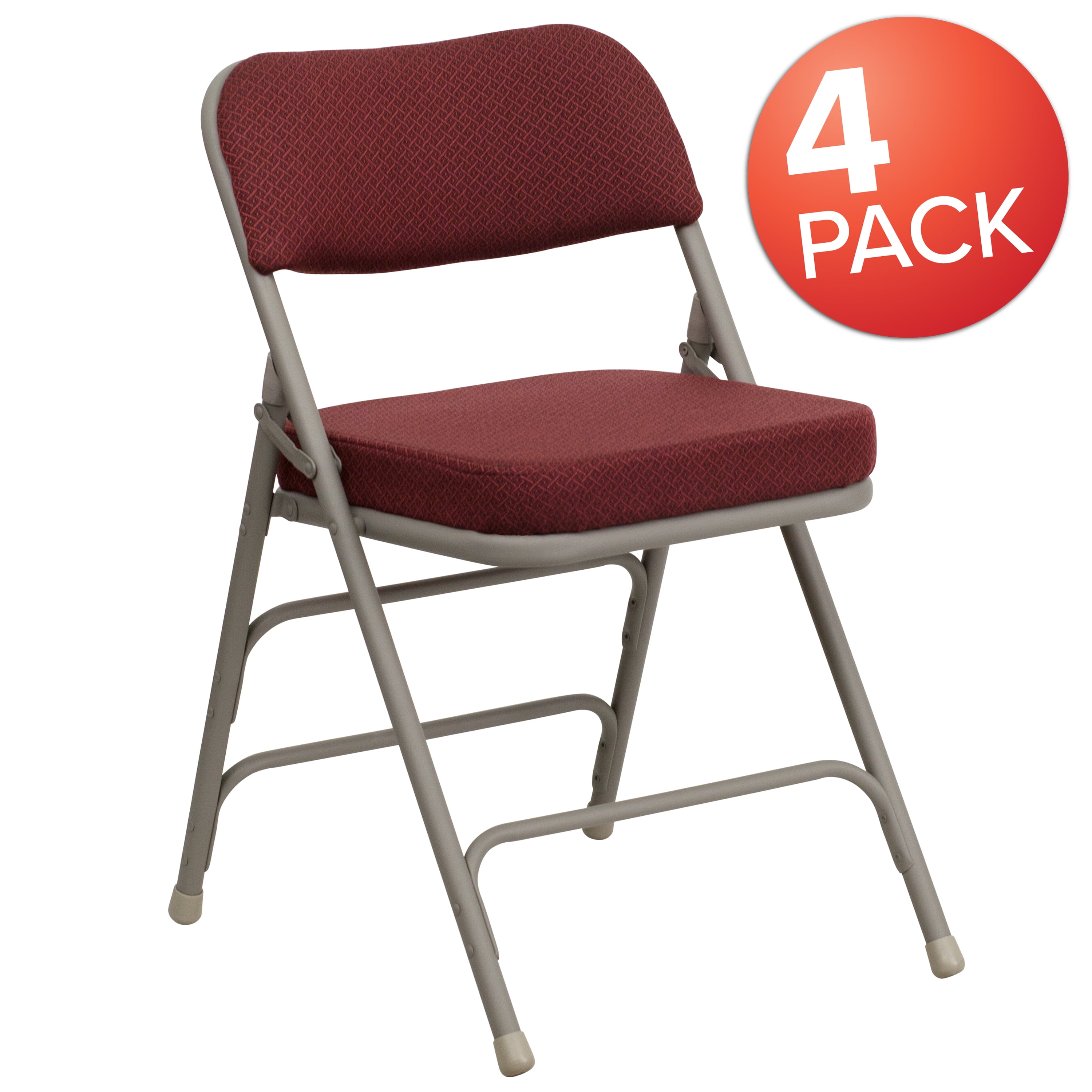 Set of 4: Padded Metal Folding Chair 300 lb. Weight Capacity Burgundy Fabric Upholstery 2.5″ Thick Padded Seat with CAL 117 Foam Curved Triple Braced and Double Hinged Frame 18 Gauge Steel Frame Gray Powder Coated Frame Finish with Non-Marring Floor Glides Designed for Commercial or Residential Use Folded Size: 18.5″W x 4″D x 37.5″H Top Review: Needed additional chairs for String group rehearsal and Performances. They raved about the support and comfort of the chairs and they stopped bringing cushions that they used on the old chairs. PRODUCT MEASUREMENTS: Overall Size: 18.5″W x 19″D x 29″H; Folded Size: 18.5″W x 4″D x 37.5″H; Seat Size: 15.75″W x 15.75″D x 18.75″H; Back Size: 18″W x 14.5″H