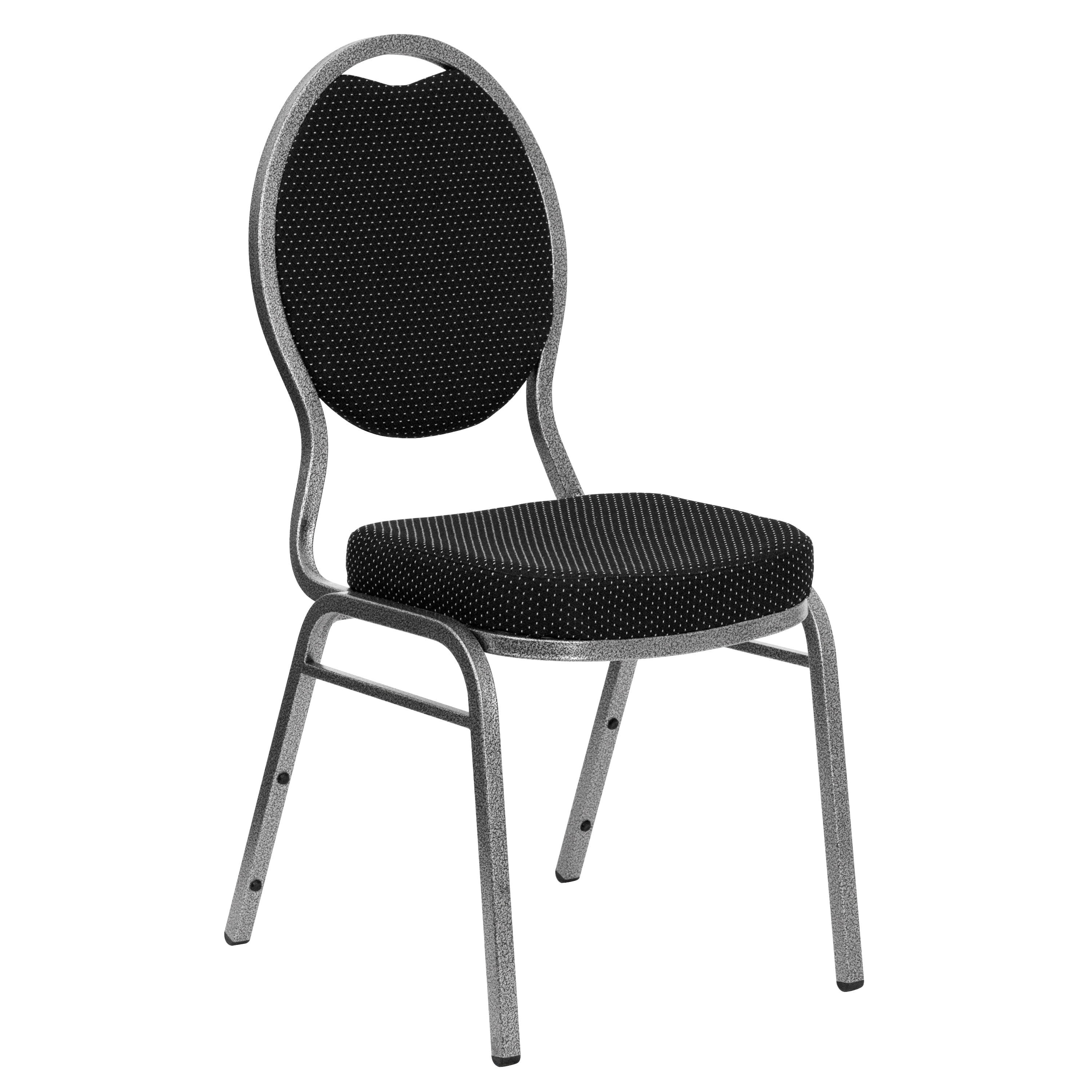 Set of 4 Multipurpose All Occasion Banquet Chairs 500 lb. Weight Capacity Stack Quantity: 15 Teardrop Back Design Black Patterned Fabric Upholstered Back and Seat with Seamless Back Panel 2.5″ Thick Seat Cushion with CAL 117 Fire Retardant Foam 16 Gauge Steel Frame, Silver Vein Powder Coated Frame Finish, Double Support Braces Plastic Bumper Guards protect finish when stacked, Floor Protector Plastic Glides Designed for Commercial Use; Suitable for Home Use Limited Lifetime Warranty on Frame, Ships Fully Assembled