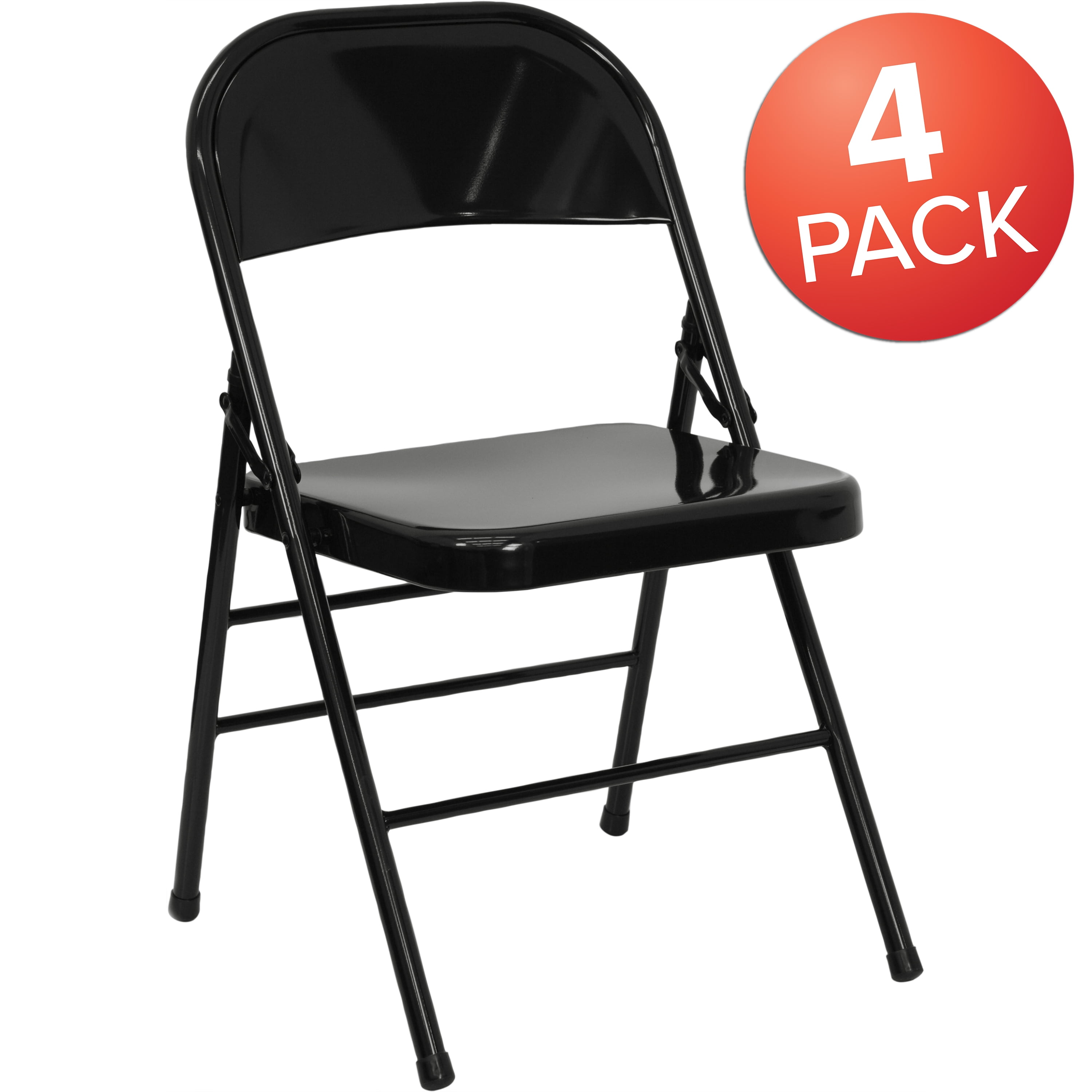 Flash Furniture 4 Pack HERCULES Series Triple Braced & Double Hinged Black Metal Folding Chair Set of 4 Contemporary Metal Folding Chairs for commercial and residential use Black Frame Finish looks great year after year Triple Braced and Double Hinged Frame for a worry free sitting experience Riveted Steel Components for strength and durability 18 Gauge Steel Frame supports up to 300 lbs weight capacity Lightweight Design for storage, transport or flooring maintenance Folded Size: 18″W x 3″D x 38.25″H Non-Marring Floor Glides prevent streaks or other damage to hard flooring surfaces Suitable for indoor-outdoor use; Store indoors to protect frame from excessive moisture Heavy duty steel seating ideal for training rooms, school cafeterias and event venues or extra seating in the home PRODUCT MEASUREMENTS: Overall Size: 18.5″W x 19″D x 30″H;Folded Size: 18.5″W x 3″D x 38.25″H;Seat Size: 15.75″W x 15.75″D x 16.5″H;Back Size: 18″W x 14.5″H
