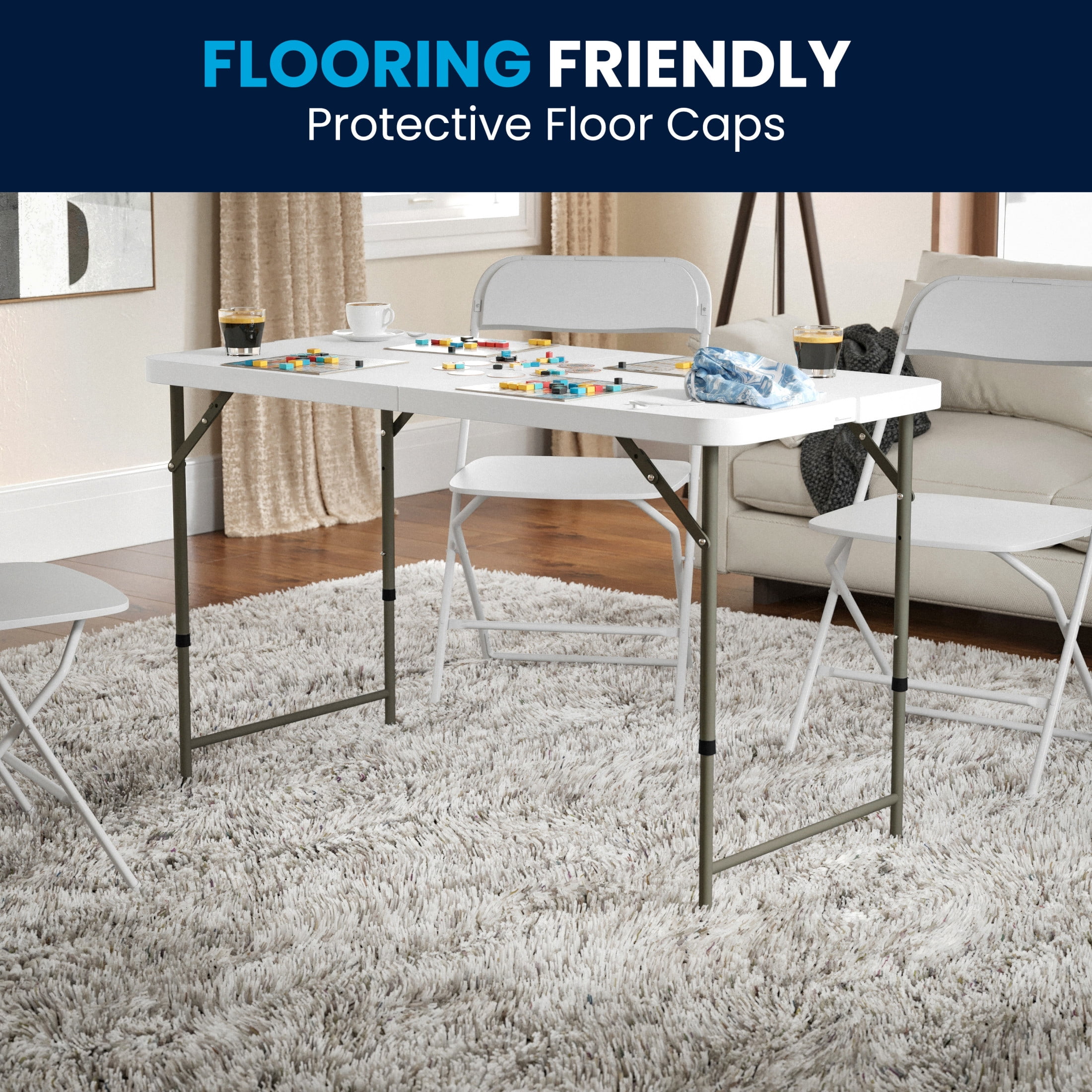 Flash Furniture 4′ Rectangular Height Adjustable Indoor/Outdoor Plastic Folding Event Table, White Great for a variety of indoor or outdoor home, school, or business events Comfortably seats up to 4 people Convenient foldable design allows for easy transportation and compact storage Can be used as is or dressed up with a tablecloth to achieve a custom look Protective non-marring floor caps Waterproof and impact and stain-resistant tabletop Durable gray powder-coated locking legs are height adjustable No assembly required; clean with a damp cloth as needed Supports up to 330 lbs. of static weight NO ASSEMBLY REQUIRED: Supports up to 330 lbs. of static weight and measures 23.75″W x 47.75″D x 23-29.25″H with no assembly required, so you can start setting up for events right away