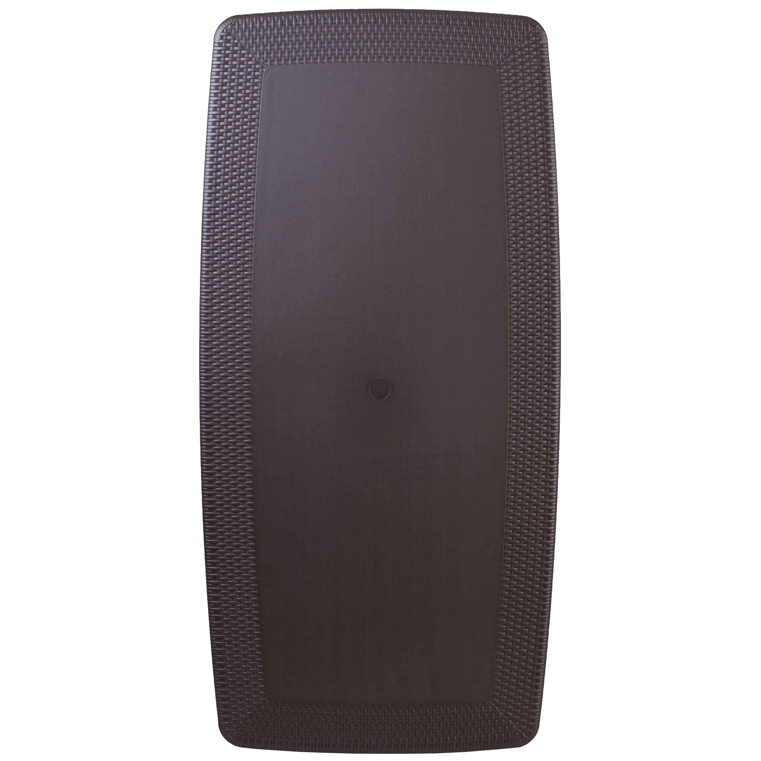 This attractively designed folding table will add some pizzazz to your residential or commercial space. The table top features a decorative rattan border. The center umbrella hole has a cap to cover the hole for a clean surface appearance when an umbrella isn’t inserted. The dark surface blends with a variety of decor. Stow it out of the way when not in use, and easily set it up when needed for a holiday dinner, buffet, garage sale, or any other activity. You’ll turn to this table for help over and over again.
