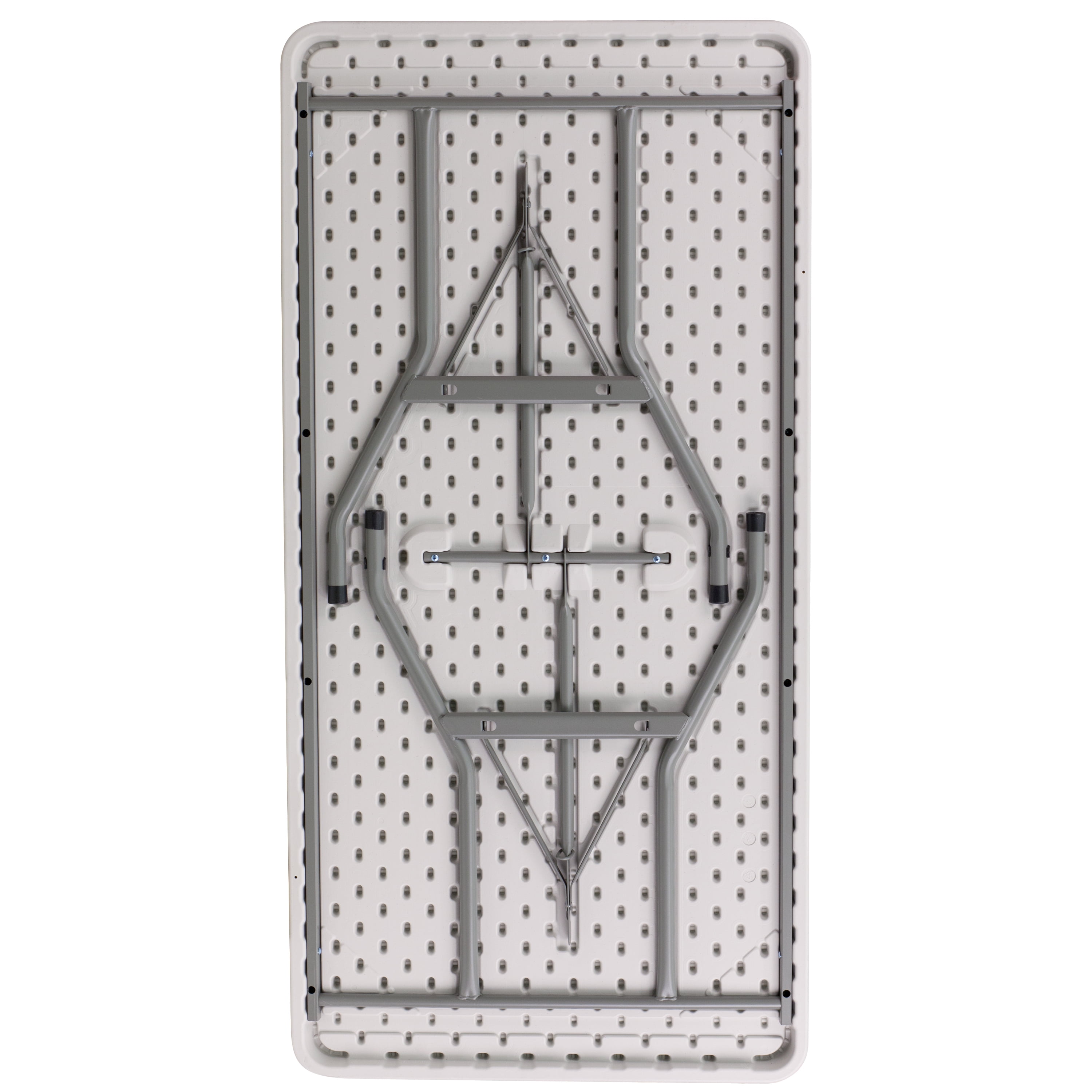 Rectangular folding tables are essential to anyone who setup displays to promote their products or hosts parties regularly. This 5′ long banquet folding table fits well in classrooms for team building exercises and computer lab work. The table can fit up to 6 people for collaborative learning sessions among students. This commercial grade folding table is often used in banquet halls, warehouses, conference centers, and at trade shows. Caterers will have ample space to layout meals for guests to be served, cover up with white linen for a professional appearance. Your floors remain scratch-free with the included protective floor caps. Once you’re done the legs lock underneath the tabletop to be transported and stored away. Easy to clean and store, plastic folding tables are the best and most popular option for any occasion. Although designed for indoor events this party table can be used outdoors on the deck or patio during good weather. Store the table indoors and protect the frame from extreme moisture. Get your ready to use rectangular folding table for your home or business today.