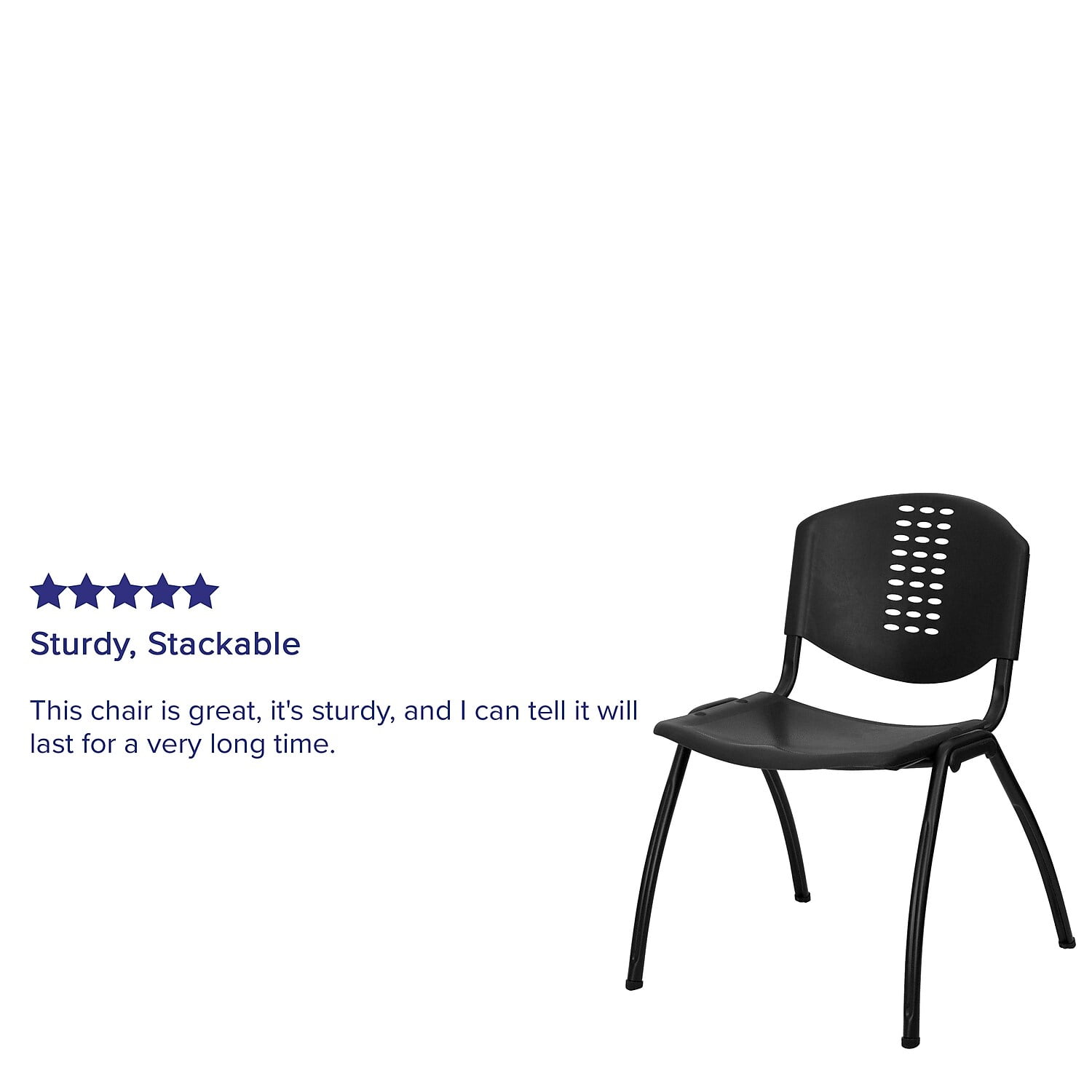 Set of 5 Multipurpose Stack Chairs 880 lb. Weight Capacity Stack Quantity: 20 Ergonomically Contoured Design with Black Plastic Back and Seat Perforated Back allows air circulation Textured Seat ensures safe seating Black Powder Coated Frame Finish with Plastic Glides Limited Lifetime Warranty on Frame Designed for Commercial Use Ships Fully Assembled PRODUCT MEASUREMENTS: Overall Size: 18″W x 16″D x 29.75″H; Seat Size: 18.25″W x 16″D x 16.75″H; Back Size: 18″W x 12.75″H