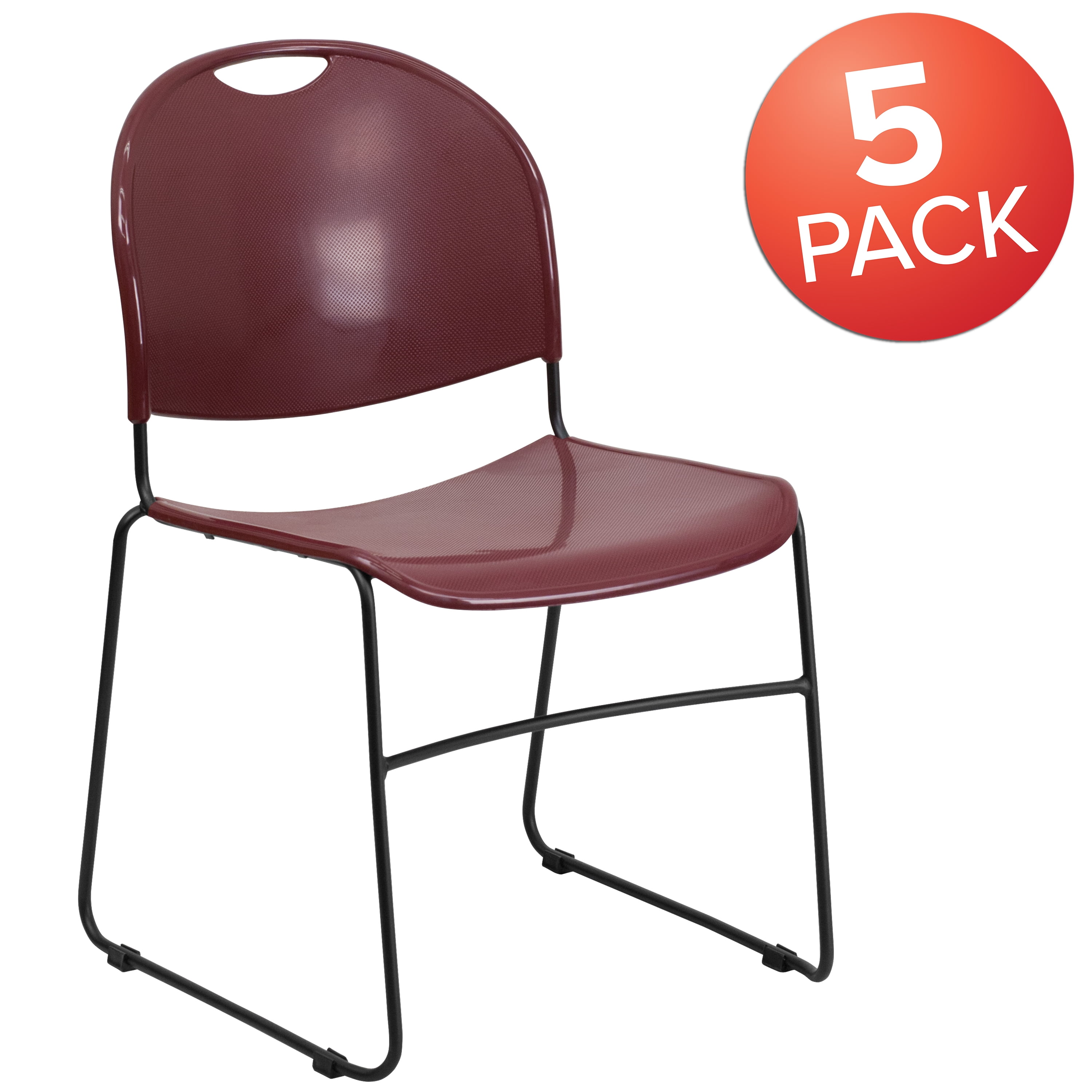 Flash Furniture 5 Pack HERCULES Series 880 lb. Capacity Burgundy Ultra-Compact Stack Chair with Black Powder Coated Frame Set of 5 Multipurpose Stack Chairs 880 lb. Weight Capacity Stack Quantity: 35 Ergonomically Contoured Burgundy Plastic Back and Seat Carrying Handle to better transport No-Fade Infused Polypropylene Material 15 Gauge Steel Frame Black Sled Base Frame with non-marring plastic floor glides Limited Lifetime Warranty on Frame Ships Fully Assembled PRODUCT MEASUREMENTS: Overall Size: 19″W x 21″D x 32″H; Seat Size: 17.75″W x 17″D x 17″H; Back Size: 17.5″W x 16″H