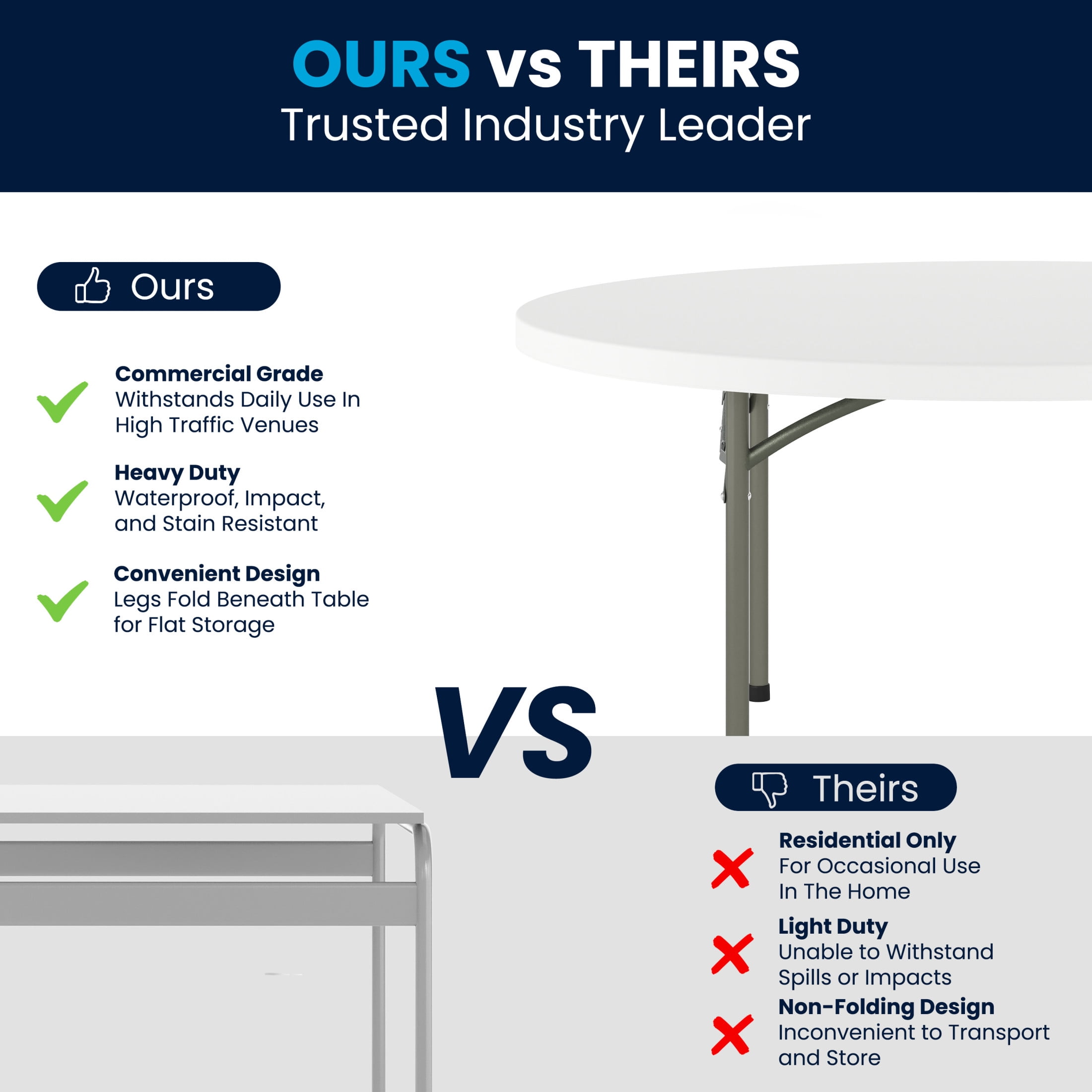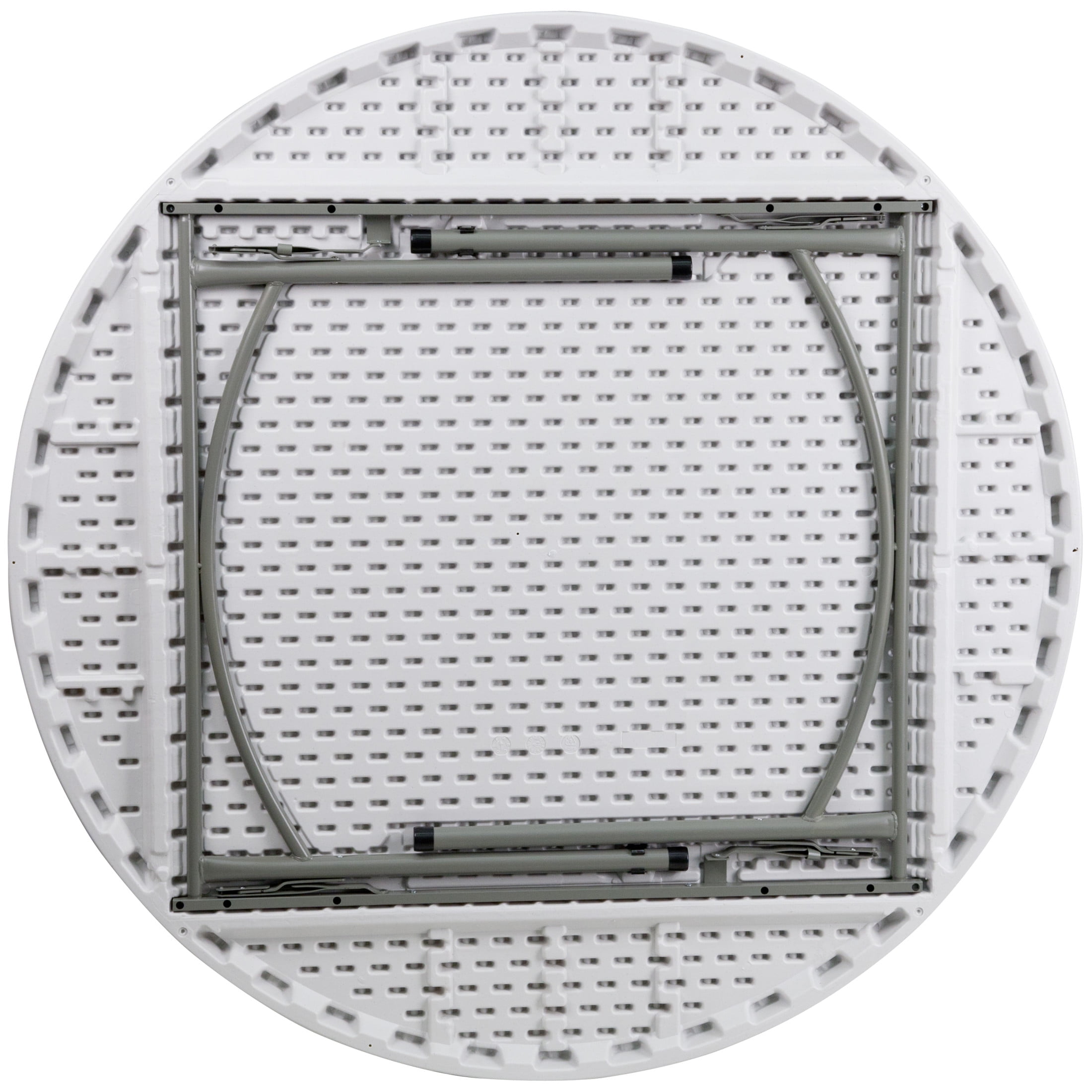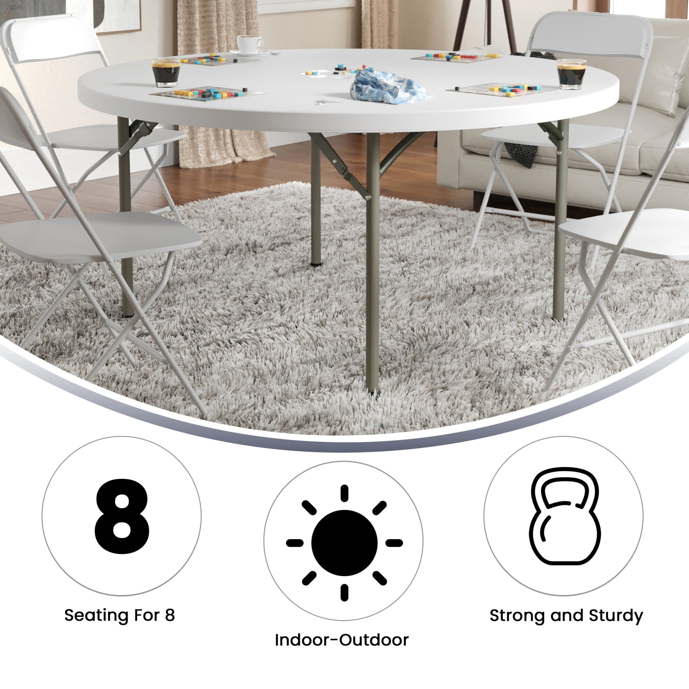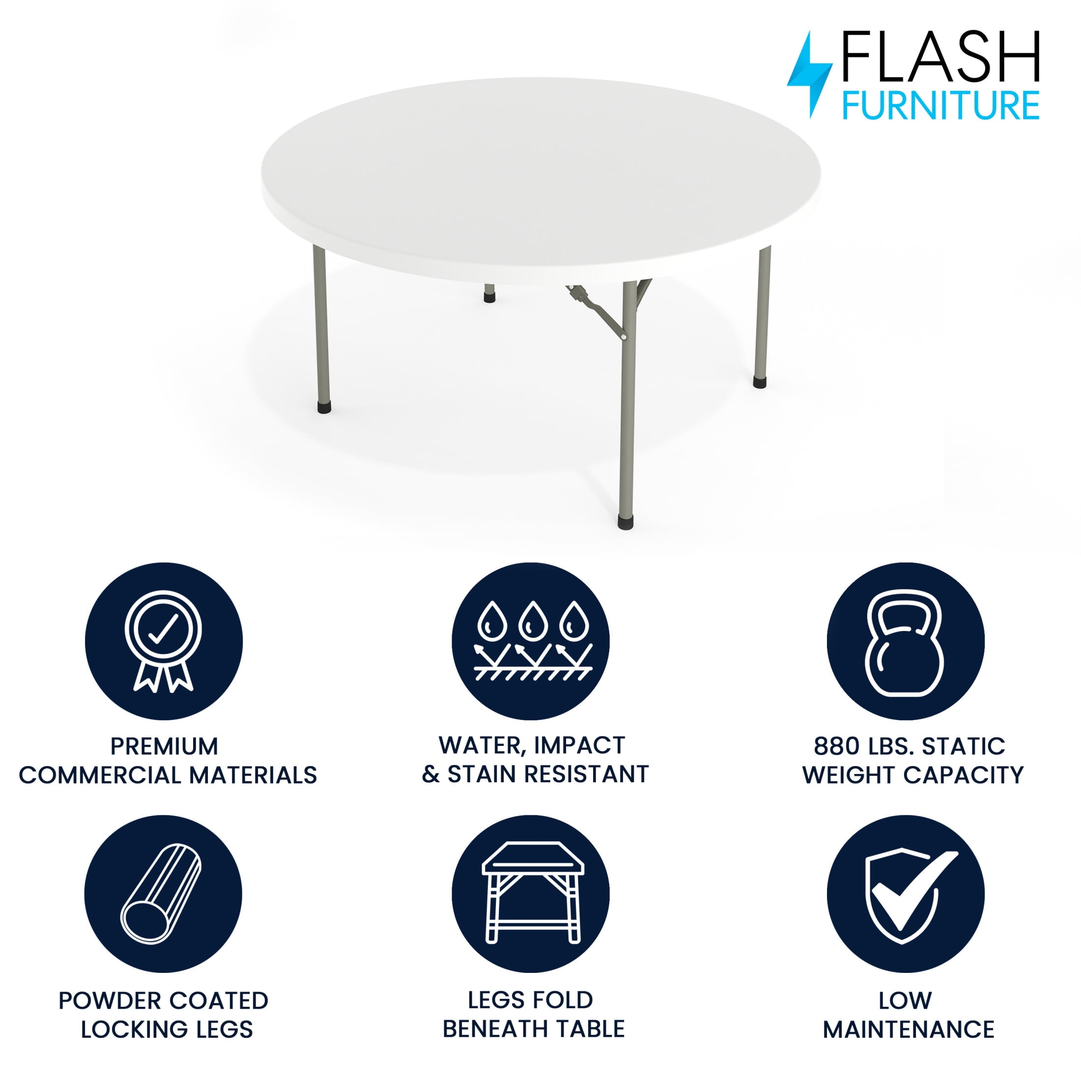 Flash Furniture 5′ Round Indoor/Outdoor Plastic Folding Event Table, White Great for a variety of indoor or outdoor home, school, or business events Comfortably seats up to 8 people Convenient foldable design allows for easy transportation and compact storage Can be used as is or dressed up with a tablecloth to achieve a custom look Protective non-marring floor caps Waterproof and impact and stain-resistant tabletop Durable gray powder-coated locking legs No assembly required; clean with a damp cloth as needed Supports up to 880 lbs. of static weight NO ASSEMBLY REQUIRED: Supports up to 880 lbs. of static weight and measures 59.75″ W x 59.75″ D x 28.75″ H with no assembly required, so you can start setting up for events right away