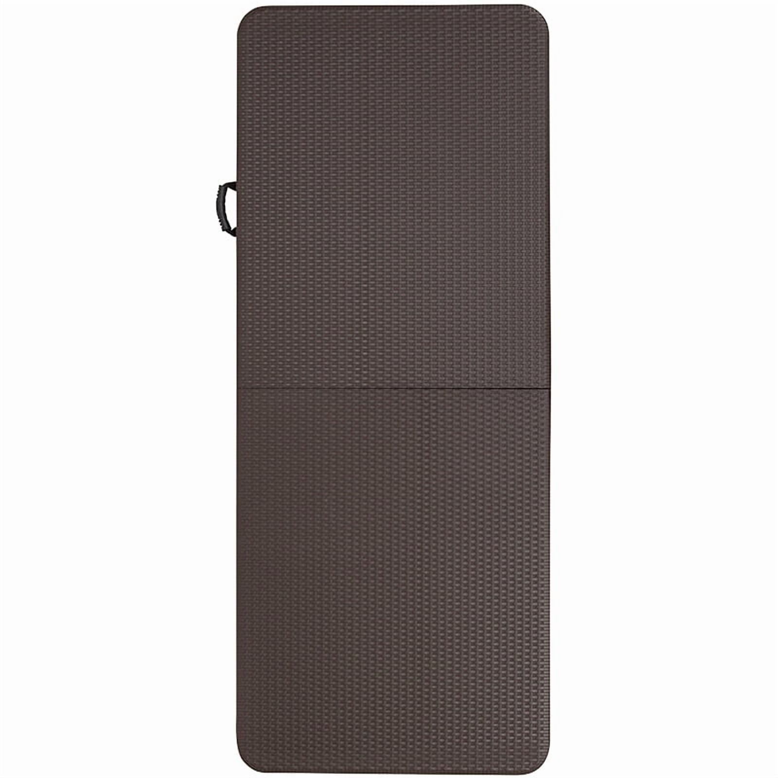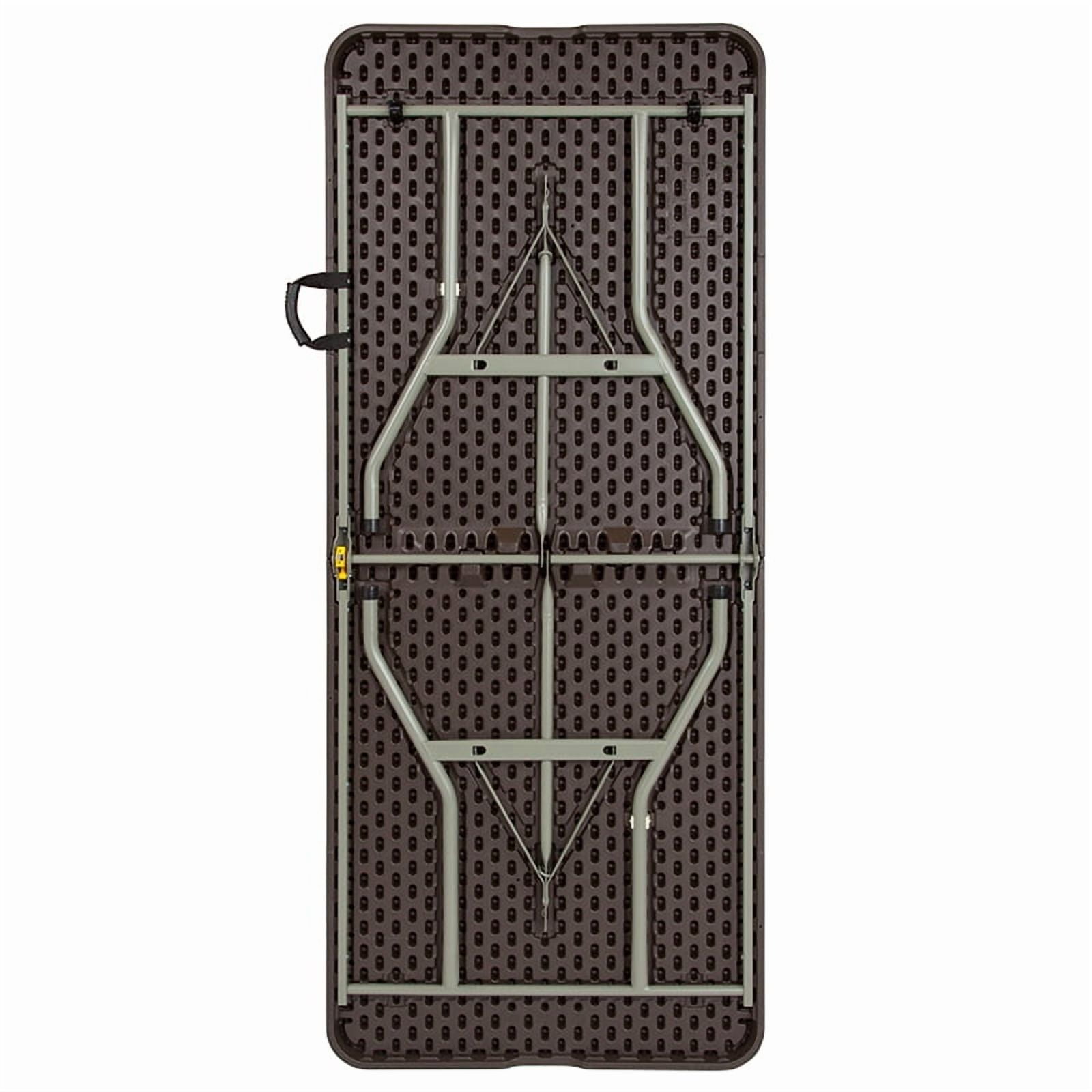 Ready To Use Residential and Commercial Plastic Patio Table 6′ Folding Table Seats up to 6 Adults 330 lb. Static Load Capacity 1.5″ Thick Brown Table Top with Decorative Rattan Edge Border Folds in half for storage and travel Includes convenient carrying handle Gray Powder Coated Locking Legs with protective floor caps Legs fold underneath top for flat storage Designed for Indoor and Outdoor Use