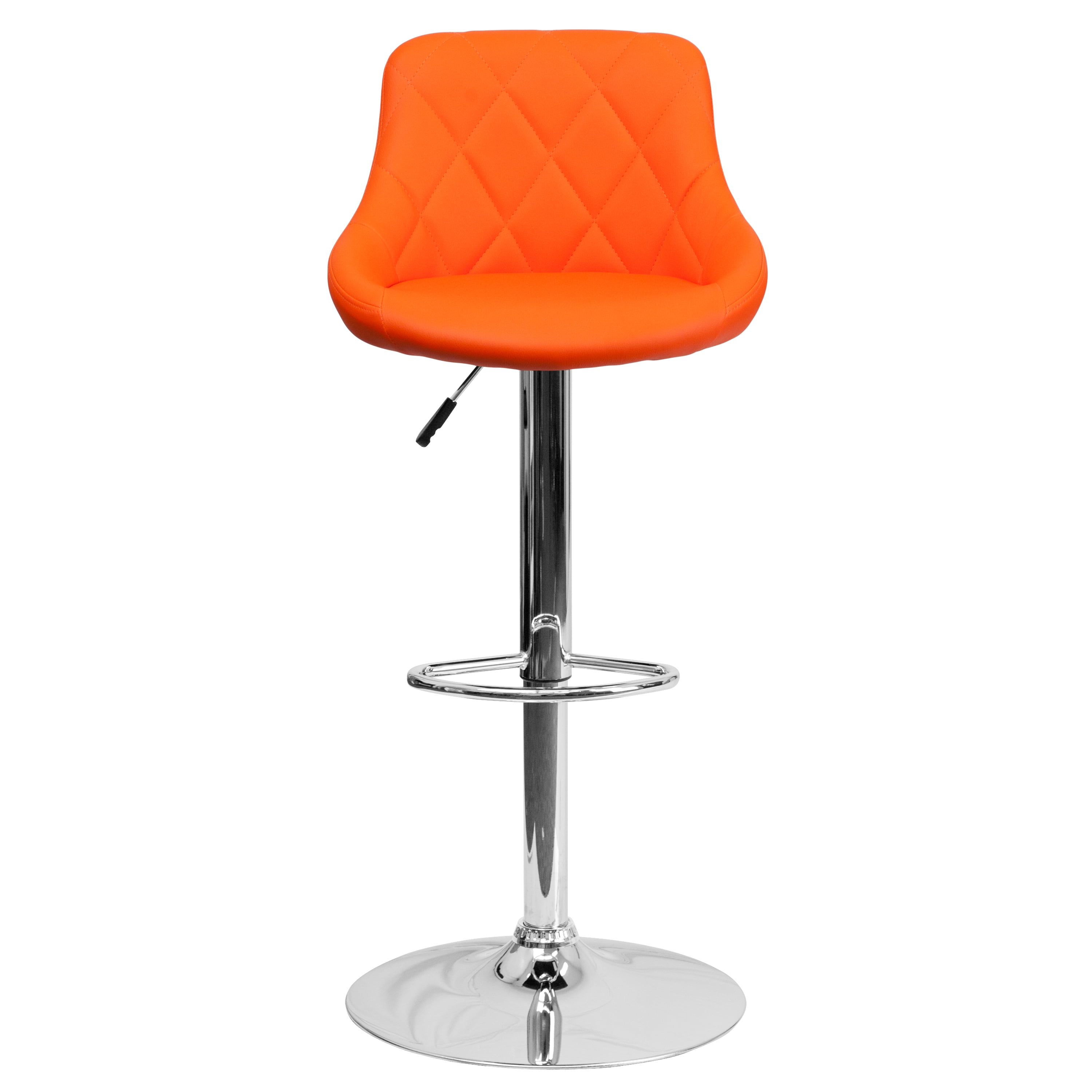 Classic style with a little zing perfectly describes this orange upholstered adjustable height barstool with a diamond patterned back. A bucket seat design will make this a great accent chair around the bar area or kitchen and the easy to clean vinyl upholstery is an added bonus. The height adjustable swivel seat adjusts from counter to bar height with the handle located below the seat while the chrome footrest supports your feet while also providing a contemporary chic design. To help protect your floors, the base features an embedded plastic ring.