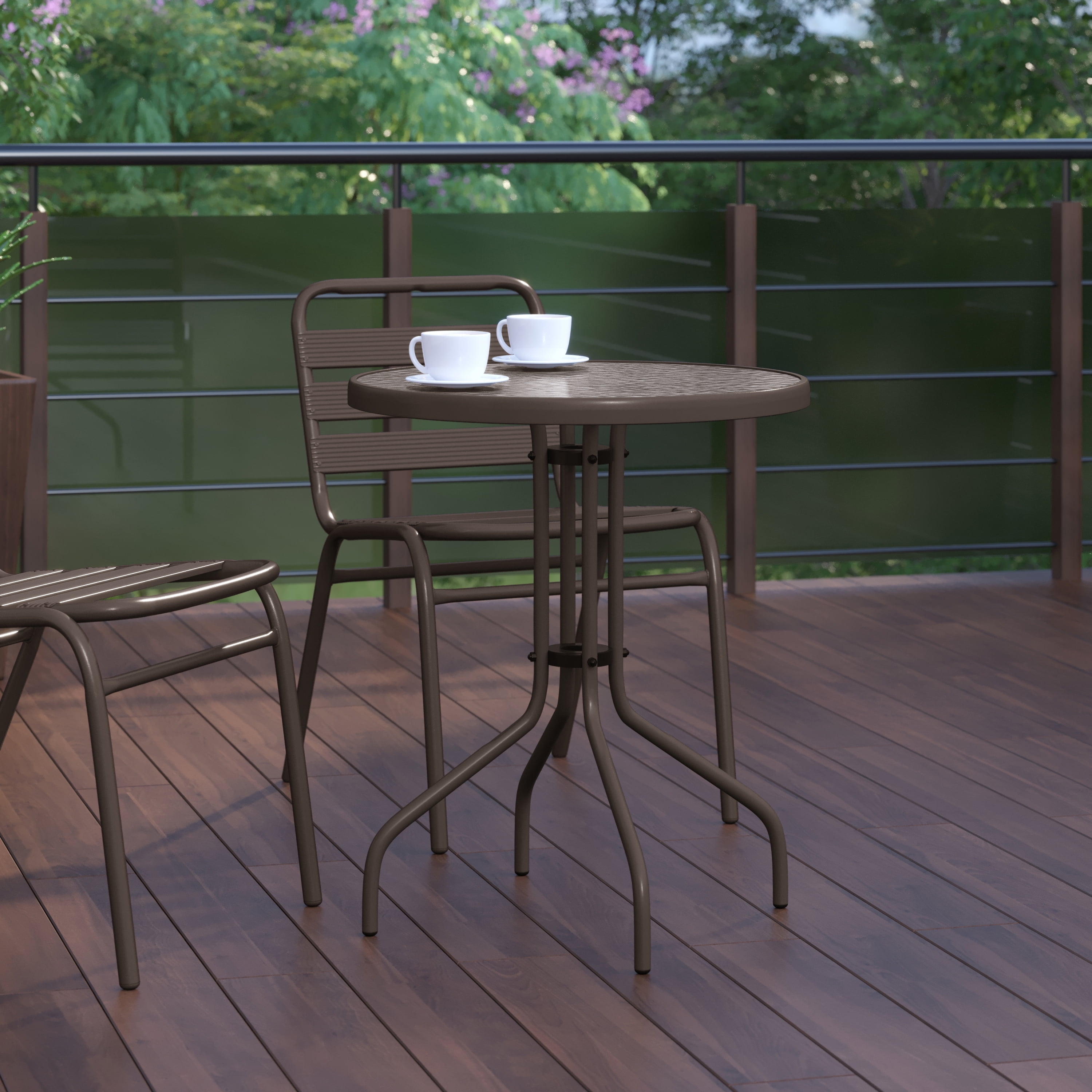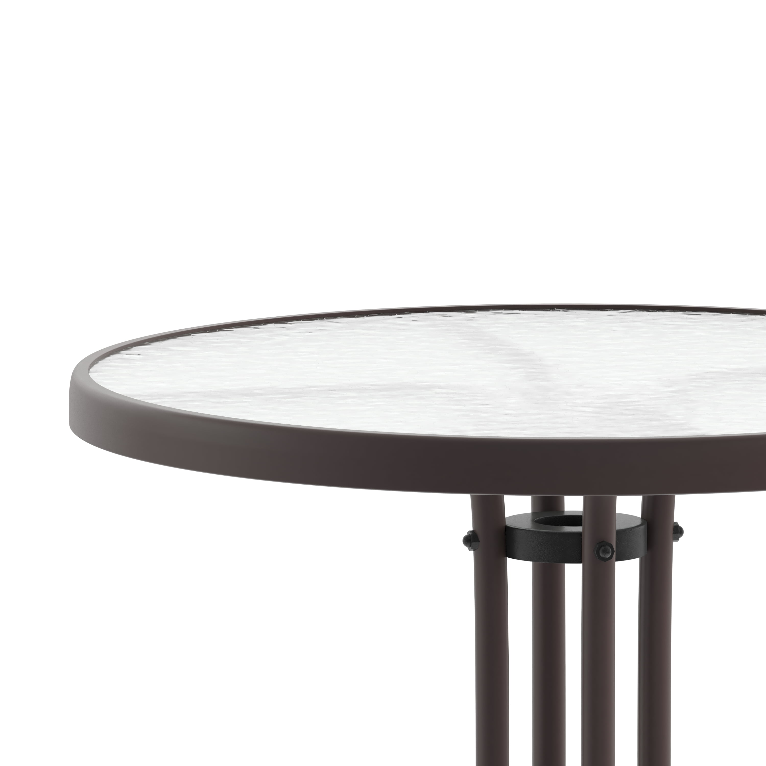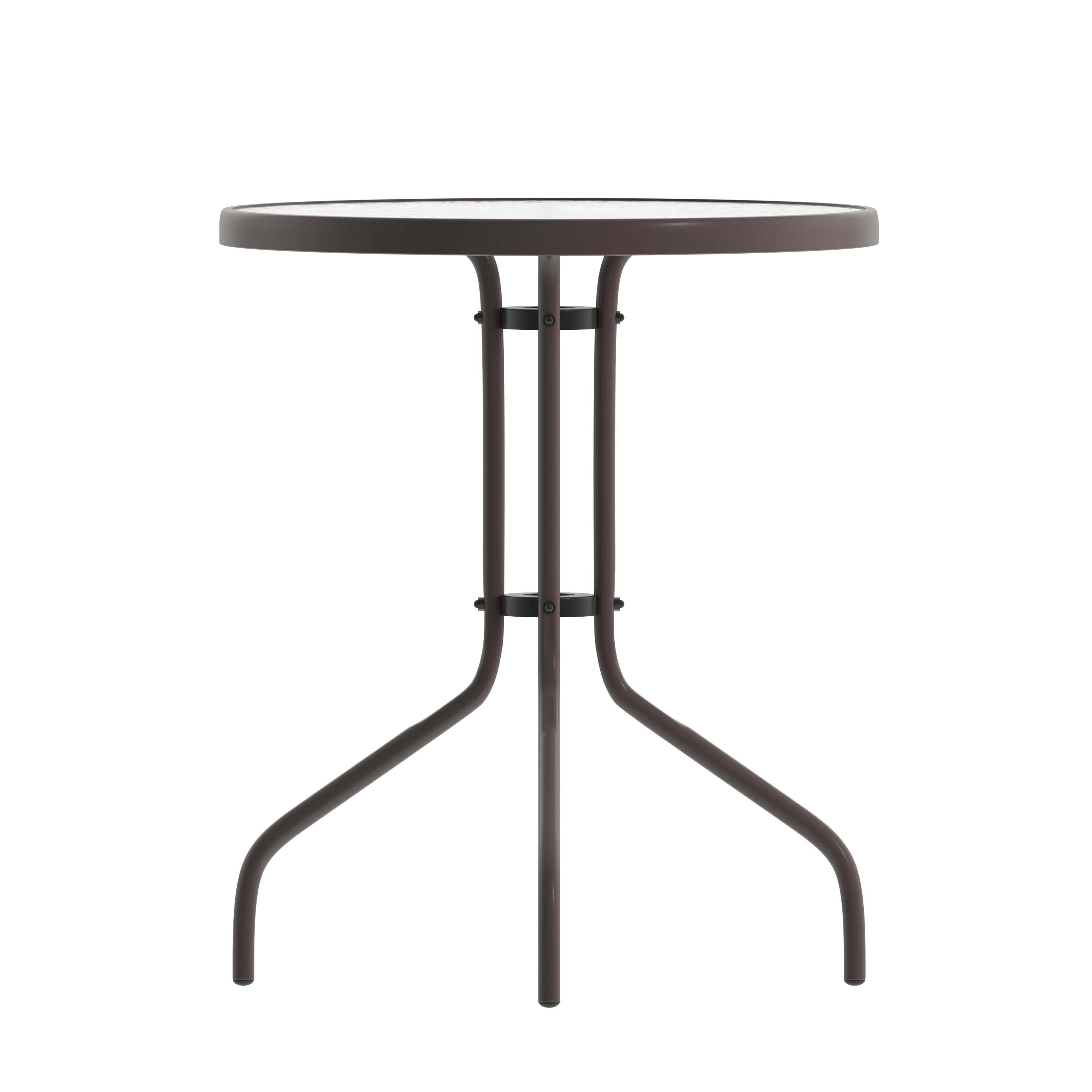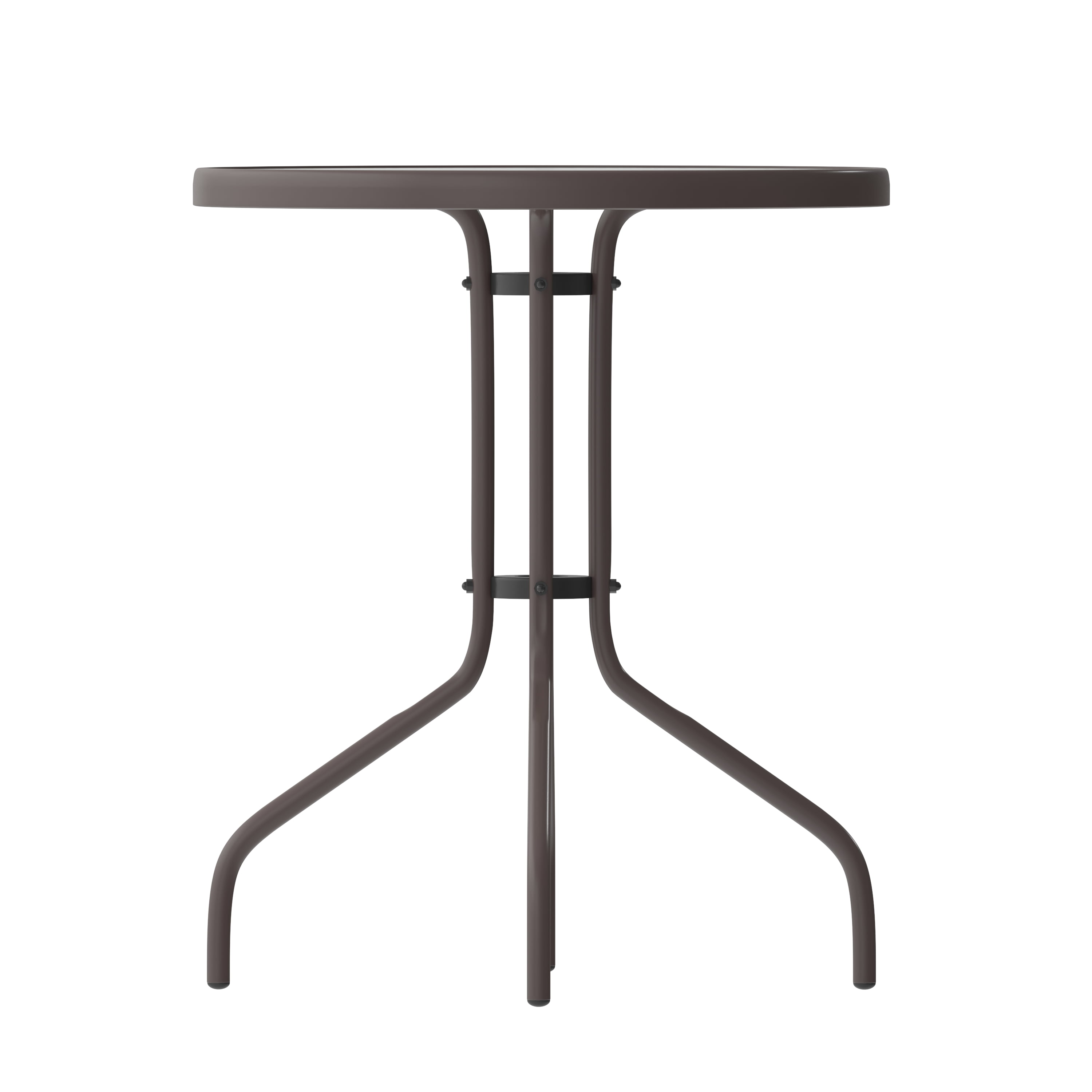 Flash Furniture Bellamy 23.75” Bronze Round Tempered Glass Metal Table All Occasion Round Table Top with Base Top Size: 23.75″ Round Base Size: 17″W Clear Tempered Glass Surface 5mm Thick Glass 1.25″ Edge Top Bronze Powder Coat Finish Protective Plastic Floor Glides Designed for Indoor and Outdoor Use Designed for Commercial and Residential Use PRODUCT MEASUREMENTS: Overall Size: 23.75″W x 23.75″D x 28″H