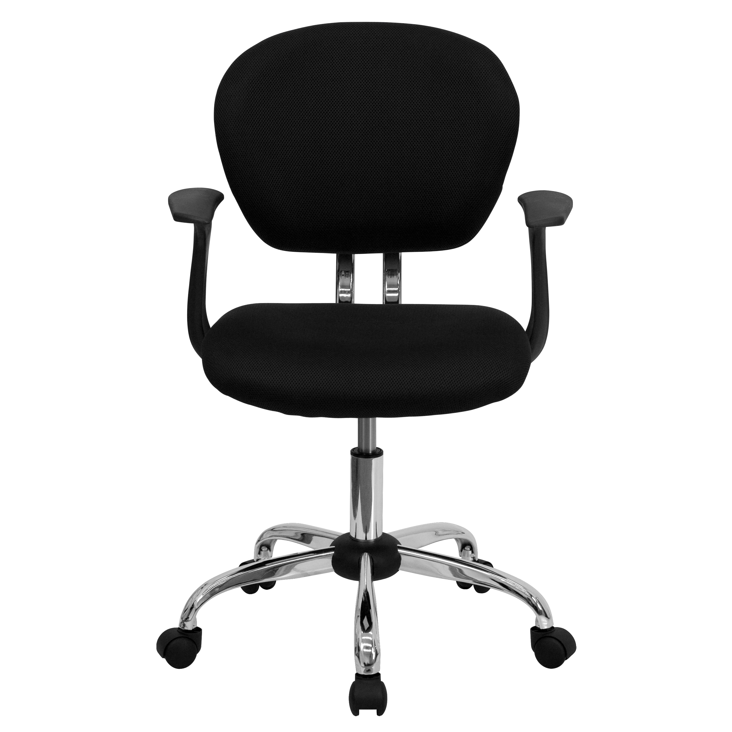 Flash Furniture Beverly Mid-Back Black Mesh Padded Swivel Task Office Chair with Chrome Base and Arms Modern Armless Task Chair with Arms Black Mesh Upholstery Mid-Back Design Contoured Seat with CAL 117 Fire Retardant Foam 360 Degree Swivel Seat Pneumatic Seat Height Adjustment 5-Star Chrome Base with Dual-Wheel Casters Make your workplace, dorm room or kids room fun with colorful desk chairs PRODUCT MEASUREMENTS: Overall Size: 23.5″W x 25.5″D x 33.5-37.5″H; Seat Size: 18.75″W x 17″D x 17.25-21″H; Back Size: 18.25″W x 17″H; Arm Size: 25.25-29″H from floor; 7″H from seat