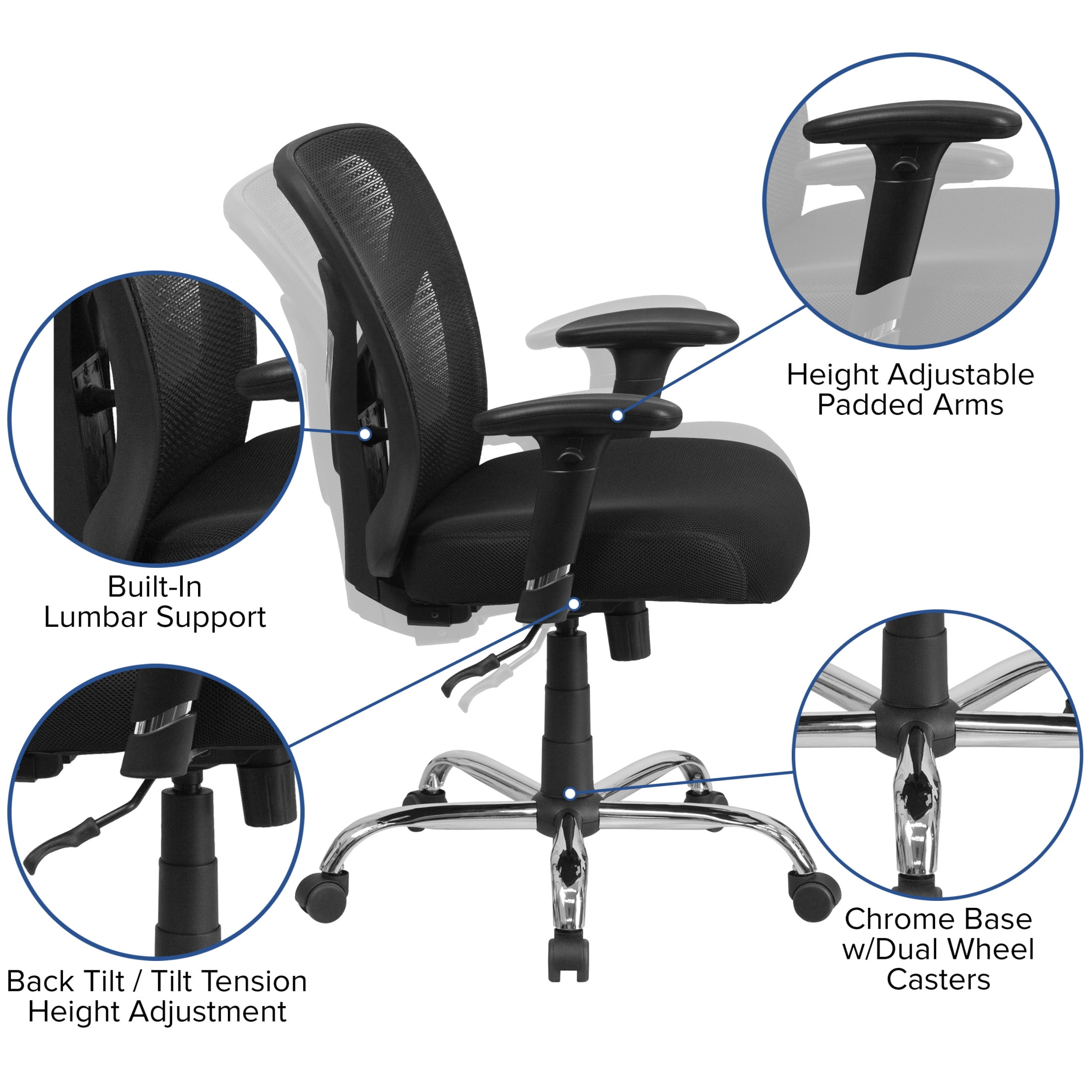 Stay comfortable during those long days at the office with a big and tall desk chair. Designed to support larger and taller body types, our mesh office chair has a tested weight capacity of up to 400 pounds to ensure a comfortable seating option for everyone. Discover the structure you need with a mid-back office chair with built-in lumbar support and an adjustable back. The gently contoured backrest shape lends additional comfort, with a ventilated mesh back design that provides plenty of airflow during your workday. Enjoy a plush construction with a broad-width padded seat featuring a waterfall front edge to help alleviate pressure on your lower legs. The gentle design allows for greater circulation while seated, dissipating pressure points for long hours spent at your desk. A pneumatic adjustment lever underneath the seat lets you fit your chair to your preferred height, making it easy to create a comfortable fit for a variety of tasks. Reduce strain while working with an office desk chair that includes adjustable armrests. The supportive construction helps to reduce the pressure on your shoulders and neck, creating a more relaxed office experience. Conveniently reach anything in your office with 360 degrees of swivel motion. The base of the adjustable office chair includes five wheels for smooth rolling and a bright chrome finish for a touch of style. Find the perfect big and tall office chair with sleek executive style. The black upholstery and mesh offer modern style while the supportive construction and adjustable features make it easy to find the perfect fit for you.