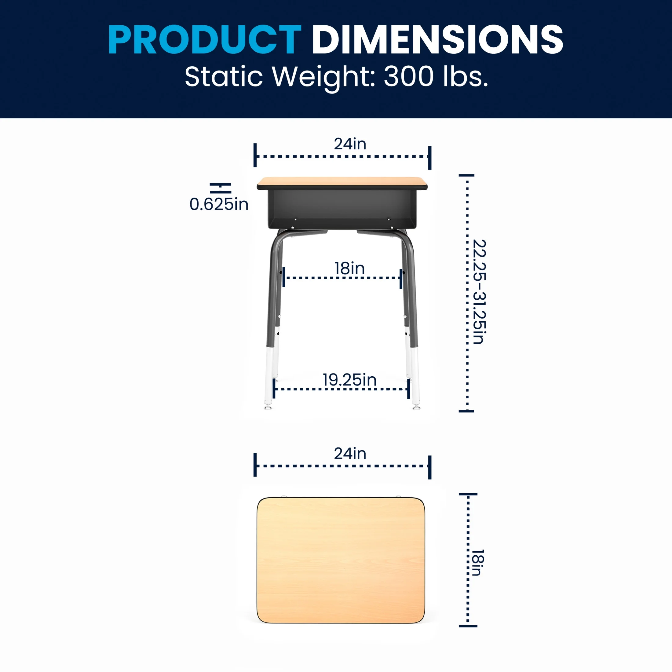 Flash Furniture Billie Open Front Adjustable Student Desk with Metal Book Box, Natural/Black Great for elementary through high school classrooms or home offices Height-adjustable legs to fit the needs of each student Adjustable nylon glides prevent the desk from wobbling on uneven surfaces Heavy-duty metal book box provides ample storage space 0.625″ thick high-pressure laminate top with a black lacquer edge treatment Crisscross tubular frame attaches to the book box at 5 points Overall size: 24″ W x 18″ D x 22.25-31.25″ H CRISSCROSS TUBULAR FRAME: Specialty crafted, one-of-a-kind crisscross tubular frame attaches to the book box at 5 points to ensure maximum durability; measures 24″ W x 18″ D x 22.25-31.25″ H with a 20.5″ W x 15″ D x 5.25″ metal book box