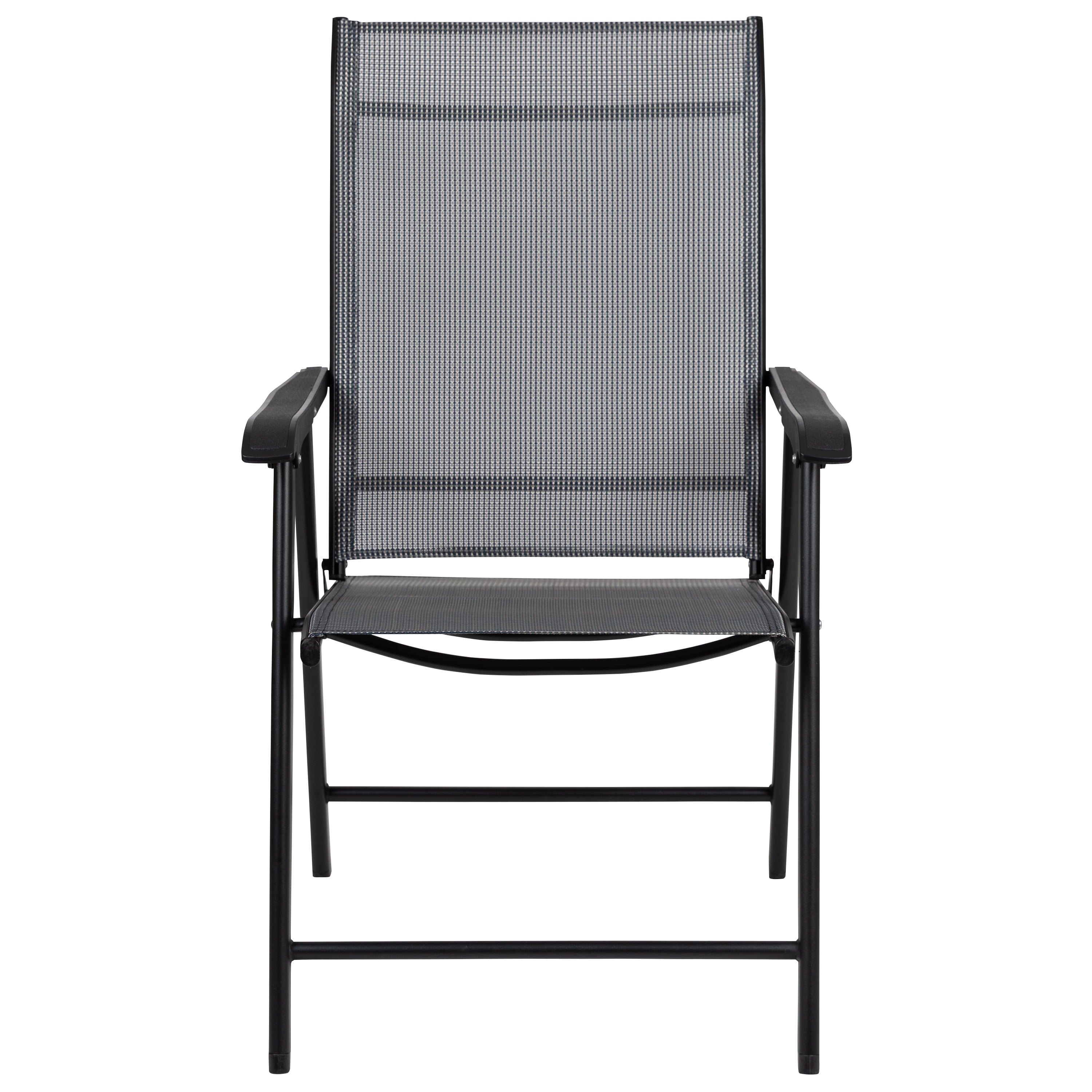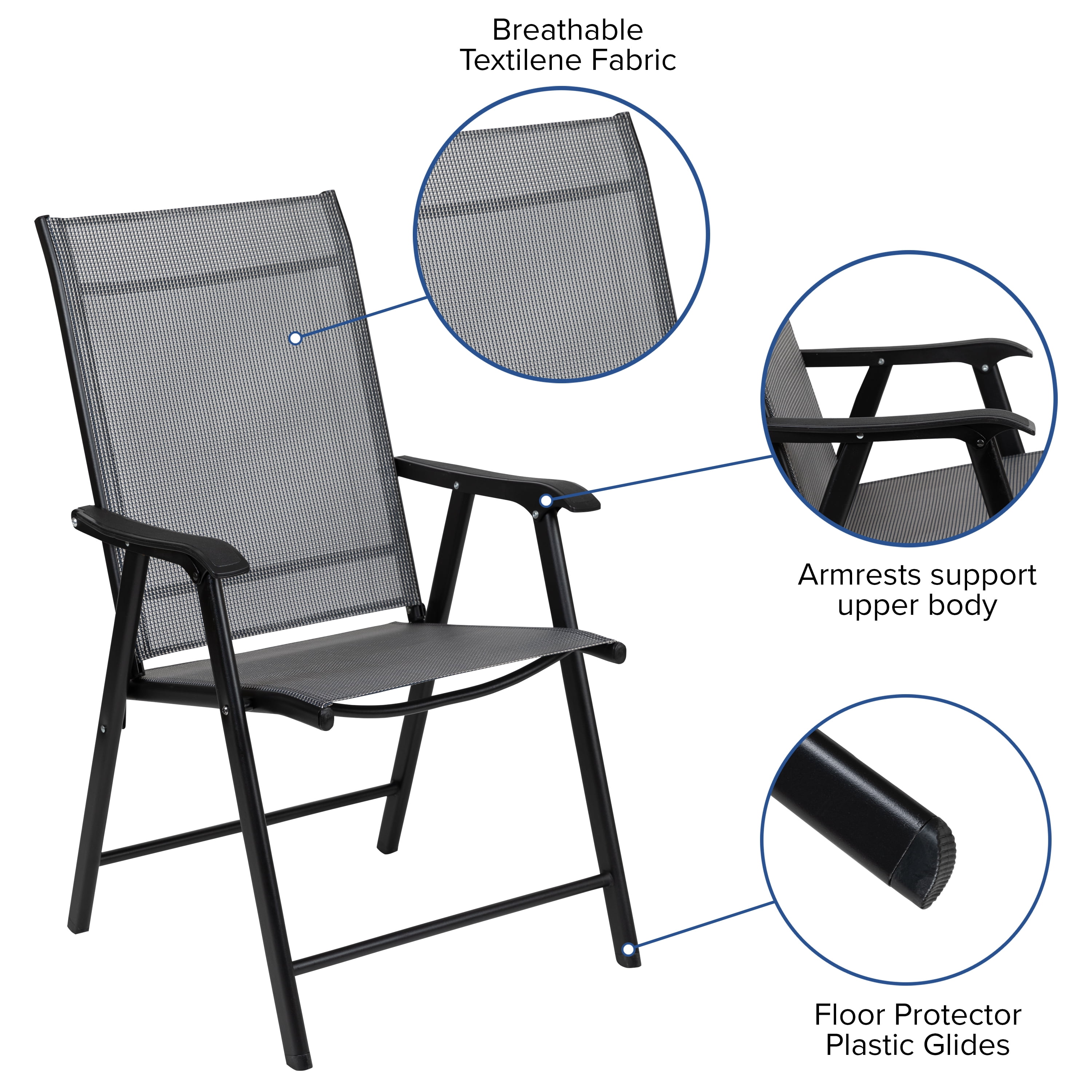 Set of 2 Modern Patio Folding Chairs 352 lb. Weight Capacity Textilene Fabric Upholstery allows air to circulate to keep you cool Armrests provide support to upper body 19 Gauge Black Powder Coated Steel Frame Folded Size: 22″W x 34″D x 5.5″H Ships Fully Assembled for quick setup Designed for Commercial or Residential Use Portable folding chair to take to sporting events and camping Comfortable sling chair for patio, deck, pool or garden