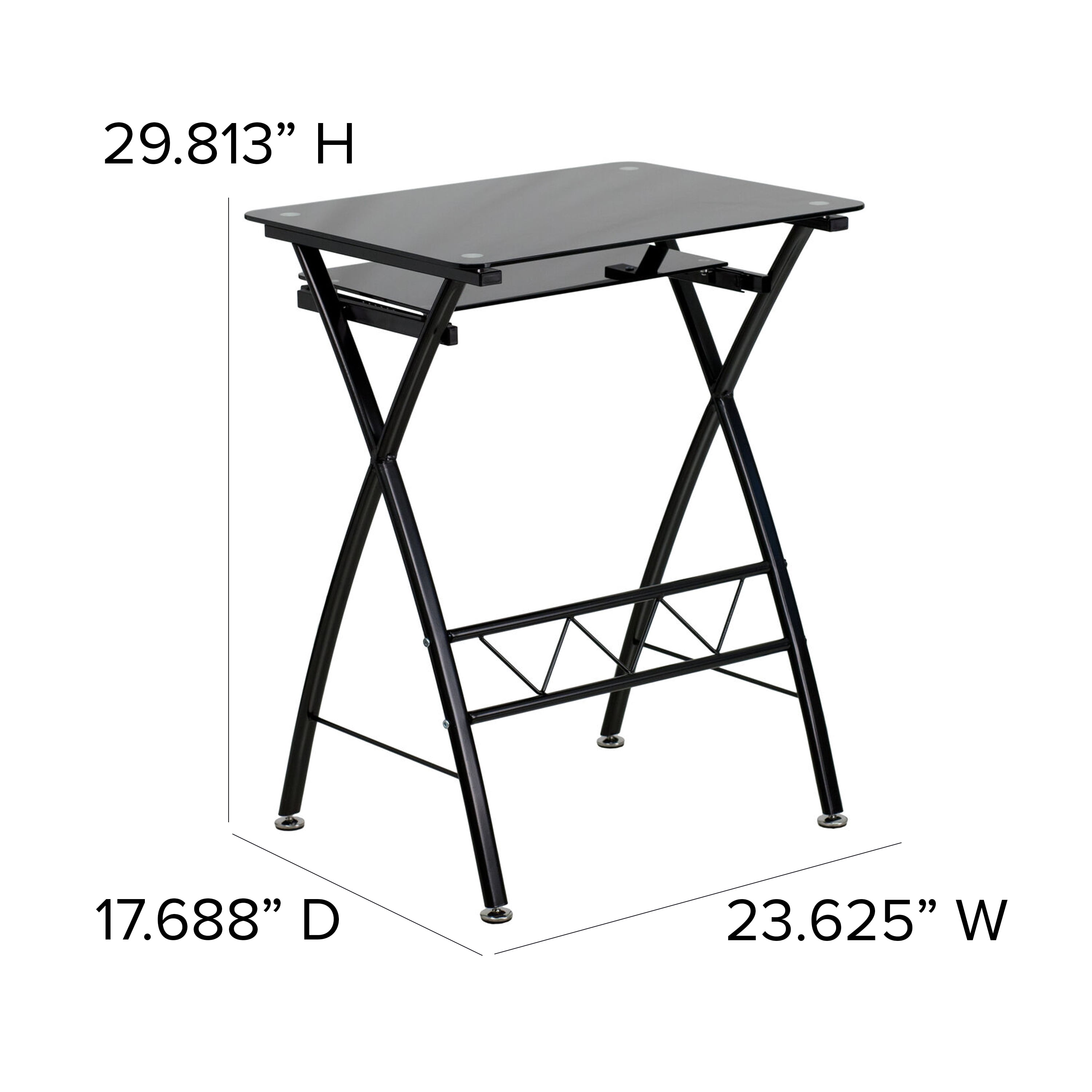 Contemporary Style Computer Desk Black Tempered Glass Surface 6mm Thick Glass Sliding Keyboard Tray: 17.25″W x 11″D x 5mm Thick Glass Crisscross Leg Design Black Powder Coated Frame Finish Self-Leveling Floor Glides