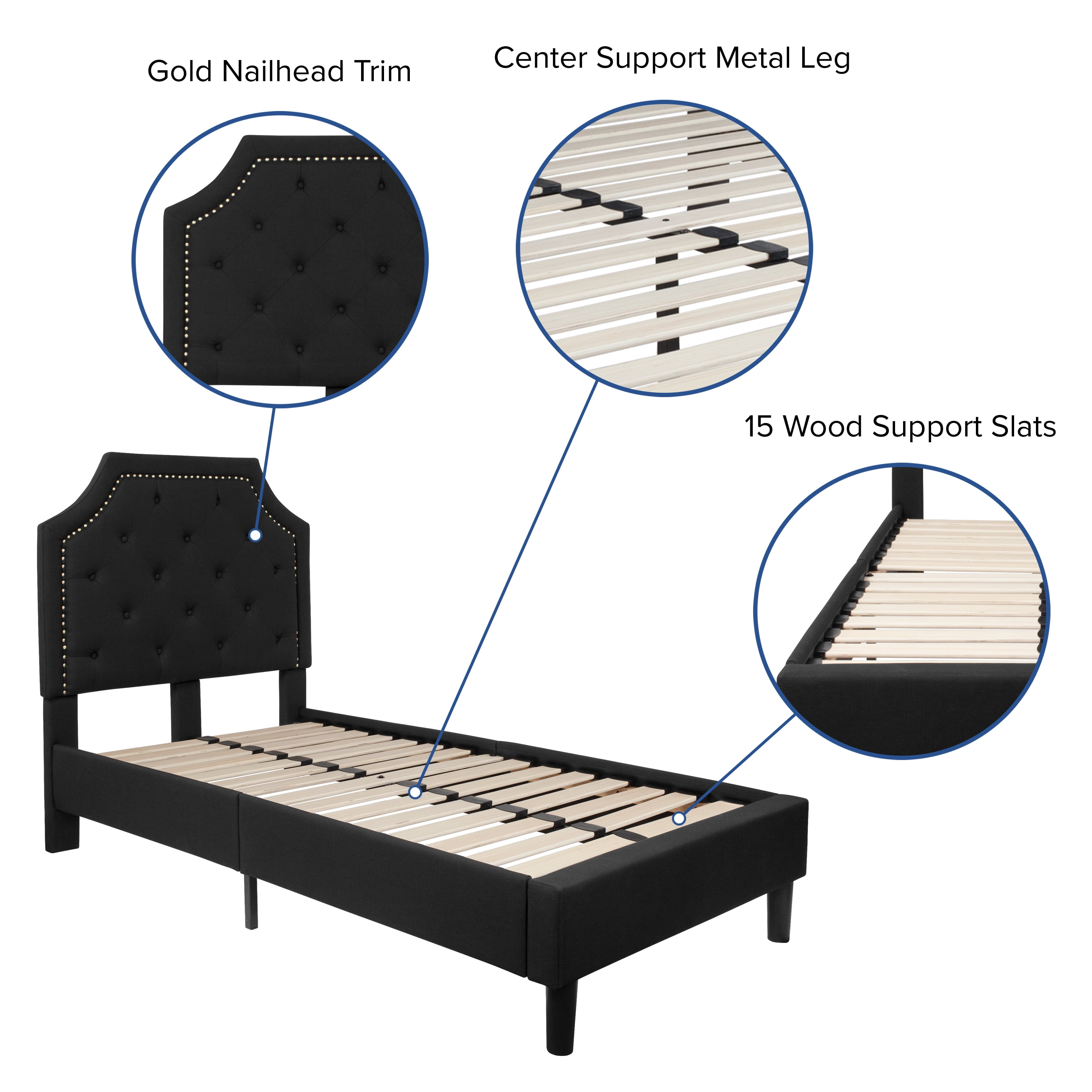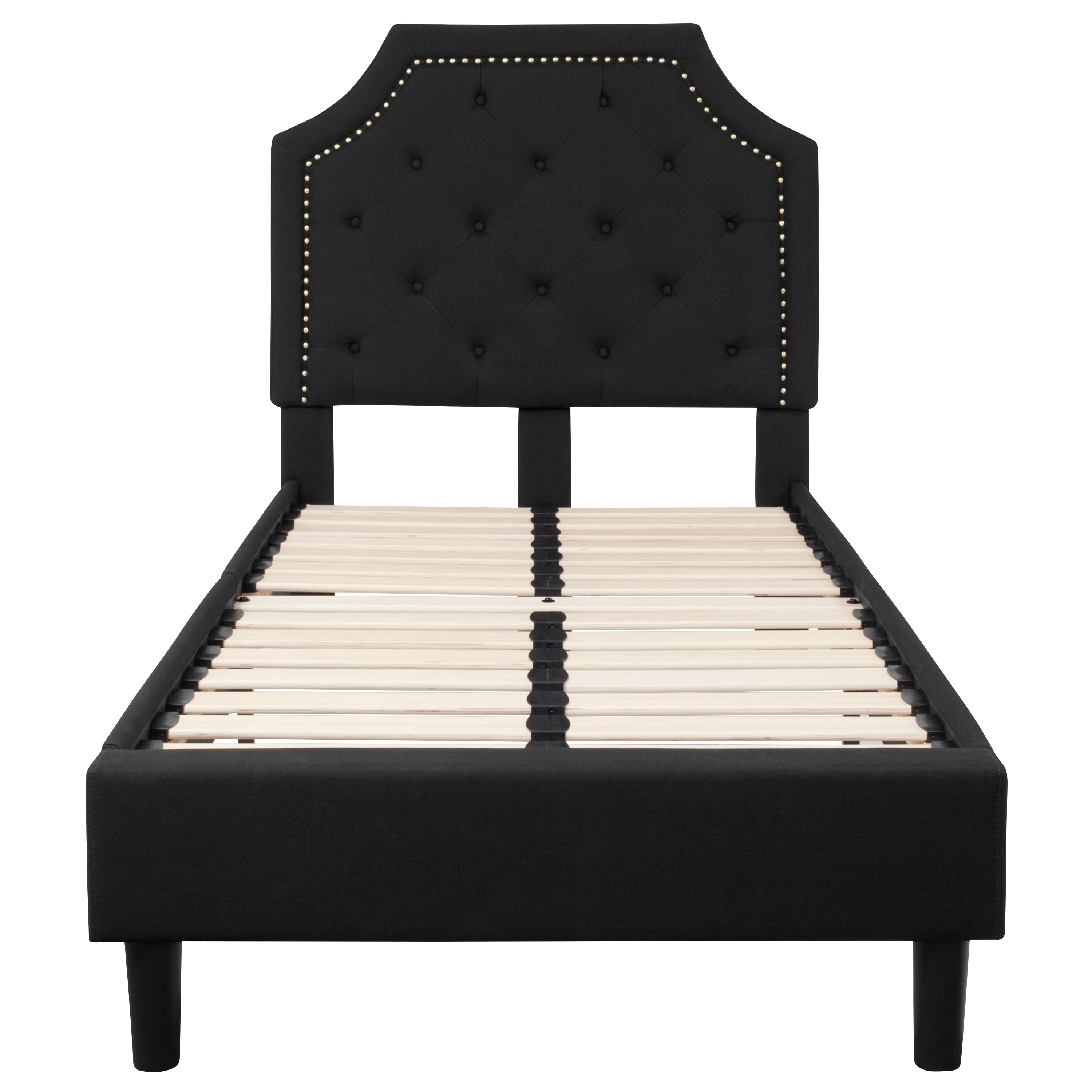 Flash Furniture Brighton Twin Size Tufted Upholstered Platform Bed in Black Fabric Platform Bed Arched Headboard Black Fabric Upholstery Button Tufted Gold Nailhead Trim 15 Wood Support Slats Center Support Metal Leg Raised Rounded Legs Headboard Size: 44.5″W x 2.5″D x 31″H Slat to Floor Height: 13″ Underbed Height: 6″ PRODUCT MEASUREMENTS: Overall Size: 44.5″W x 81″D x 51″H; Headboard Size: 44.5″W x 2.5″D x 31″H; Slat to Floor Height: 13″; Underbed Height: 6″