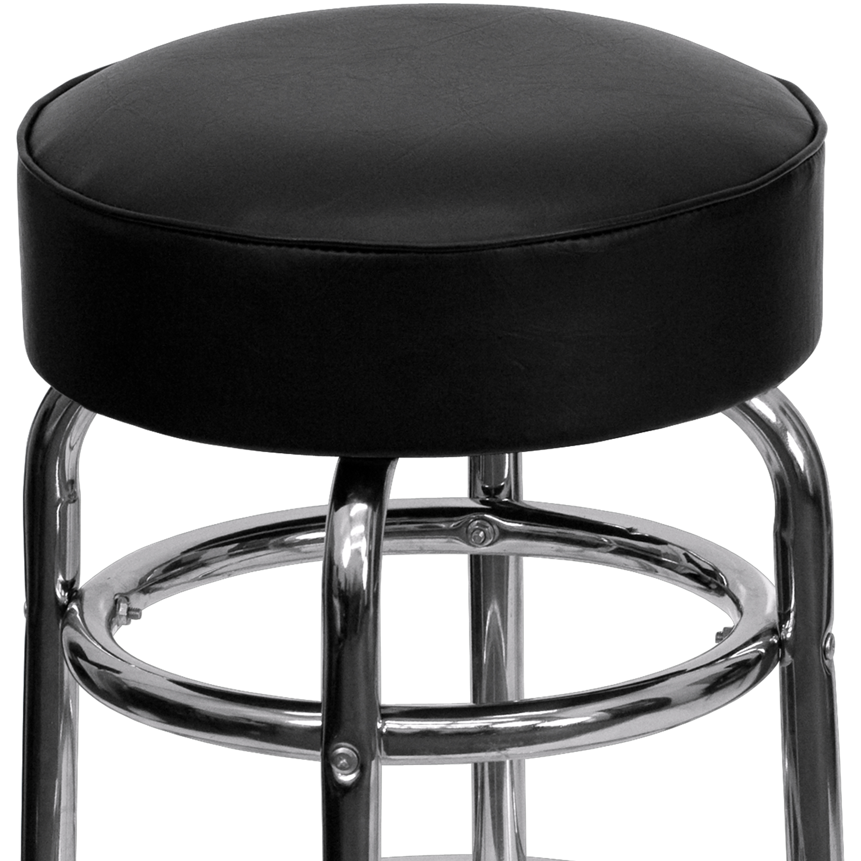 Flash Furniture Bruno 2 Pack Double Ring Chrome Barstool with Black Seat Set of 2 Metal Dining Bar Stools with Footing 500 lb. Weight Capacity Backless Design Black Vinyl Upholstered Swivel Seat with CAL 117 Fire Retardant Foam Rounded Accent Welt 18 Gauge Steel Double Ring Chrome Frame Floor Protector Plastic Glides Designed for Commercial Use; Suitable for Home Use PRODUCT MEASUREMENTS: Overall Size: 20.5″W x 20.5″D x 30.25″H; Seat Size: 14″W x 14″D