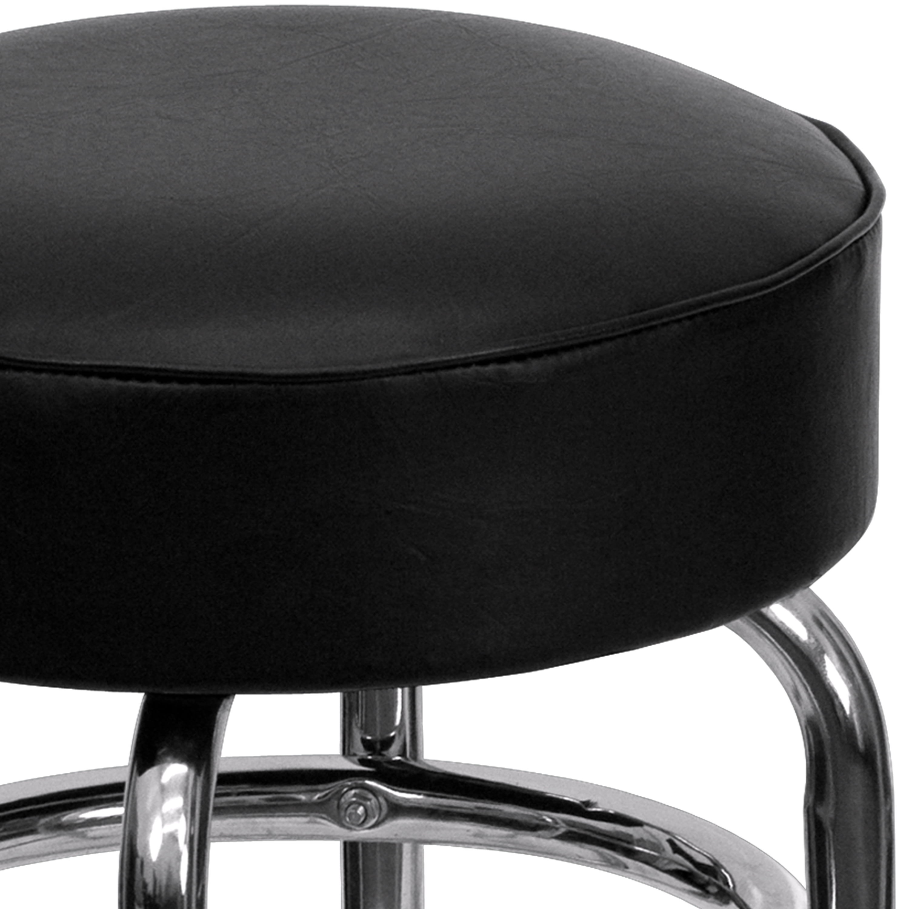 Treat the patrons of your bar, restaurant or pool hall to this superbly designed double ring barstool. The round swivel seat provides easy access and promotes conversation between customers. This commercial grade stool was built to withstand the daily rigors in the hospitality industry, but is still stylish enough for home use. The tubular footrest not only supports your feet, but acts as an additional reinforcement that helps secure the legs. This stool is also easy to clean, upholstered in a durable black vinyl cover. Add this comfortable bar height stool to your kitchen island, pub style dining table or home bar for family and friends to enjoy.