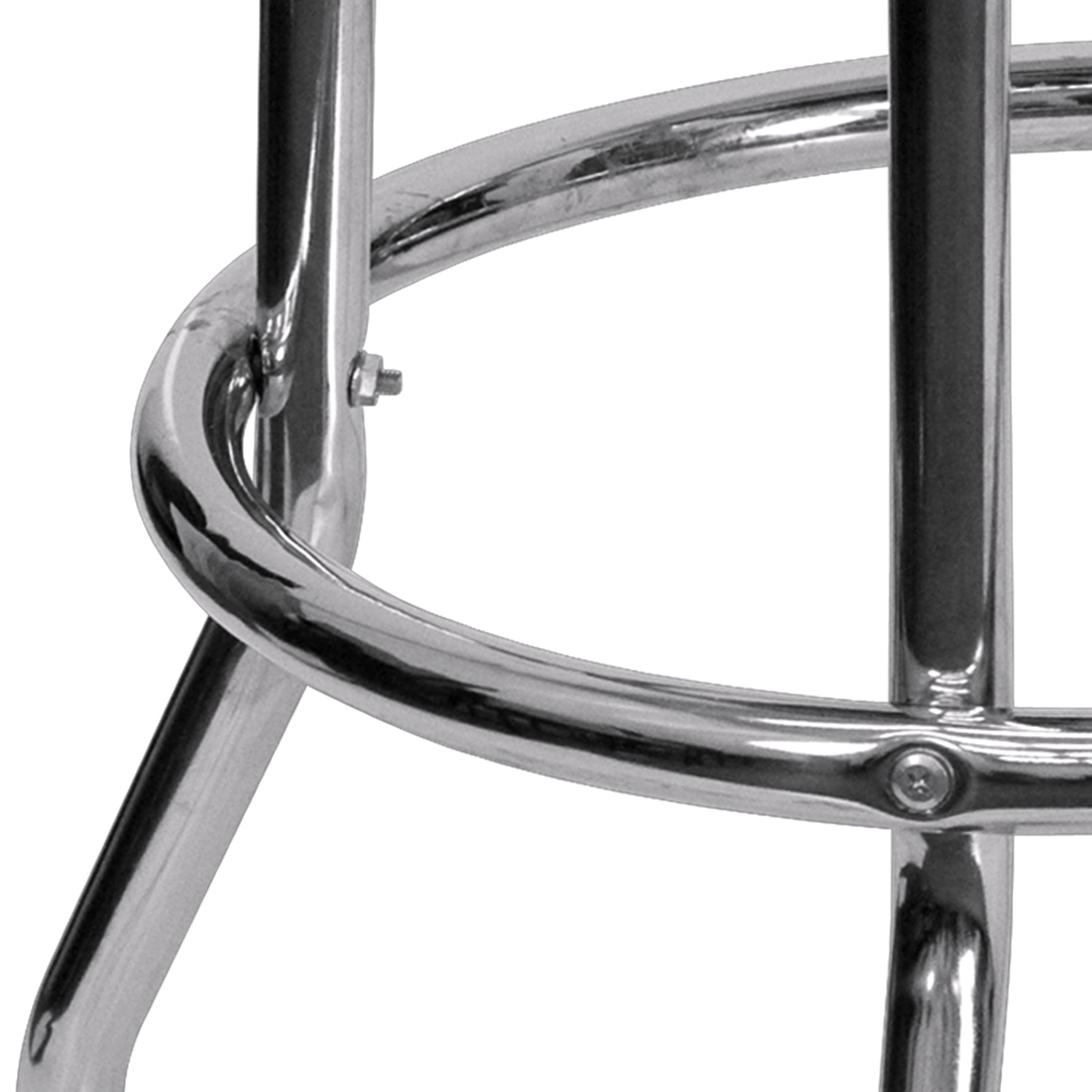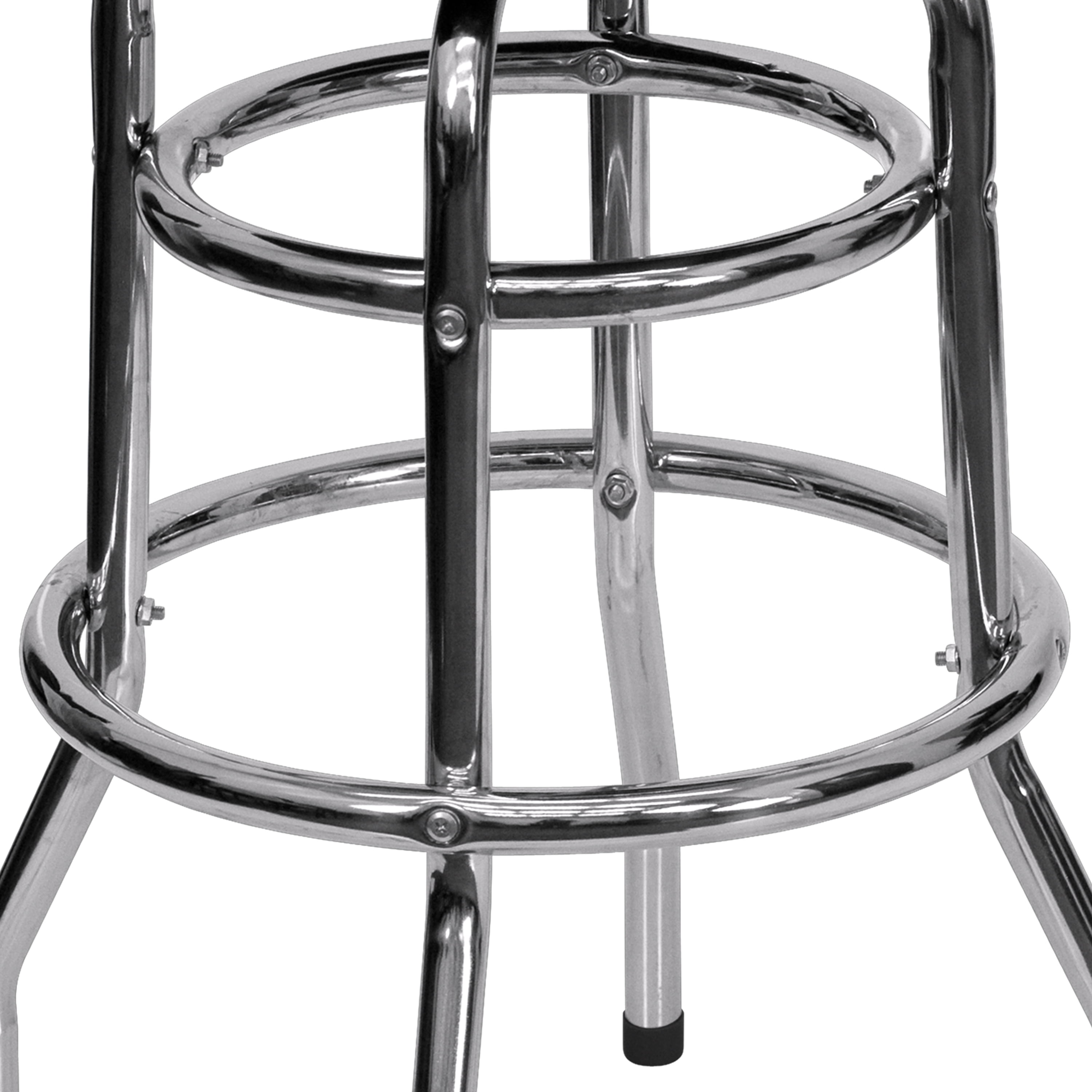 Flash Furniture Bruno Double Ring Chrome Barstool with Red Seat Metal Dining Bar Stool with Footing 500 lb. Weight Capacity Backless Design Red Vinyl Upholstered Swivel Seat with CAL 117 Fire Retardant Foam Rounded Accent Welt 18 Gauge Steel Double Ring Chrome Frame Floor Protector Plastic Glides Designed for Commercial Use; Suitable for Home Use PRODUCT MEASUREMENTS: Overall Size: 20.5″W x 20.5″D x 30.25″H; Seat Size: 14″W x 14″D