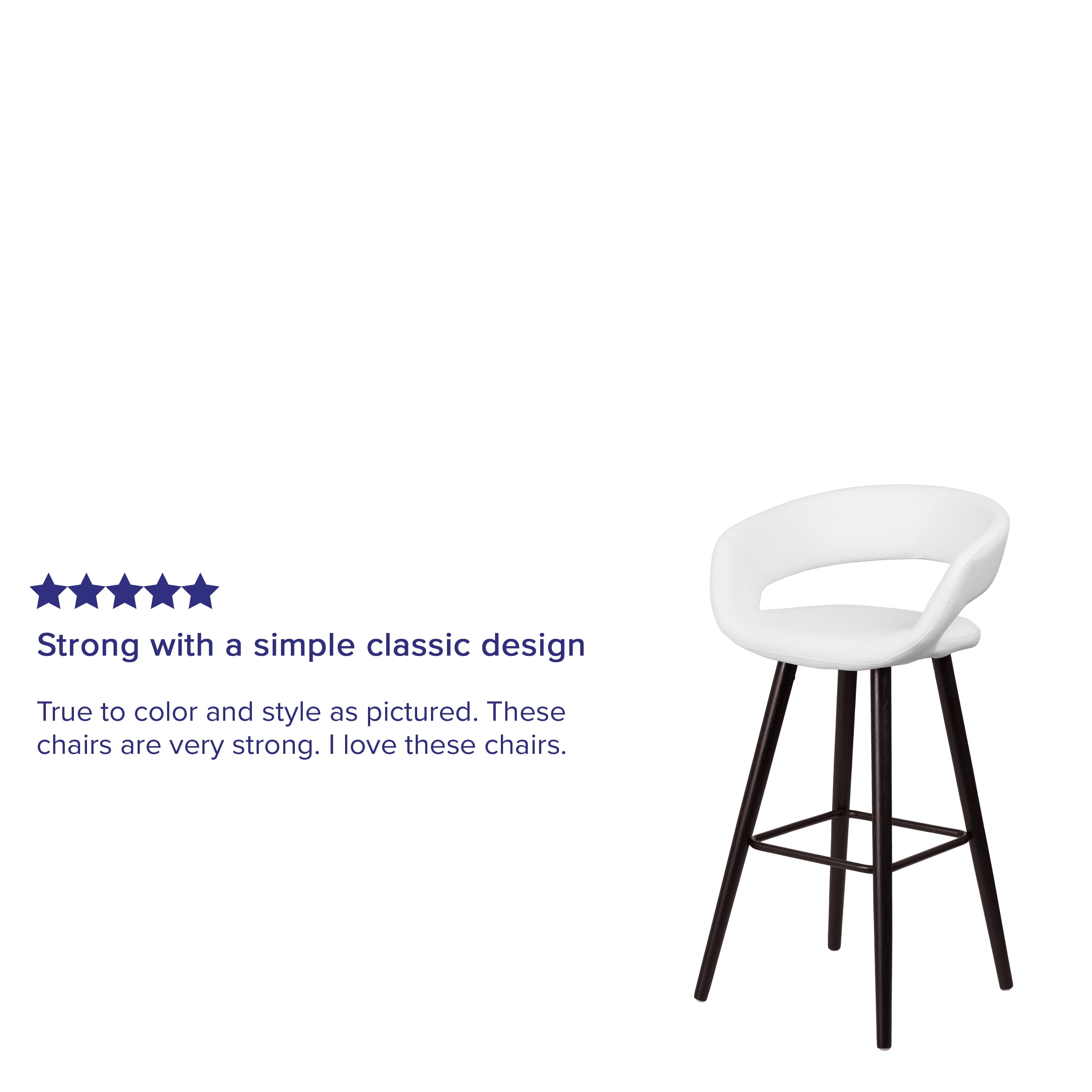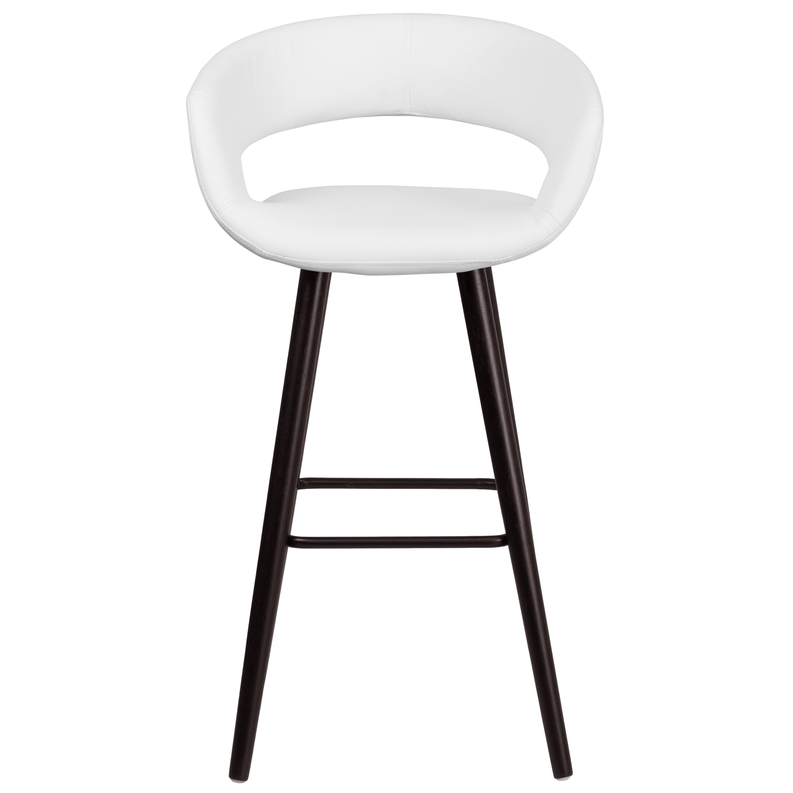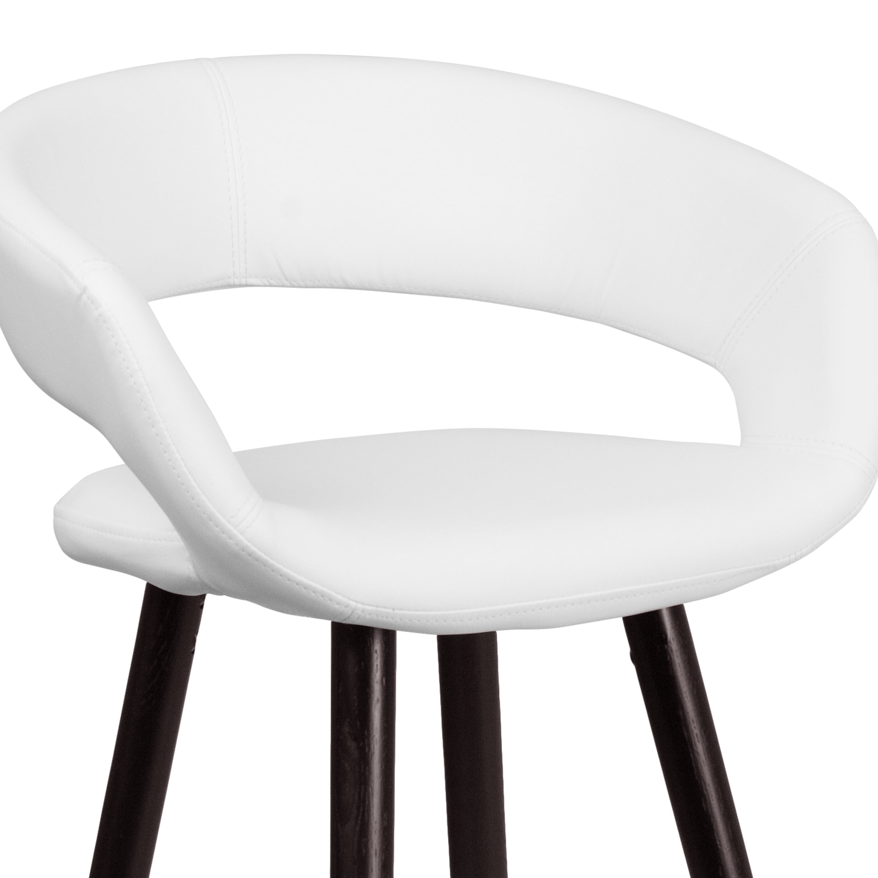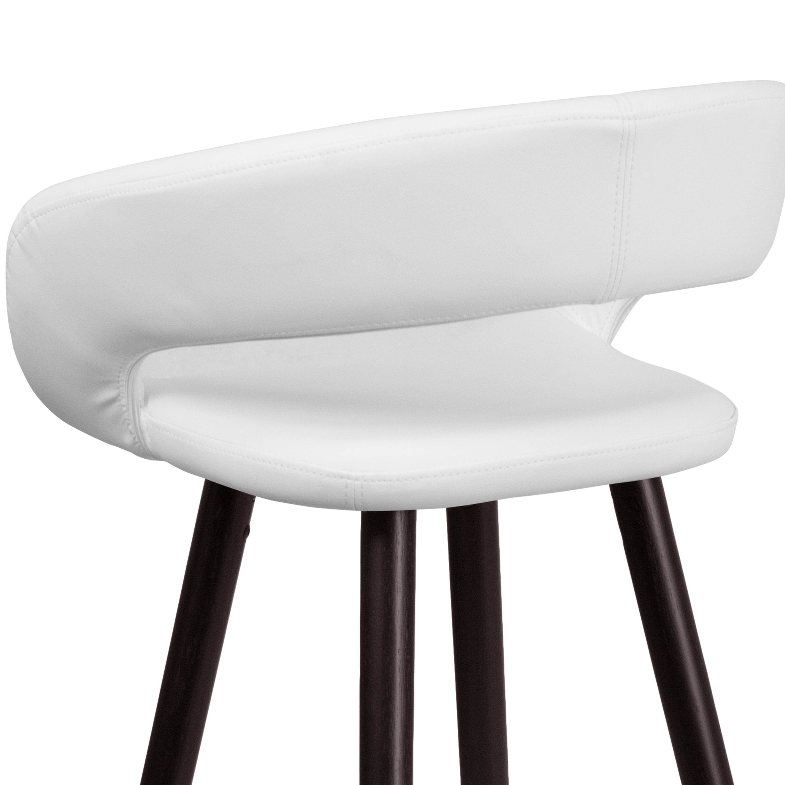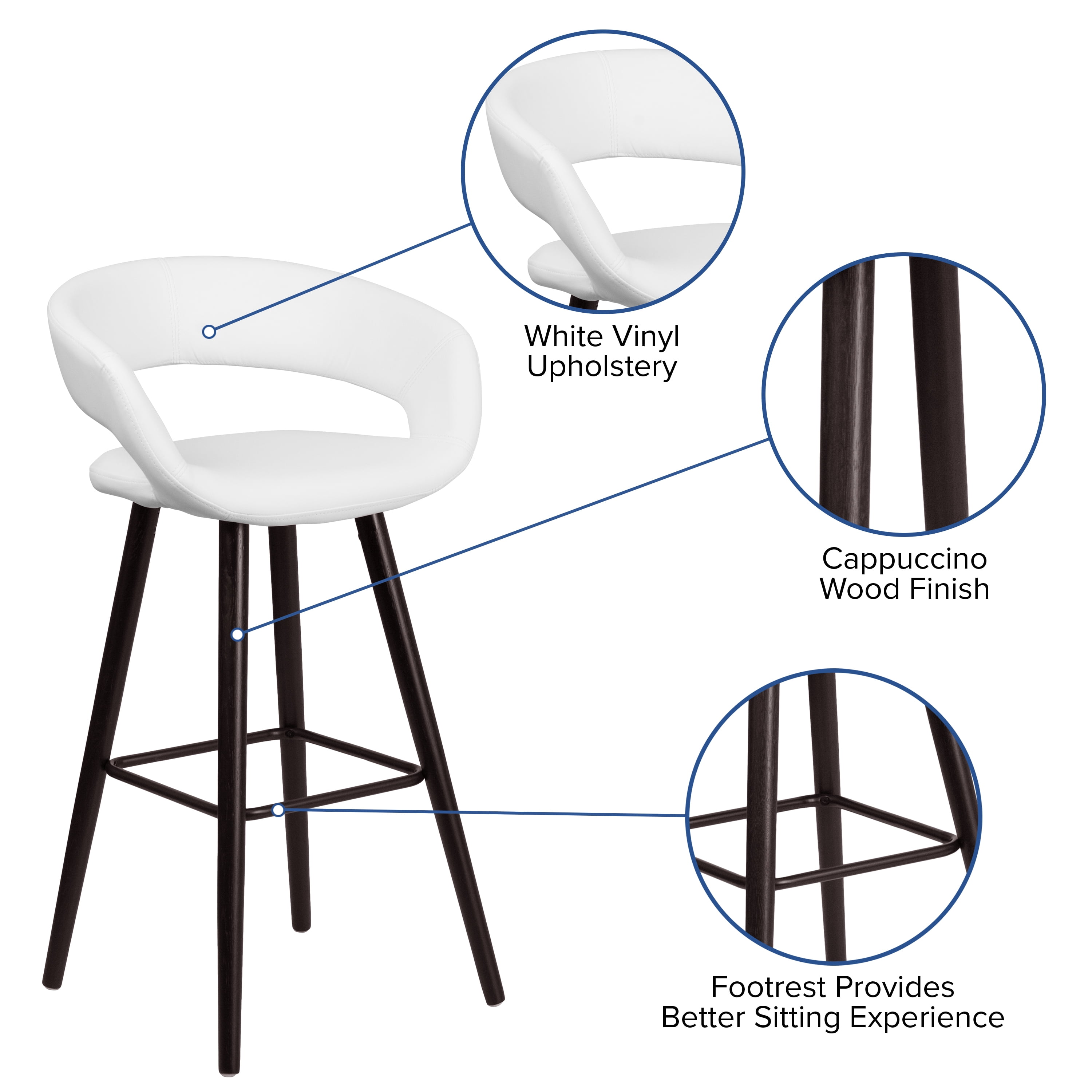Contemporary Wood Bar Stool Rounded Low-Back Design White Vinyl Upholstery Padded Seat with CAL 117 Fire Retardant Foam Seat Size: 16″W x 15.5″D Footrest provides better sitting experience Cappuccino Wood Finish Floor Glides prevent scratches and provide smooth gliding Designed for Residential Use Only