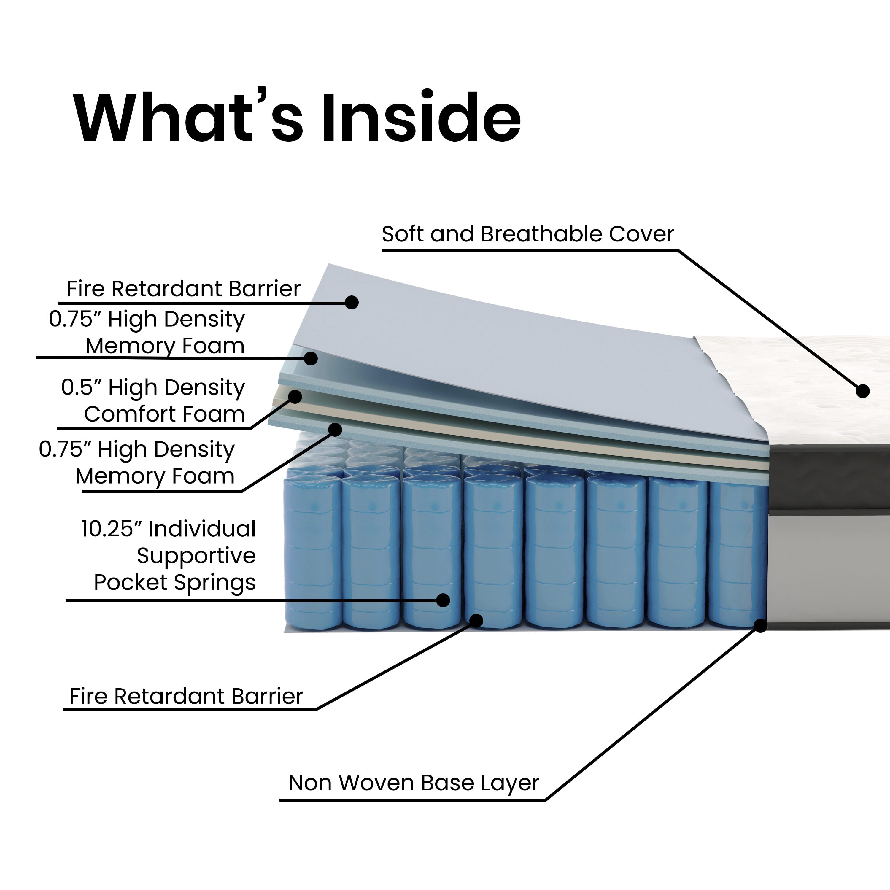 A great night’s sleep is essential to maintain both your physical and mental well-being so choosing the best twin mattress is paramount. This hybrid twin mattress, offering pocket spring support with the added benefit of luxurious memory foam layering, will give you the firmness you need with the softness you crave. The foam is CertiPUR-US Certified so it’s free from heavy metals, phthalates, BPDE, formaldehyde and has reduced VOCs so you can rest easy knowing your indoor air quality won’t be compromised. Extra cushioning on this twin bed mattress cradles your body in every position, keeping your back, neck and shoulders more comfortable throughout the night while also being ultra-supportive to provide the restful sleep you and your family deserve. Say goodbye to morning joint stiffness and wakeful nights. Individually wrapped pocket spring coils reduce motion transfer to help you stay asleep while minimizing pressure points and back pain. This twin-size memory foam mattress is compatible with trundle beds, platform beds and adjustable bed frames, when using with a standard bed frame a box spring or other foundation is required. Arriving fully compressed and boxed, this twin bed in a box can be easily moved where you need it. The top-quality construction of this memory foam padded mattress ensures long-lasting use and its integrated handles make transportation effortless. Perfect for your first house or apartment, or converting your child to a “big kid” bed, this twin size bed mattress achieves the ideal blend of comfort, support and durability that will definitely upgrade your sleeping experience.