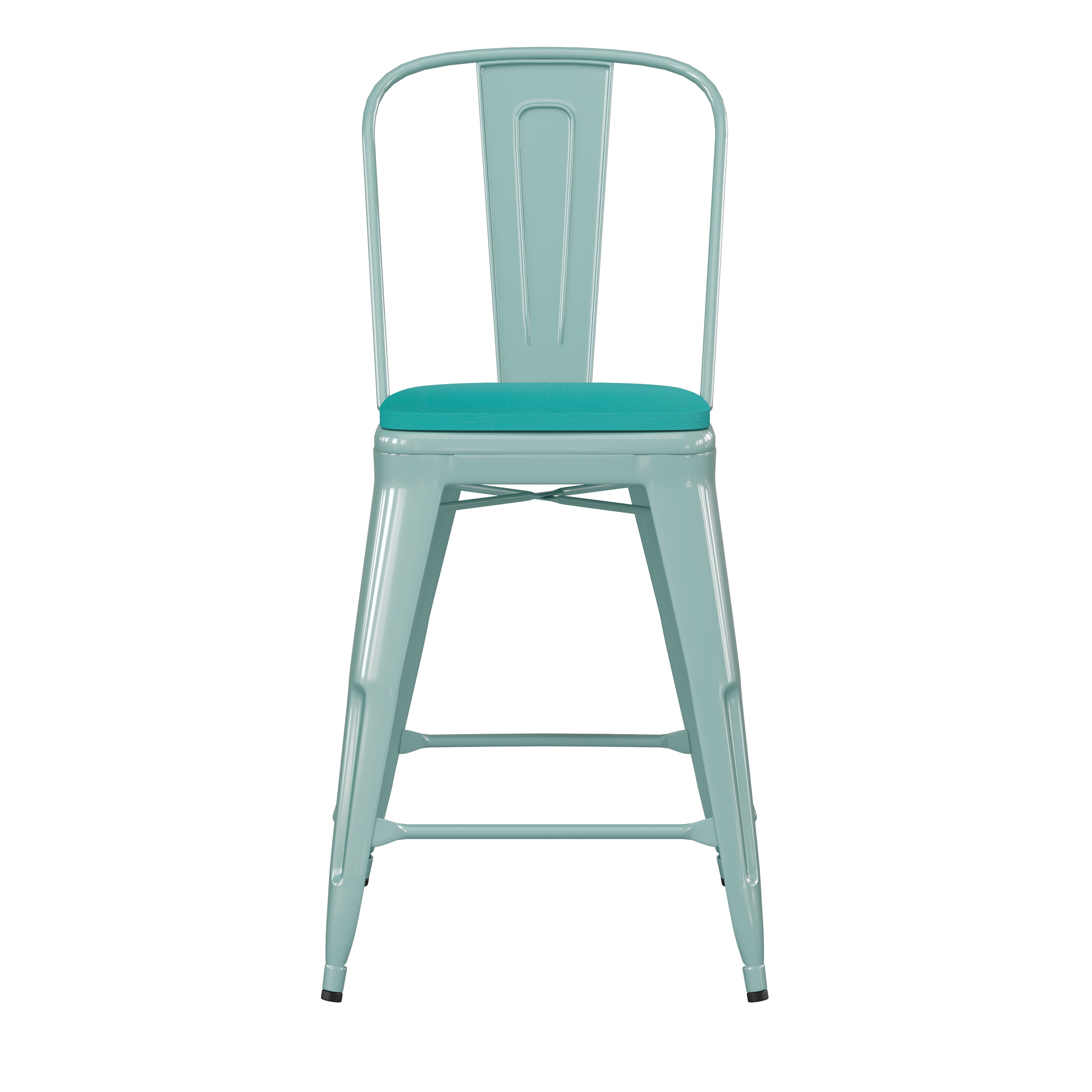 Flash Furniture Carly Commercial Grade 24″ High Mint Green Metal Indoor-Outdoor Counter Height Stool with Back with Mint Green Poly Resin Wood Seat Modern Colorful Counter Stool with Poly Resin Seat for Commercial or Residential Use Distressed Mint Green Steel Frame Mint Green Polystyrene Seat Will Not Rot, Chip, or Peel Ergonomic Curved Back with Vertical Slat Holds up to 500 LBS. Static Weight Clean with Water and a Neutral Detergent Assembles in 10 Minutes or Less Designed for Indoor or Outdoor Use PRODUCT MEASUREMENTS: Chair Size: 17.75″W x 22″D x 40.25″H; Seat Size: 14″W x 14″D x 24″H; Back Size: 17.75″W x 17.25″H | Seat Size: 13.75″W x 14.25″D x .75″H