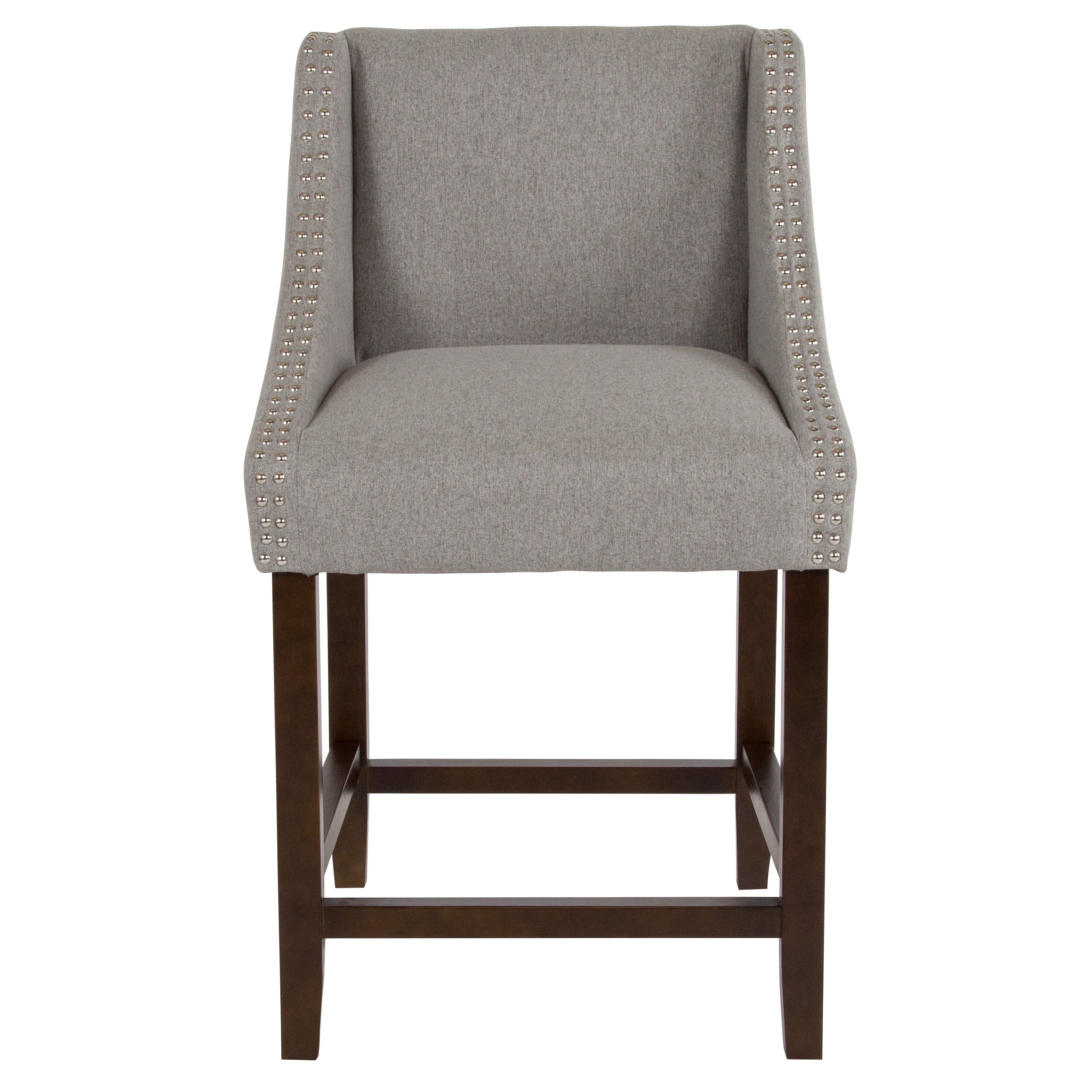 Bring warmth and comfort to your home while adding some world class elegance with this classically sophisticated light gray counter stool. Have breakfast at your kitchen island or hang out with friends around the dining room table in style. Boasting durable fabric upholstery paired with decorative nail head trim, this counter height stool lends a touch of old world style and comfort to any environment. When hosting guests the last thing you want to worry about is a wobbly chair. The solid wood frame and legs provide a sturdy base for this dining stool that will hold up to 300 lbs weight capacity. An integrated footrest gives your feet a comfortable place to rest and relieves pressure from your legs. The gently curving arms add a touch of whimsy to this upholstered stool and the deep seat, featuring CAL 117 fire retardant foam, is an invitation to lounge, relax and enjoy the atmosphere. Enjoy the comforts of this full back stool anywhere around the home. Spills or soil can be quickly cleaned with water and a neutral detergent. To ensure smooth movement and protection of hard flooring surfaces, glides have been added.