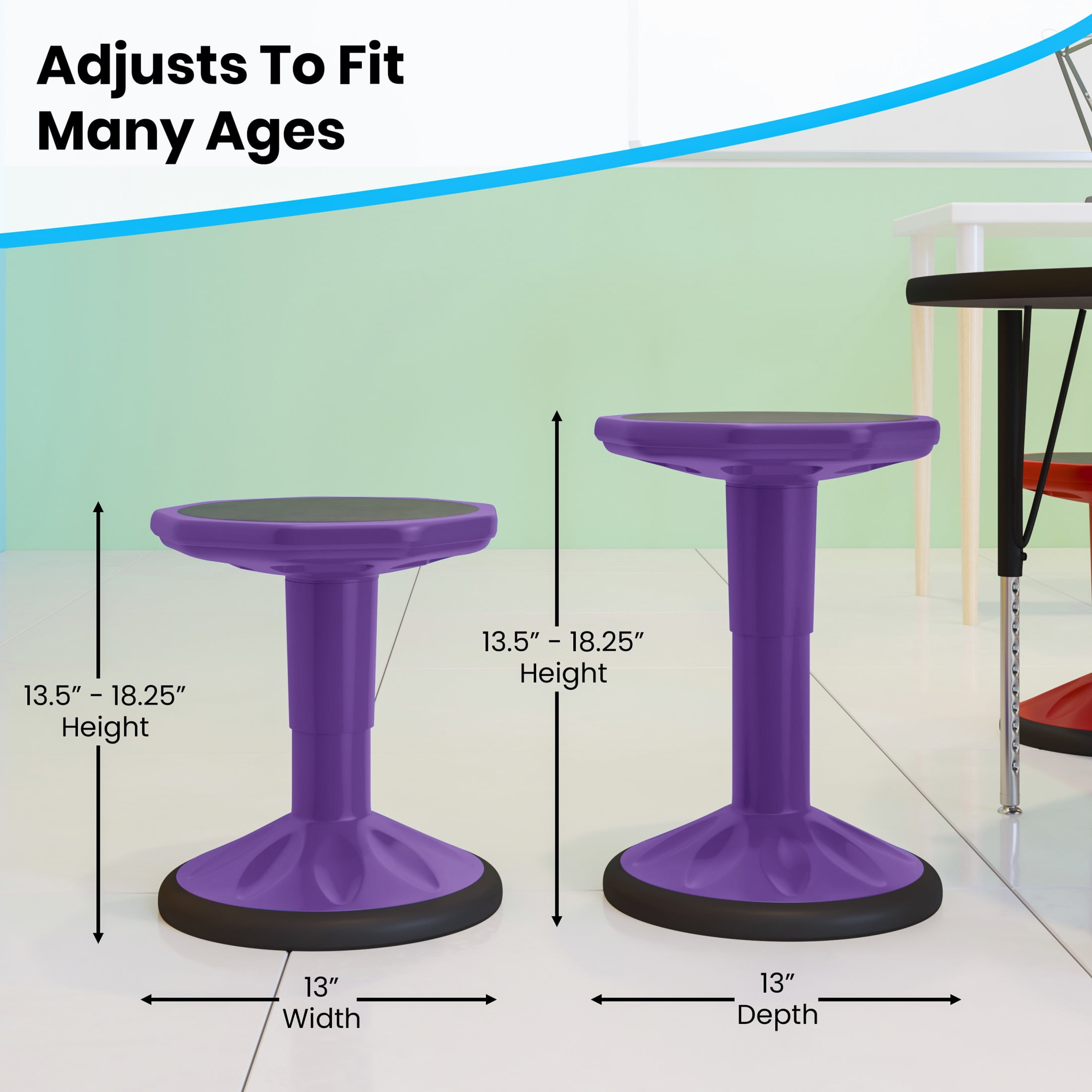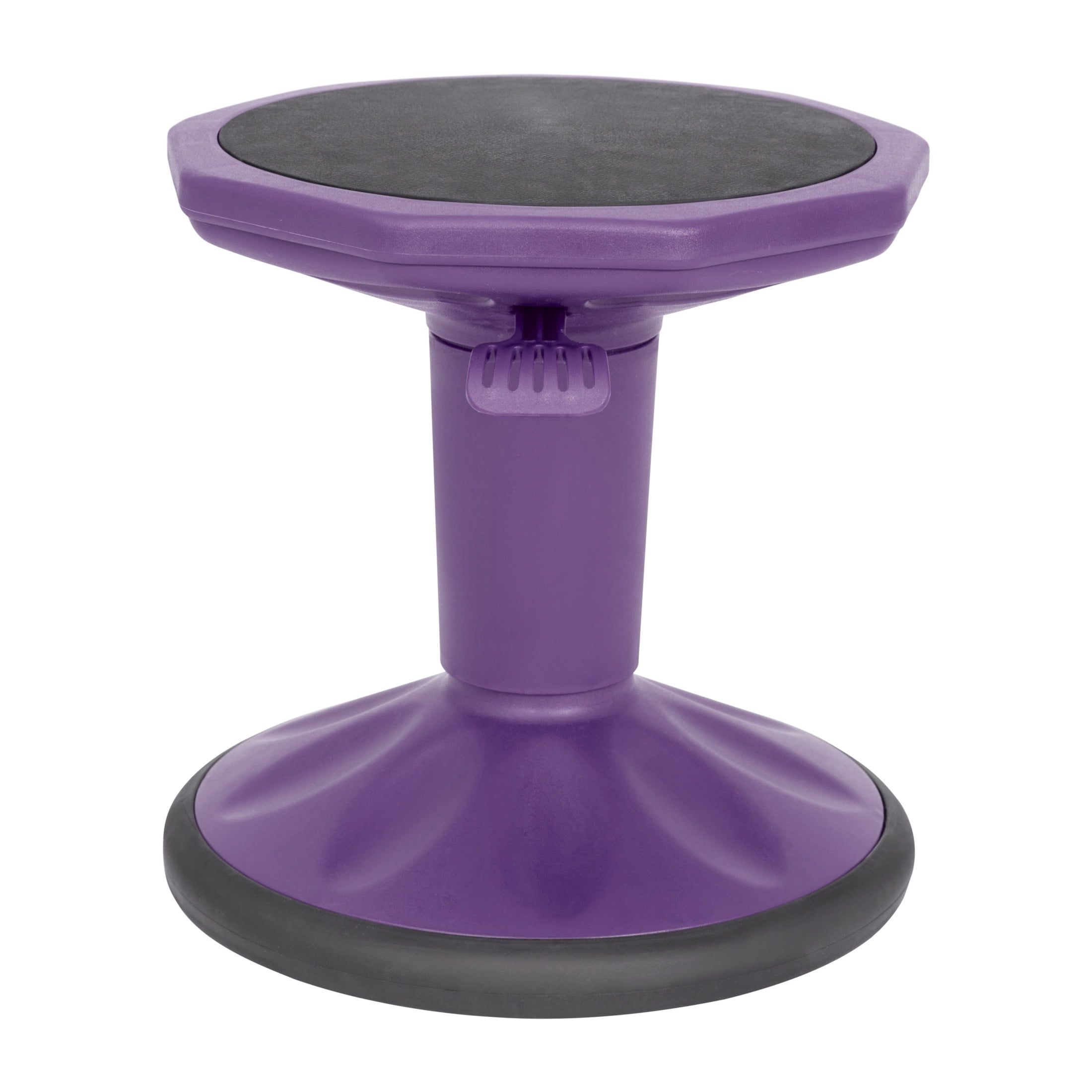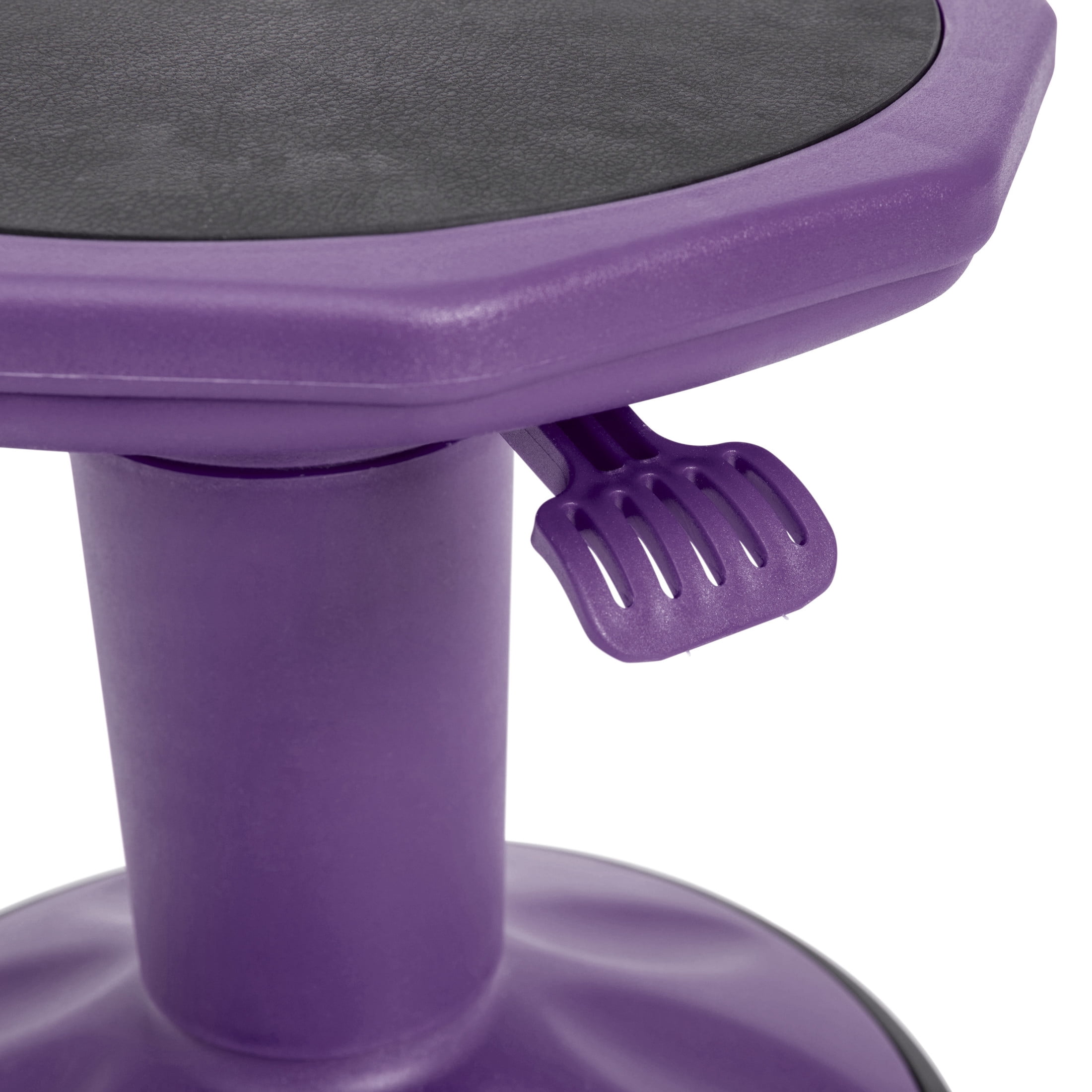 Flash Furniture Carter Adjustable Kids Wobble Stool, Purple Commercial Grade Adjustable Height Kids Mobile Active Learning Stool Purple Polypropylene Frame with Built-In Handles Pneumatic Seat Height Adjustment from 14 To 18 Inches High 360° Swivel and 10 Degree Tilt Engages Core Muscles, Promotes Good Posture, Aids Concentration Rubberized Seat and Non-Slip Bottom for Safety Holds up to 225 LBS. Static Weight Capacity Recommended for Ages 5 and Older No Assembly Required Collaborative learning stool ideal for classrooms, daycares, pediatrician’s offices, or home use PRODUCT MEASUREMENTS: Overall Size: 13″W x 13″D x 13.5-18.25″H; Seat Size: 12.5″W x 12.5″D x 13.65-18.25″H; No Assembly Required