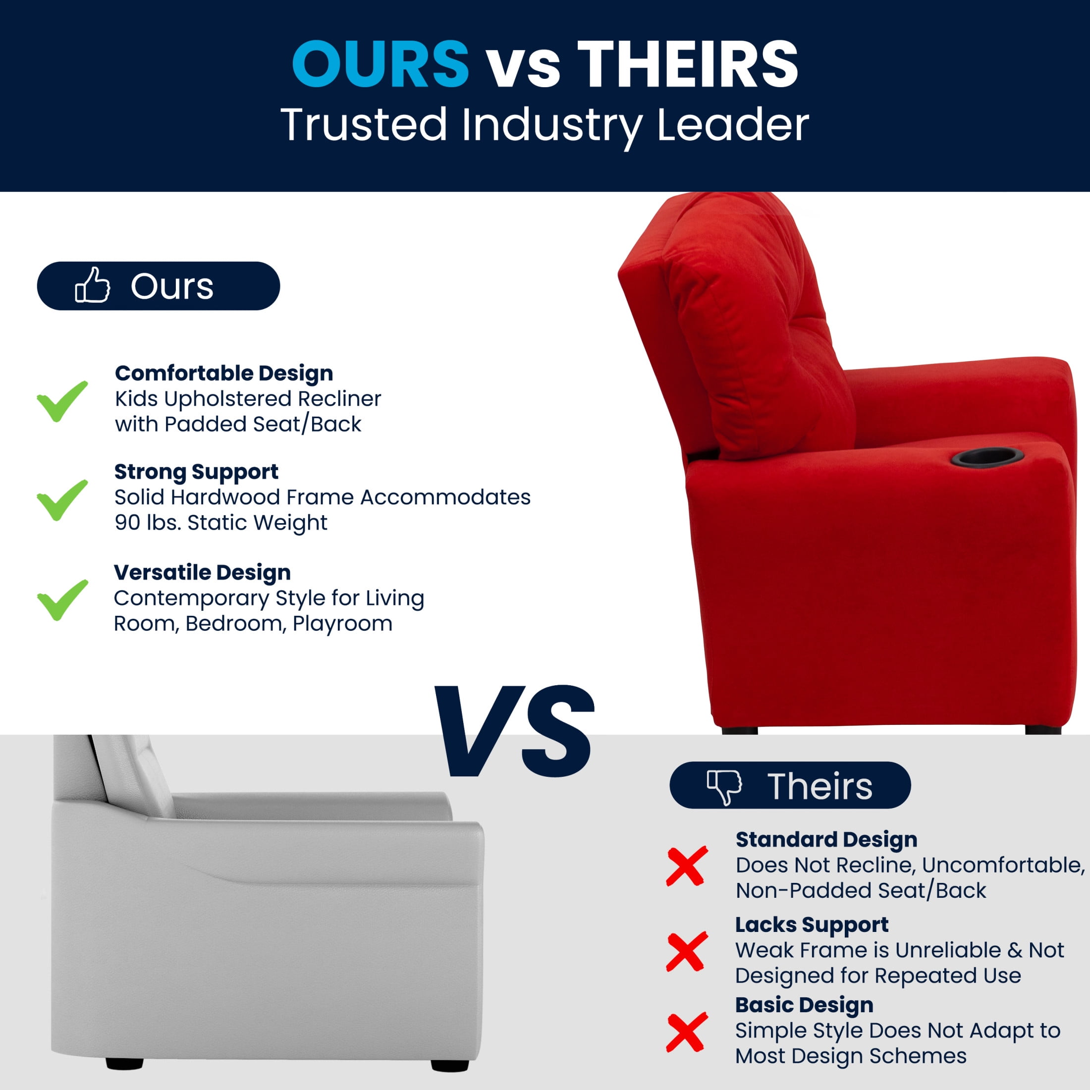 Flash Furniture Chandler Contemporary Red Microfiber Kids Recliner with Cup Holder Kids Recliner – Lounge and Playroom Chair Red Microfiber Upholstery Plush Back and Seat padded with CAL 117 fire retardant foam Cup Holder Armrest to hold drinks, snacks or pet treats Safety Feature: will not recline unless child is in seated position and pulls ottoman 1″ out and then reclines Wall Clearance: 6″ Solid Hardwood Frame Construction holds up to 90 lbs weight capacity Raised Black Plastic Feet for easy floor cleaning Spot Clean with Water and Neutral Detergent This product cannot ship to Canada EFFICIENT SIZE: Recliner measures 24.5″W x 25-39″D x 28″H with a 13.75″W x 12″D x 14.5″H seat size, and 22″W x 17″H back size for the perfect fit that adds a touch of contemporary style to your home