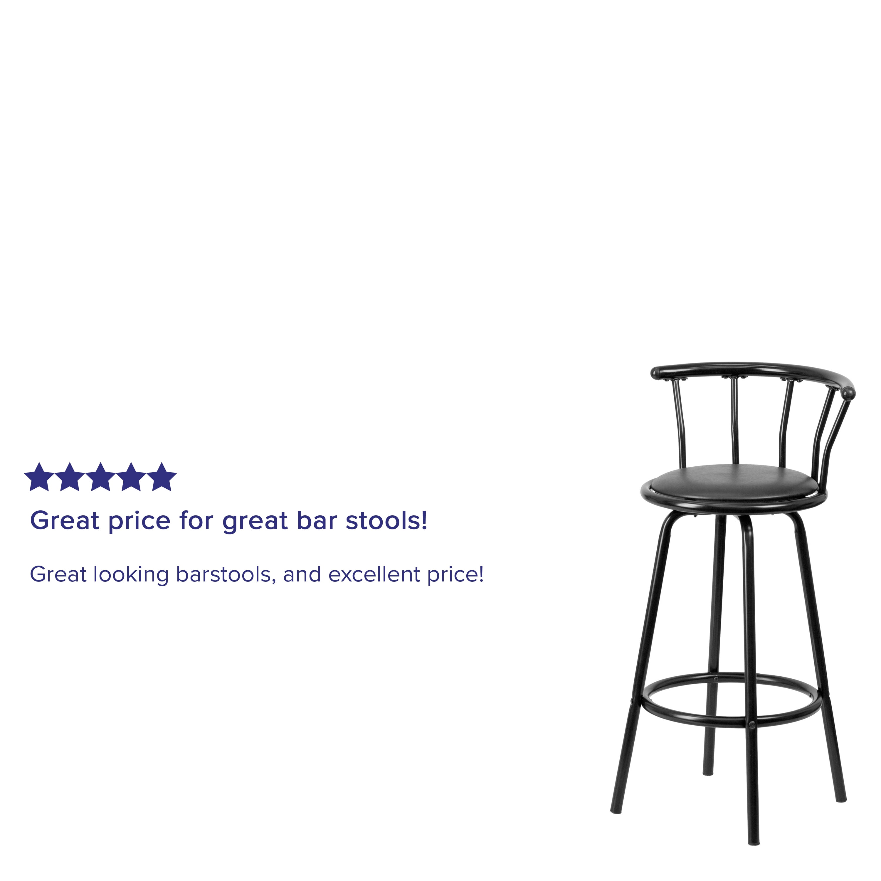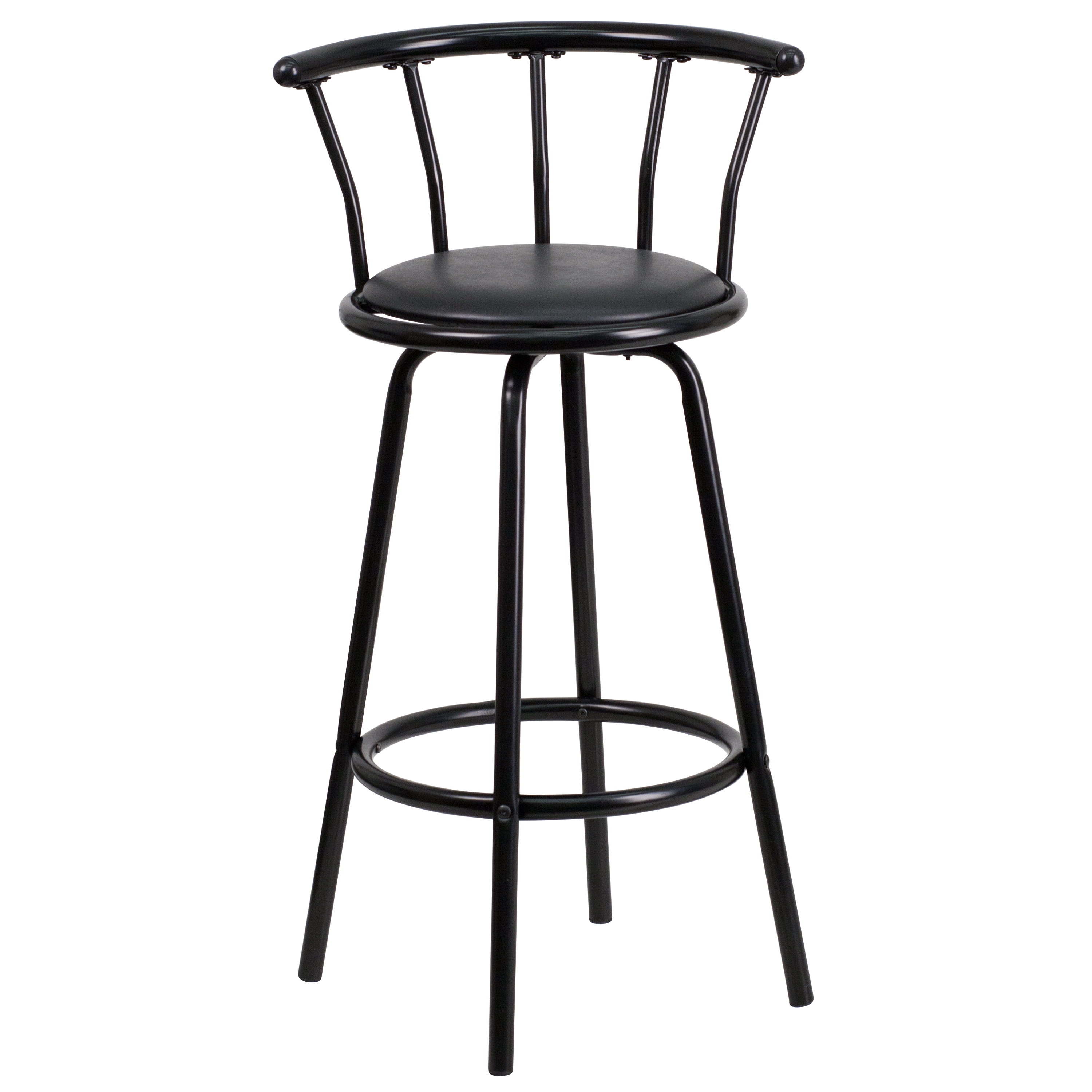 Flash Furniture Charla Crown Back Black Metal Barstool with Black Vinyl Swivel Seat Transitional Style Bar Stool with Crown Back Black Vinyl Upholstery is easy to clean CAL 117 Fire Retardant Foam 16″ Round 360 Degree Swivel Seat Footrest provides better sitting experience Glossy Black Powder Coated Frame Finish Floor Protector Glides Designed for Residential Use Only PRODUCT MEASUREMENTS: Overall Size: 21″W x 17″D x 38.5″H; Seat Size: 16″W x 16″D x 30″H; Back Size: 21″W x 9″H